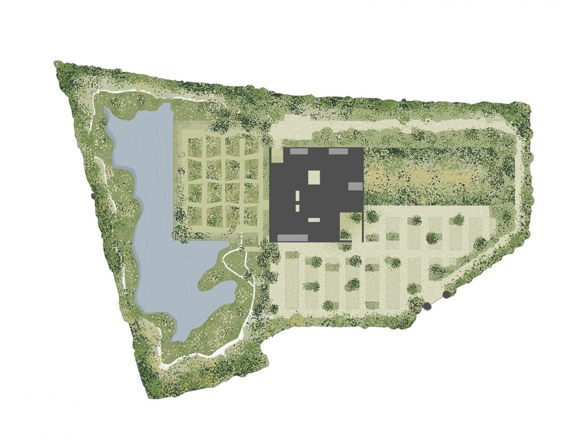In order to disengage from the surrounding commercial estates, the site was transformed with physical and visual barriers. Trees and shrubs line the perimeter while the crematorium is situated in the middle, with a footprint of 74 by 74 meters. The surrounding greenery is envisioned as an extension of the crematorium space and is an important part of the funeral ceremony.