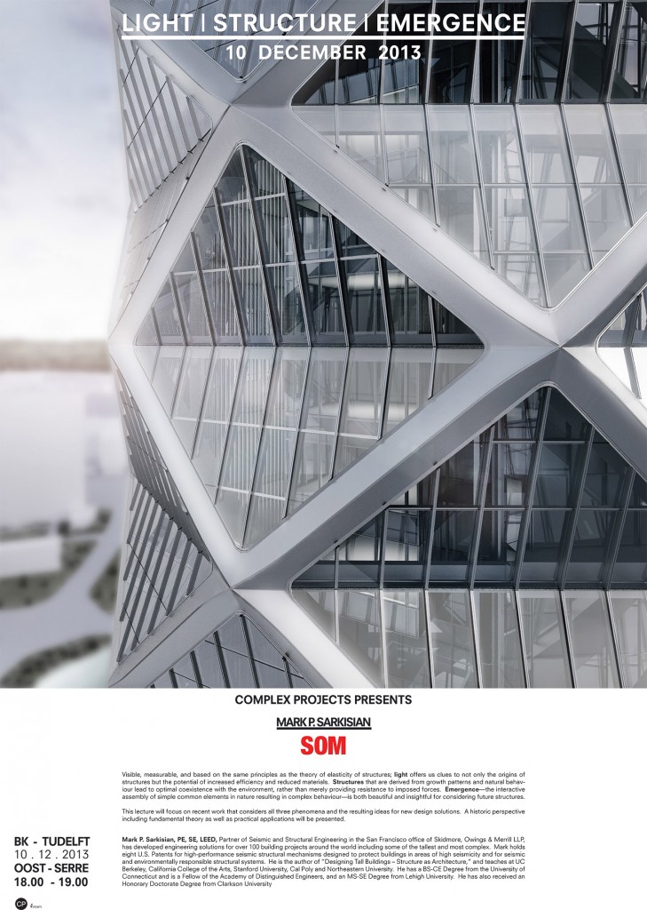 Mark P.Sarkisian (partner of Seismic and Structural Engineering at SOM - Skidmore, Owings and Merrill, San Francisco) will be giving a lecture about "Light|Structure|Emergence" introduced by Mitesh Dixit (chair editor).