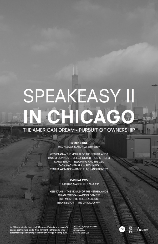 The series, conceived by the Chair of Complex Projects (TU Delft) in collaboration with ARCHEWORKS, intends to capture the spirit – the geist – that inherently orders Chicago’s social, economic and spatial decisions. Regardless of historical and contemporary periods of turmoil, The Chicago Speakeasy seek to understand the underlying essence of the city by inviting several speakers into open discussions.