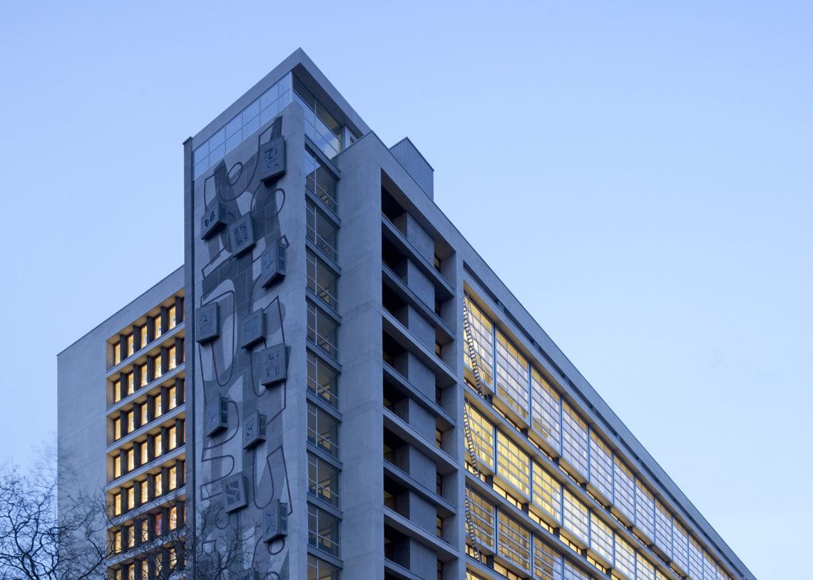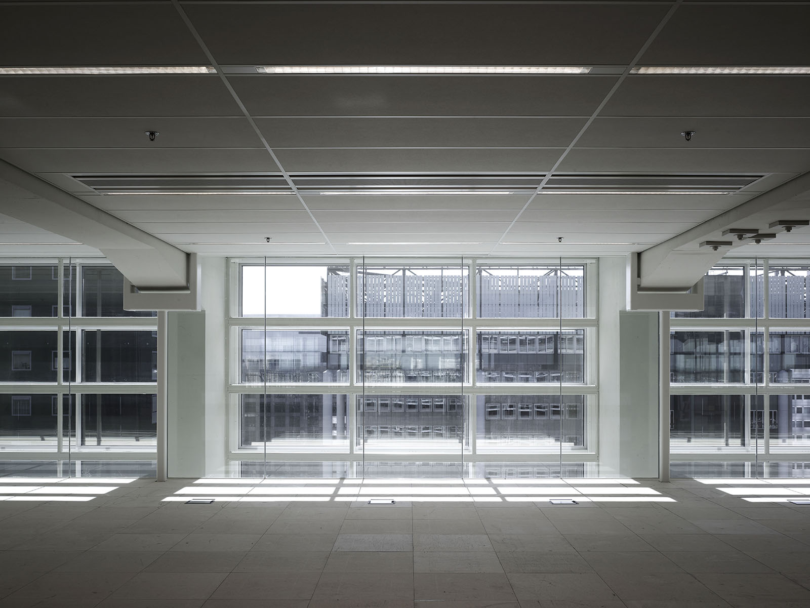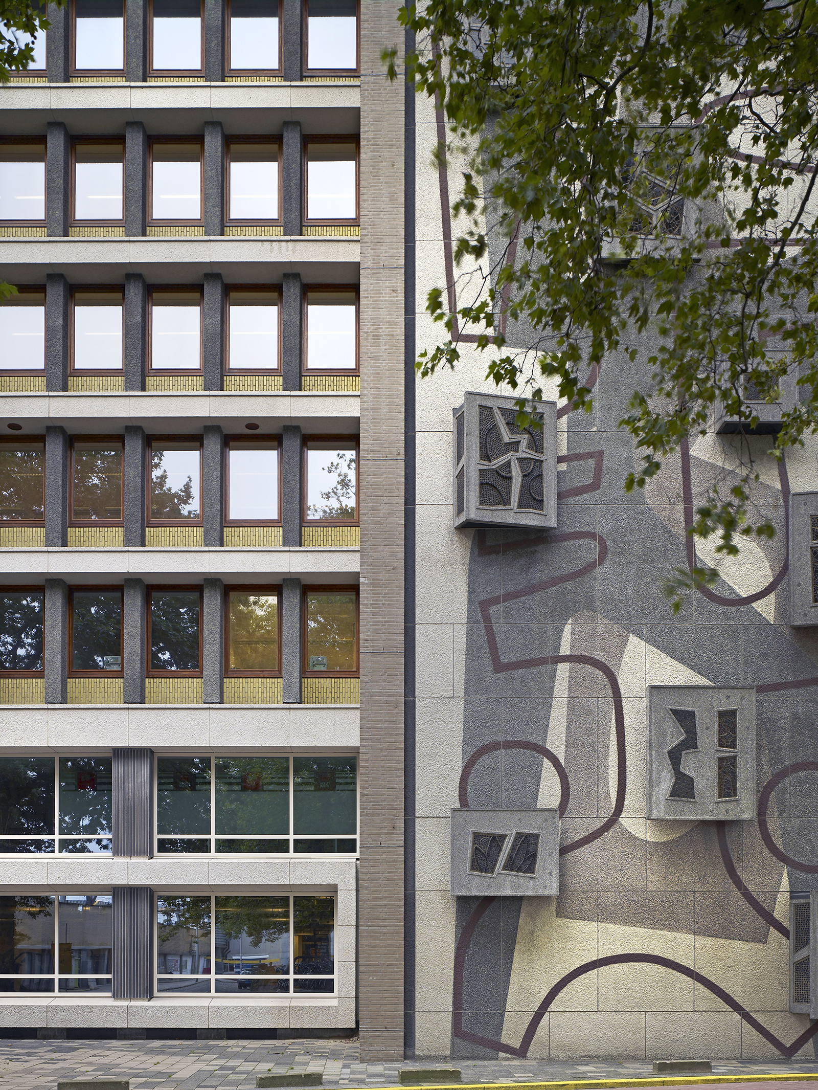 The existing cores on both sides of the building were updated. The long office floors were divided by a wall to reduce the size of rentable units and to create fire proofing compartments. A corporate penthouse is housed on the top floor, with a terrace overlooking the city, while the ground-floor uses and tenants add vibrancy to a completely new and contemporary Delftseplein. Meanwhile, the numerous integrated art pieces were kept in their original place, restored, or if possible returned.