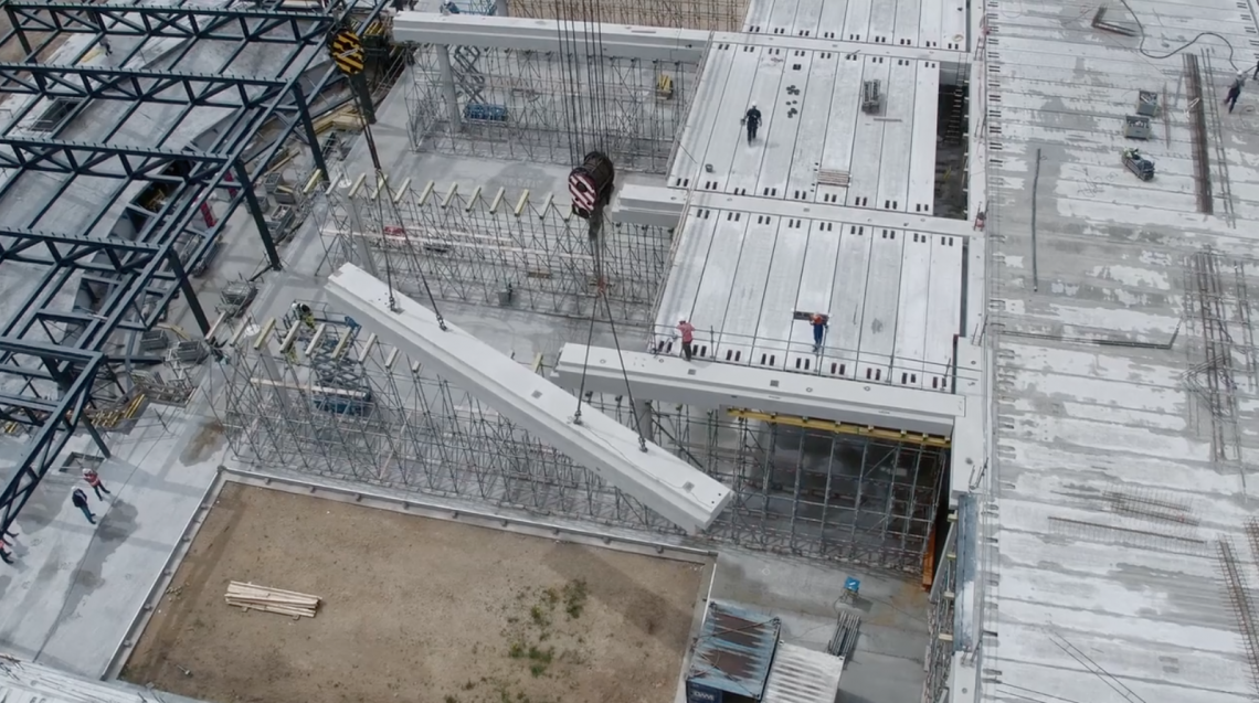 The building, a collaboration between KAAN Architecten and VORM, will support all faculties within the university by providing auditoriums, lecture rooms, meeting places and cafeterias for the students to meet and study. This video shows the special operation from day 17 of the construction process: the positioning of four 50.000 kg concrete beams with a span of 50 meters. Two cranes were needed to achieve this, weighing in at  650 and 750 tons respectively.