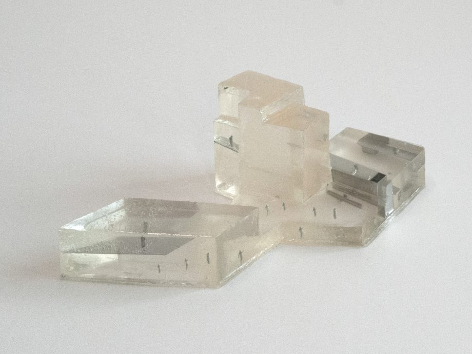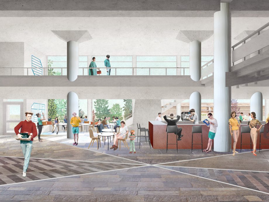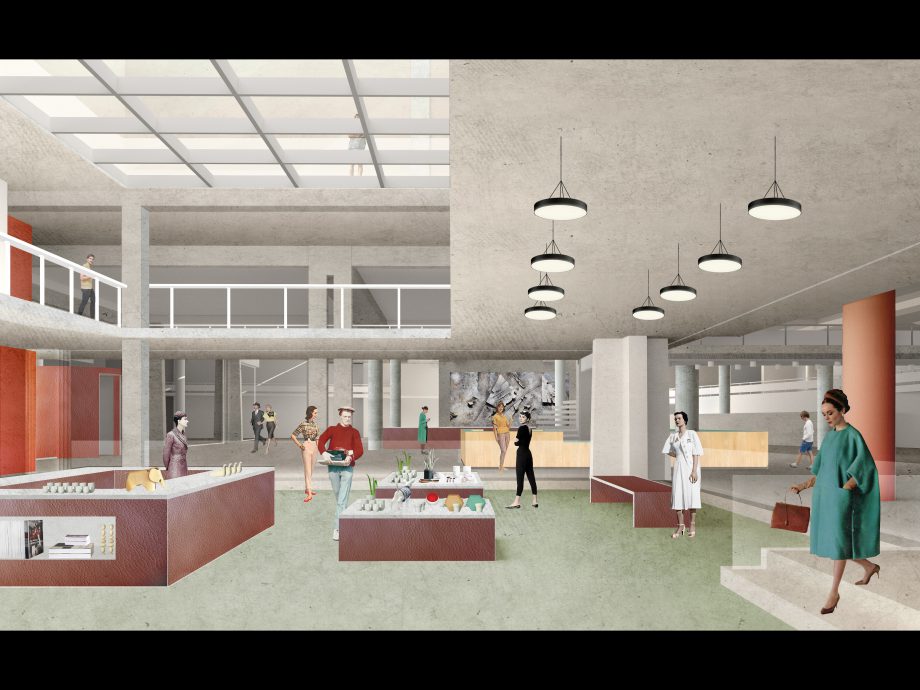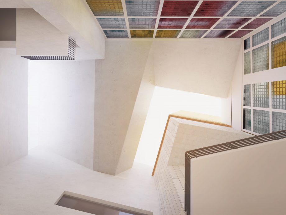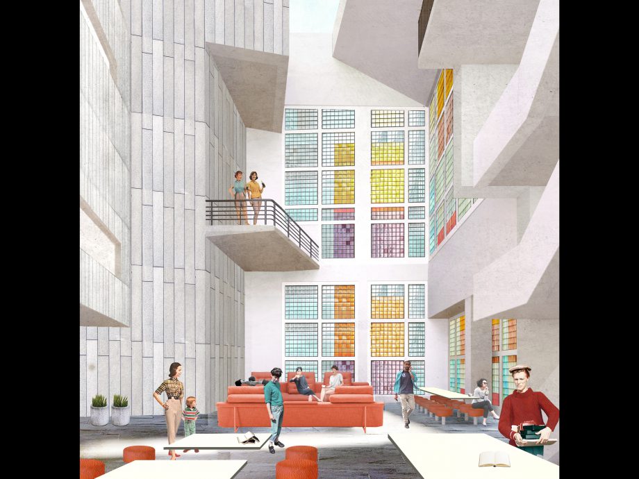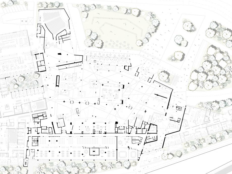 The proposed intervention for the Berlin State Library pays homage to the urban relationship between Potsdamer Platz and Kulturforum. The structure called “Little Scharoun” is inserted into the building and offers spaces to linger and enjoy. Unobtrusively and elegantly, it fulfills its function as an entrance for the state library, foyer, conference center and offices. In line with the original concept, the design is based on the introduction of three areas divided according to noise intensity: the library as a ‘quiet’ area, the foyer as a ‘whispering’ area and the restaurant as a ‘buzz’ area oriented towards the facade. Transparent but effective sound insulation is installed to shield the quiet area in the library. The foyer is transformed into an inviting entrance where visitors can move freely – shop, meet, study or get information about the library; without disturbing the quietness and still keeping all of the original spatial qualities and the core function of the State Library.