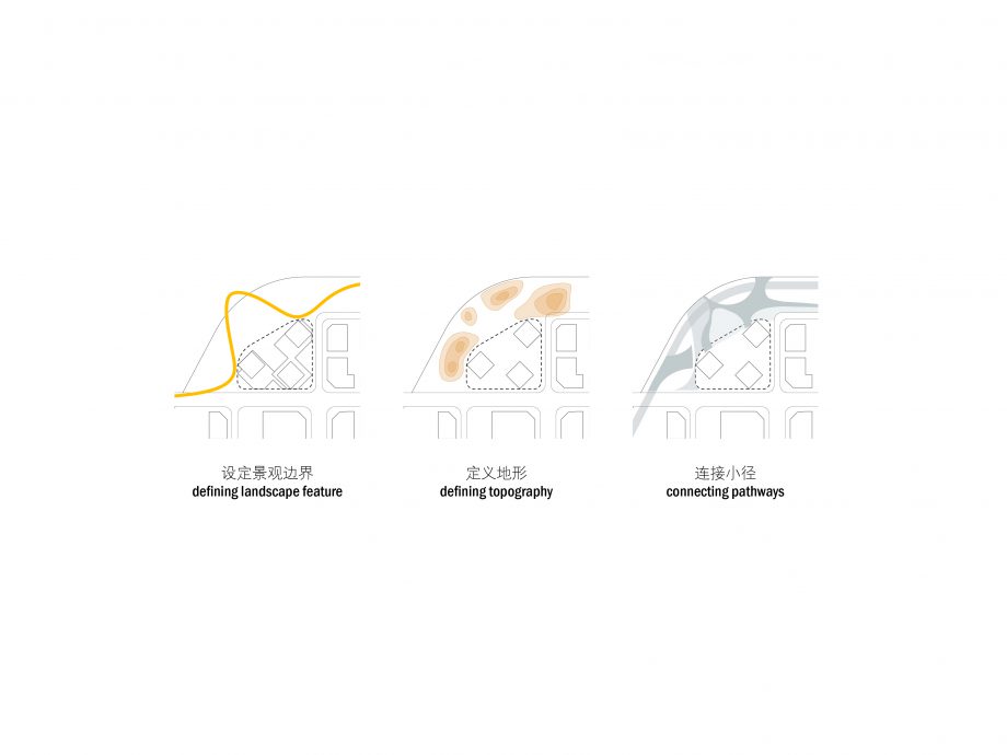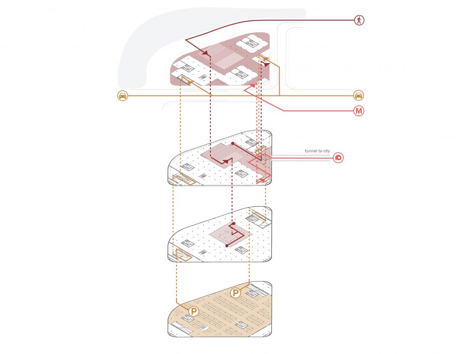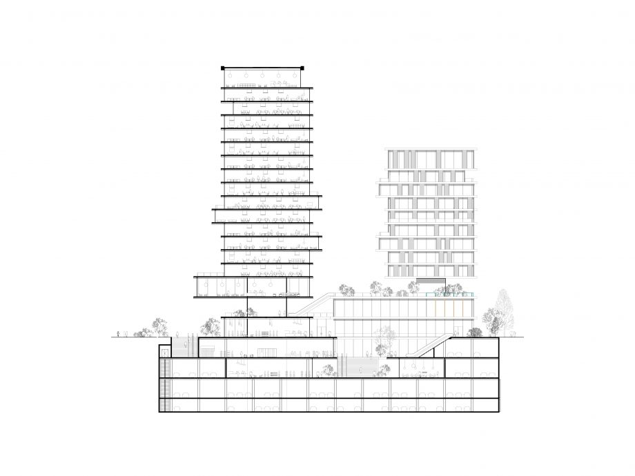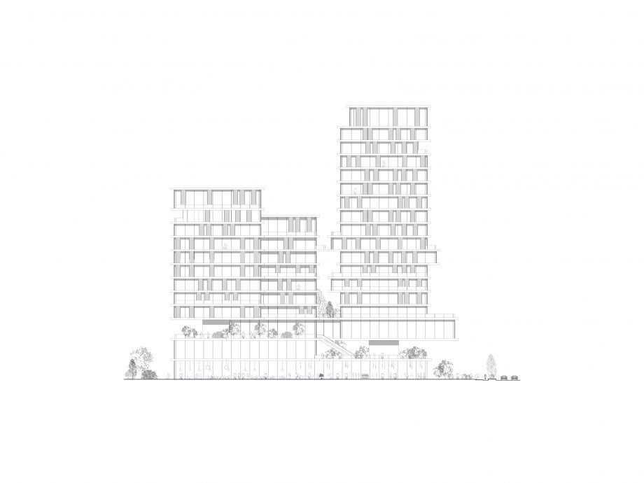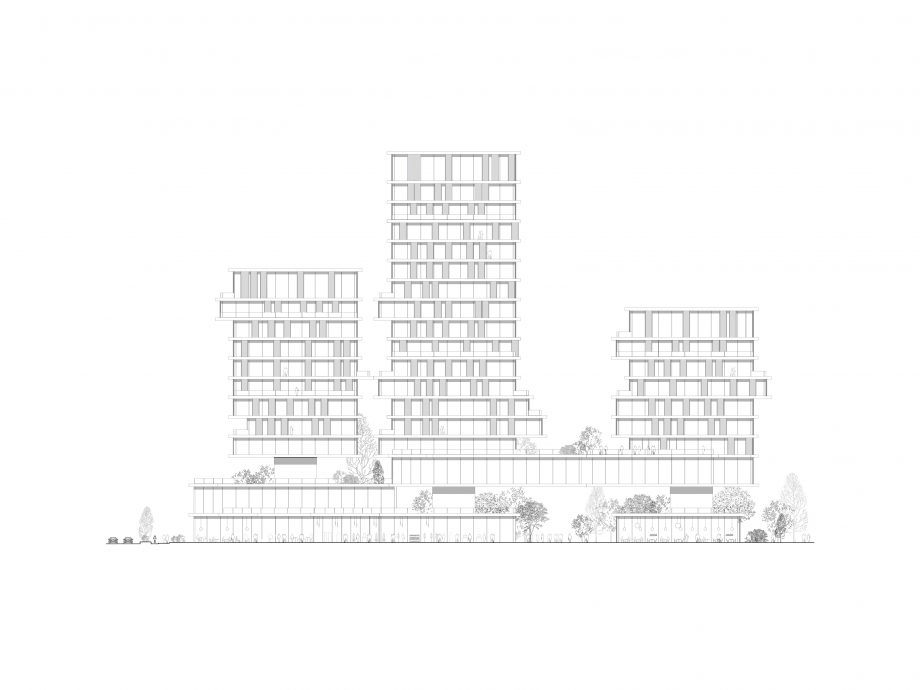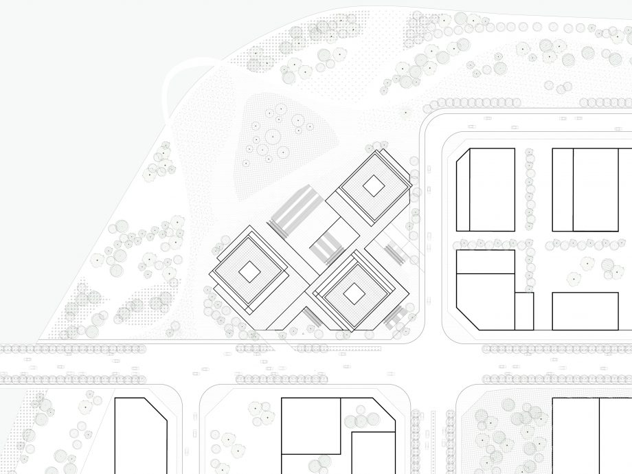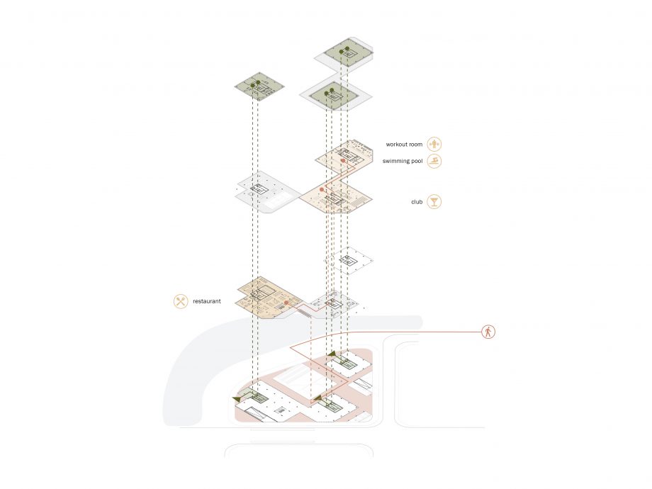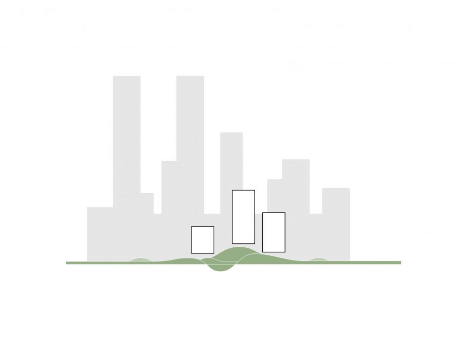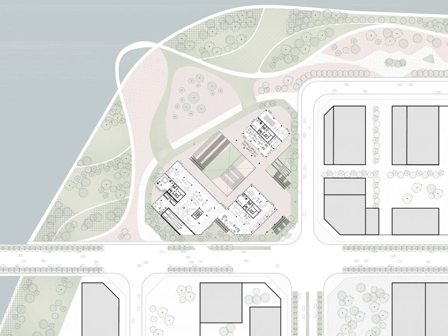 Taking the unique advantage of the site, the project aims to form a new border between the city and the landscape: the convergence of the two is especially important. The project creates an active urban ground yet it grows out from the landscape. The grid of towers is rotated in relation to the surrounding buildings, thus facing the waterfront directly. The towers are lightweight mirages above the green landscape, set apart from the hard city in the background. In this cluster, three towers make a soft composition of horizontal lines. The building is independent, crowning the edge of the waterfront but at the same time embedded into the landscape. With its natural soothing image, it invites inside the liveliness and activities from the waterfront.