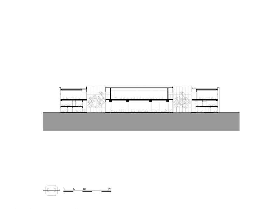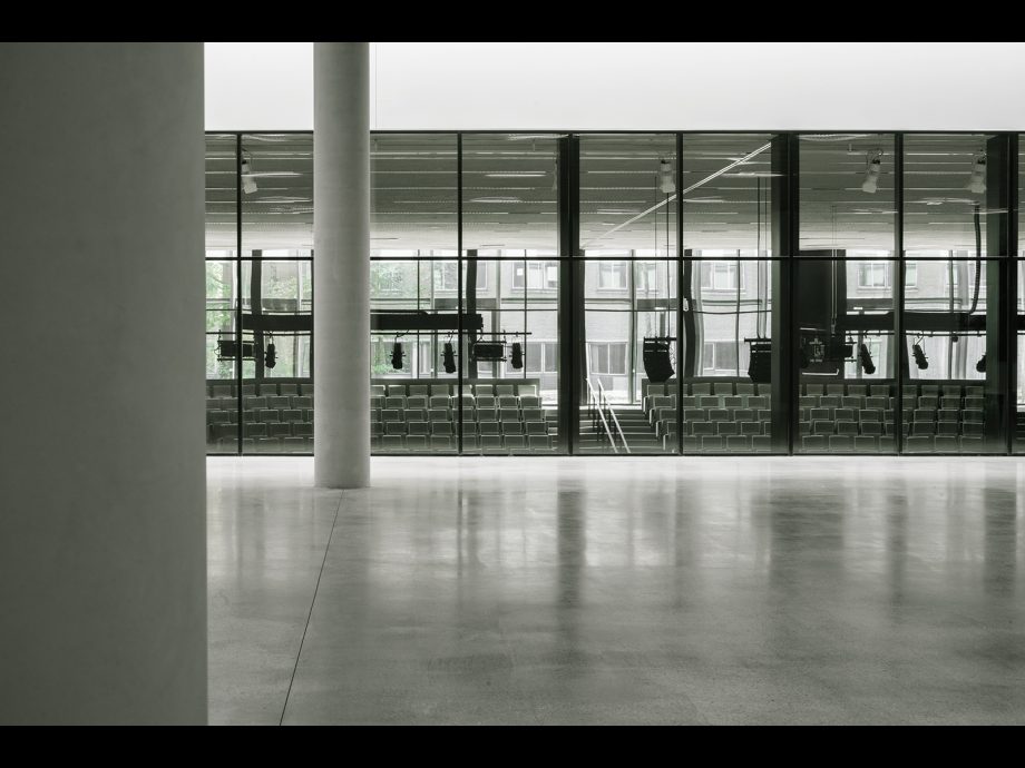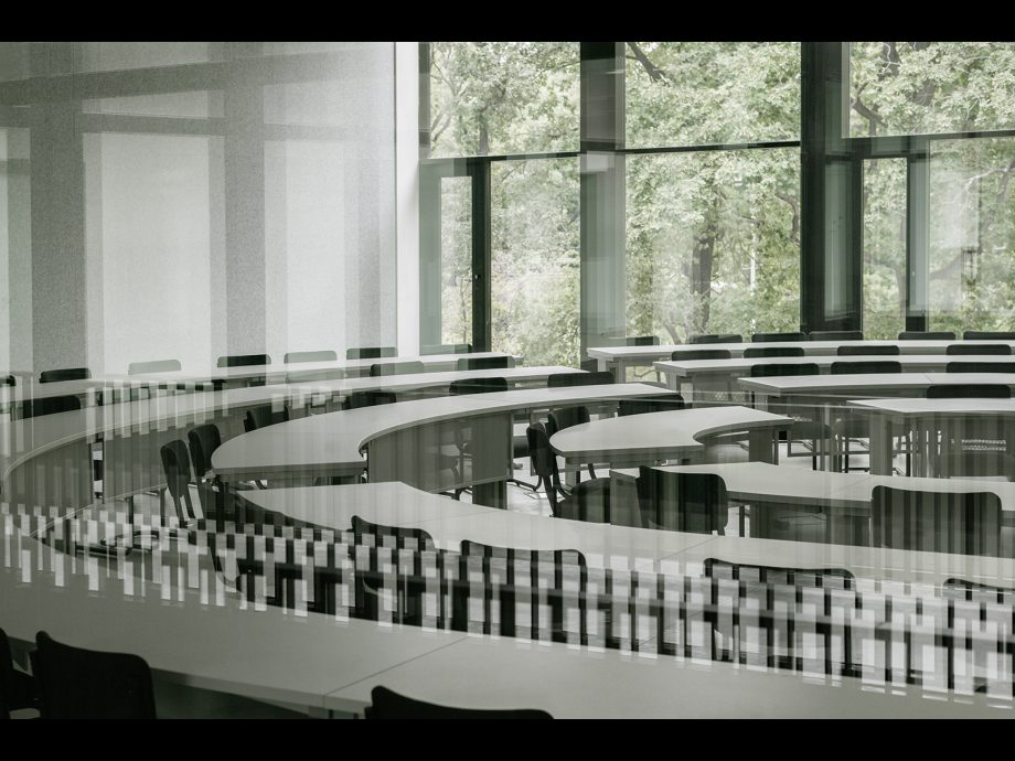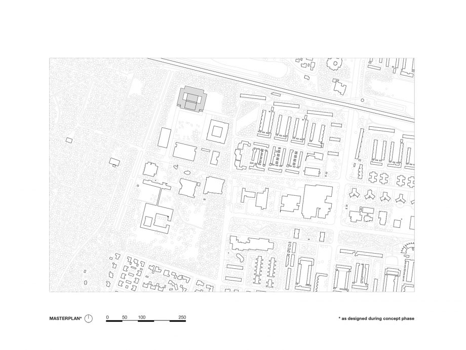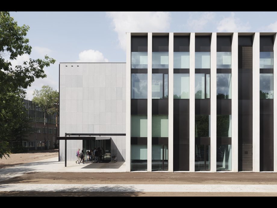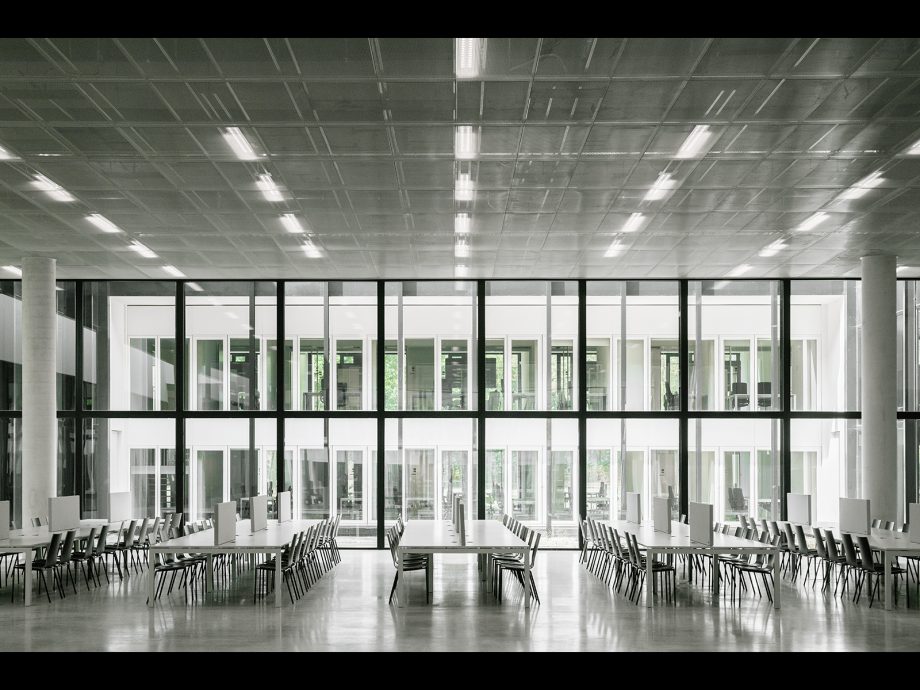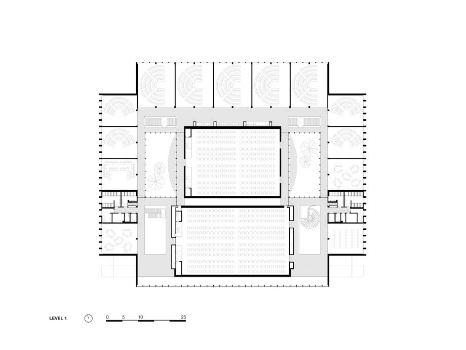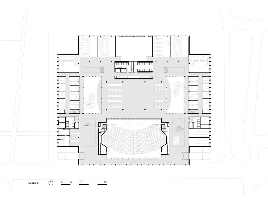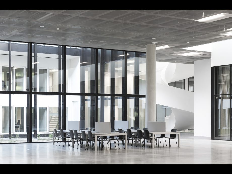 Seamlessly blended into the existing greenery of Tilburg University campus, CUBE serves as Education and Self Study Center for more than 2000 students and lecturers that cross its spaces every day. On all sides, the building features a homogeneous layout that leaves no closed-off facades but exudes complete equality on all sides. Anchored to the landscape by paved pathways to its corner entrances, the heart of the CUBE is a spacious indoor study plaza flanked by a transparent auditorium and two patios. It comprises one continuous realm dotted with open study and circulation spaces, lounges, and a catering area. Alongside the green patios, independent study spaces with lower ceilings are recessed, dedicated to concentrated work. On both floors, all fully-equipped lecture rooms run alongside the west, north and east facades highlighting the strong orthogonal orientation of CUBE.