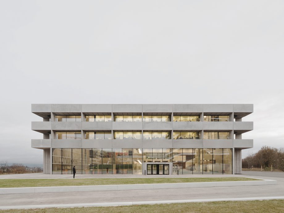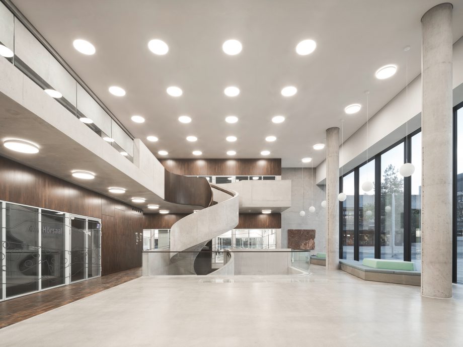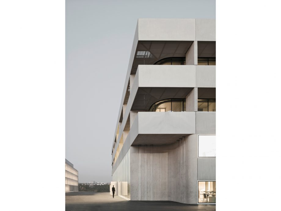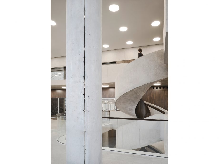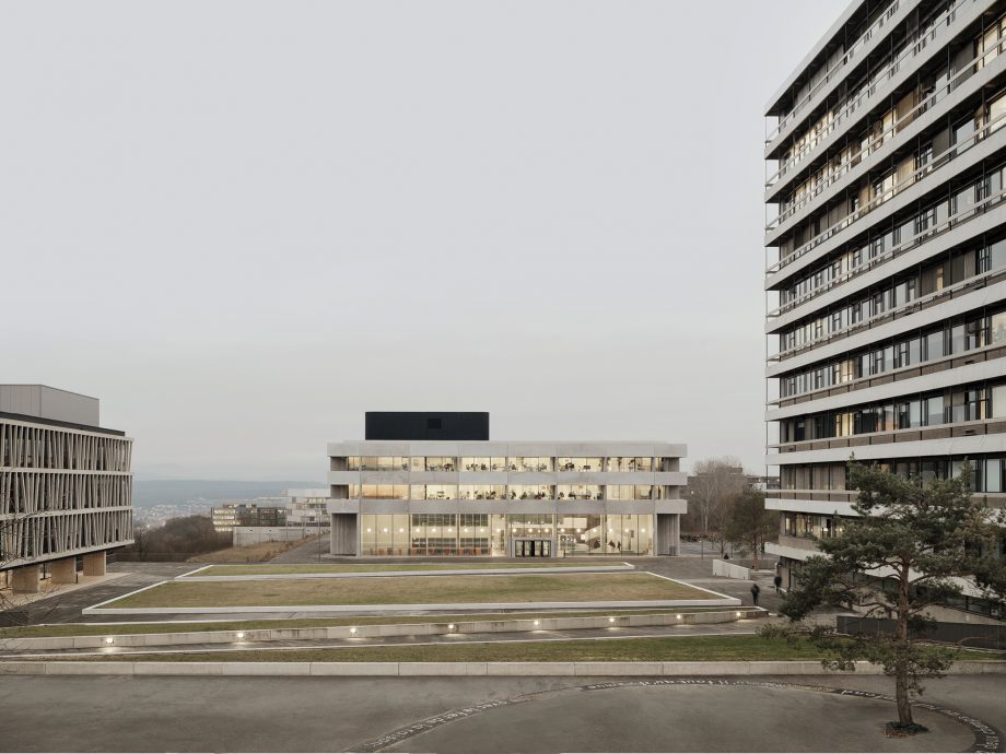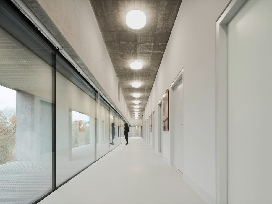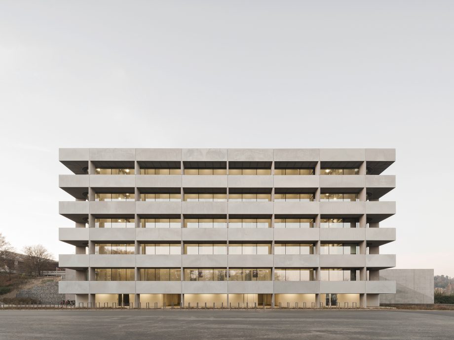 Geo- and Environmental Centre (GUZ) is a state of the art facility for interdisciplinary research into solutions for environmental problems, located at the Eberhard Karls University in Tübingen. Its prominent location complements the campus’ urban layout and underlines the Centre’s scientific importance as it brings together previously scattered departments. The combined facility aims to stimulate exchange between individual departments in the building and other natural science faculties located in the area. Partially recessed into the site’s slope, the building is a low elongated structure spreading over six floors. Within its 100 by 50 m footprint, it encloses two courtyards laid out on different levels to cope with the inclined topography of the site. Geo- and Environmental Centre combines public teaching and study areas with specialised research and workspaces. Conveniently located communal facilities like the auditorium and seminar rooms in the north are easily reached from the campus square. The labs and workshops face east, with offices lining the west and south. The specialised activities of the Centre are on display between the seemingly solid concrete bands, making the building look like a block of stone with deep ridges that expose a glazed volume.