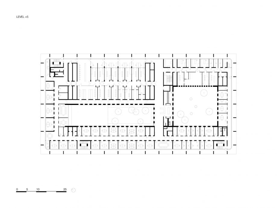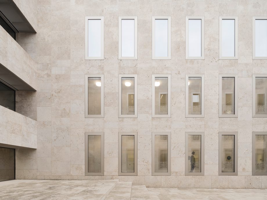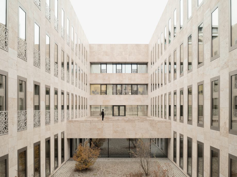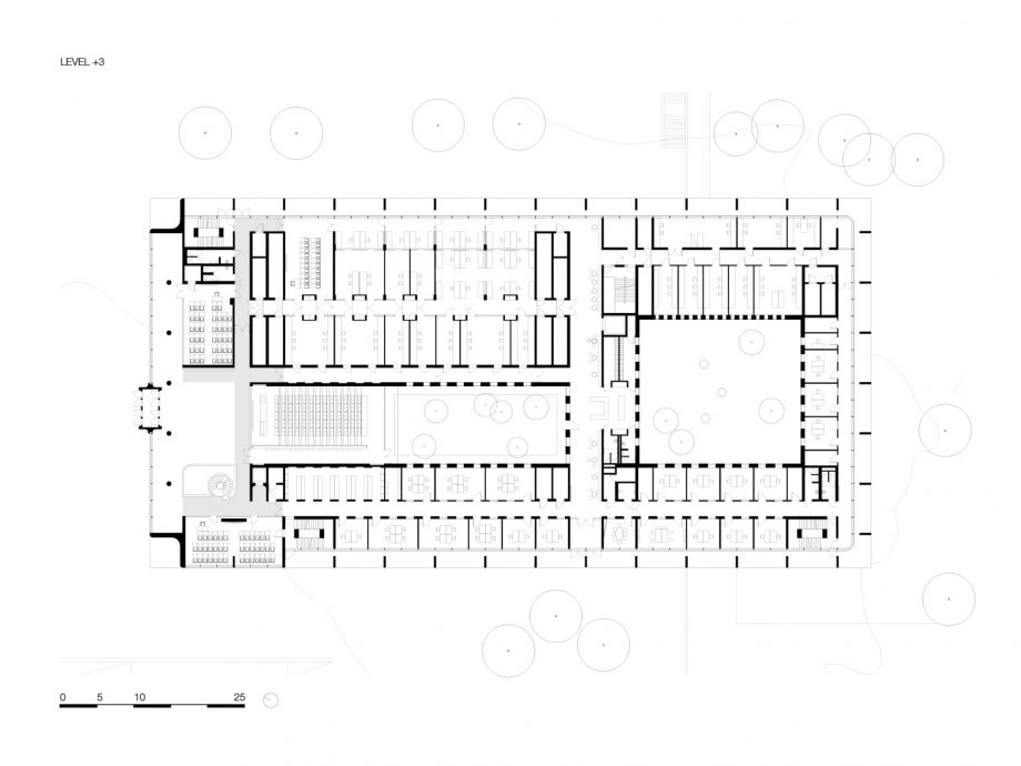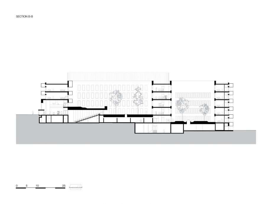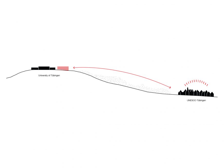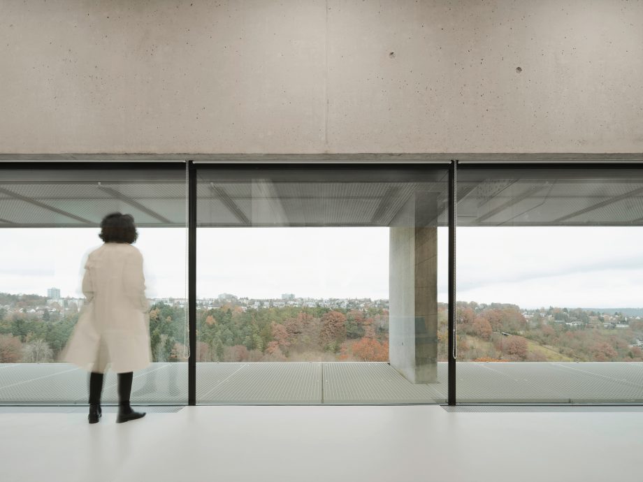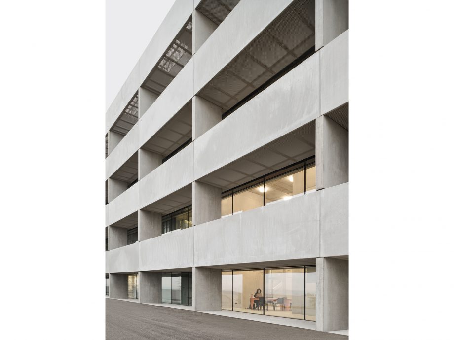 Geo- and Environmental Centre (GUZ) is a state of the art facility for interdisciplinary research into solutions for environmental problems, located at the Eberhard Karls University in Tübingen. Its prominent location complements the campus’ urban layout and underlines the Centre’s scientific importance as it brings together previously scattered departments. The combined facility aims to stimulate exchange between individual departments in the building and other natural science faculties located in the area. Partially recessed into the site’s slope, the building is a low elongated structure spreading over six floors. Within its 100 by 50 m footprint, it encloses two courtyards laid out on different levels to cope with the inclined topography of the site. Geo- and Environmental Centre combines public teaching and study areas with specialised research and workspaces. Conveniently located communal facilities like the auditorium and seminar rooms in the north are easily reached from the campus square. The labs and workshops face east, with offices lining the west and south. The specialised activities of the Centre are on display between the seemingly solid concrete bands, making the building look like a block of stone with deep ridges that expose a glazed volume.