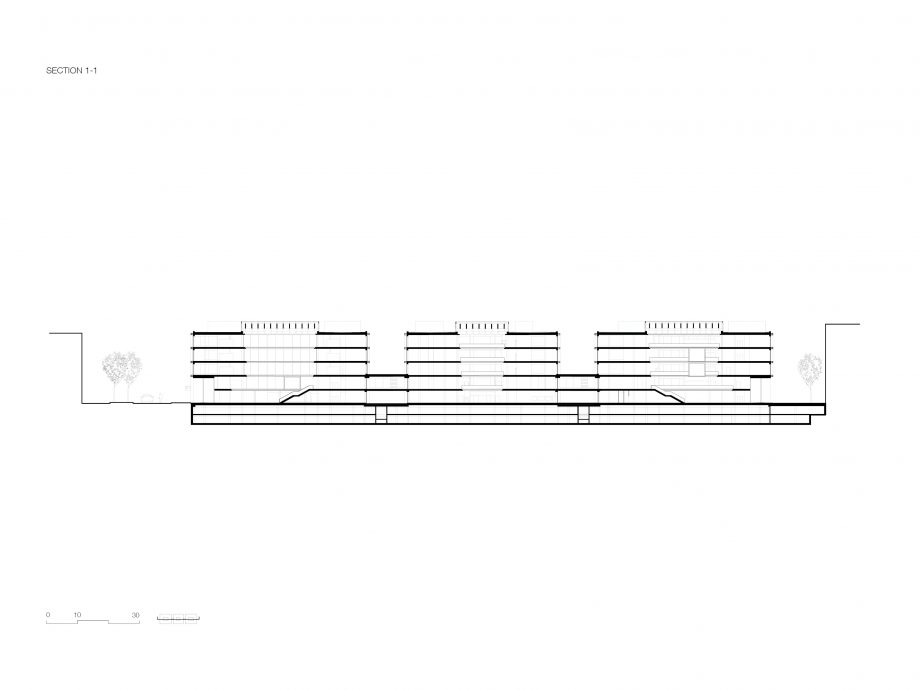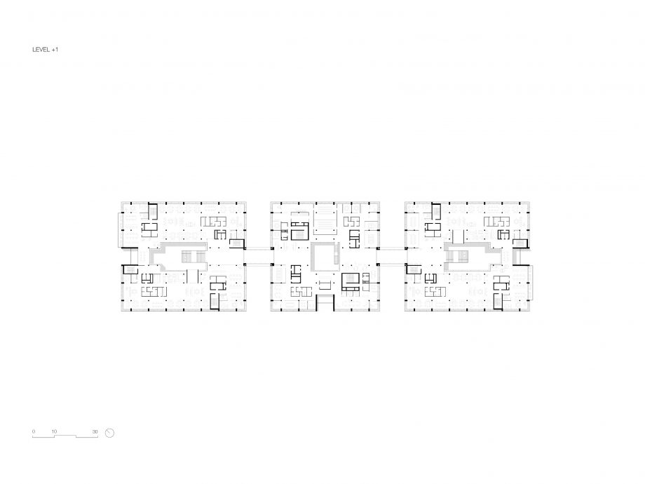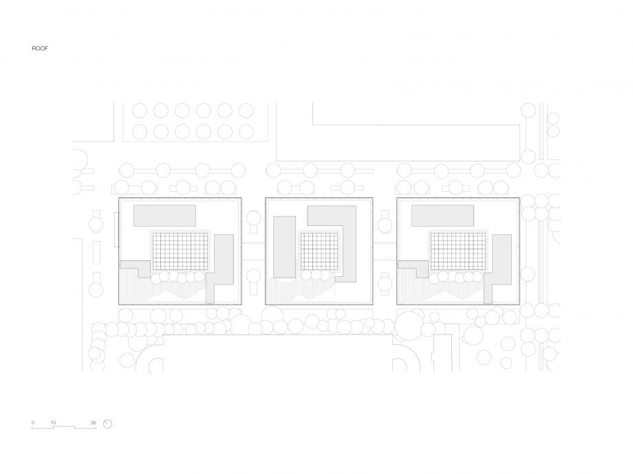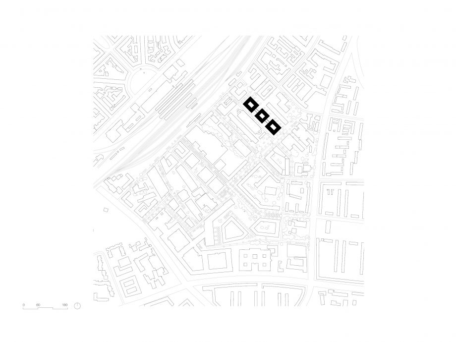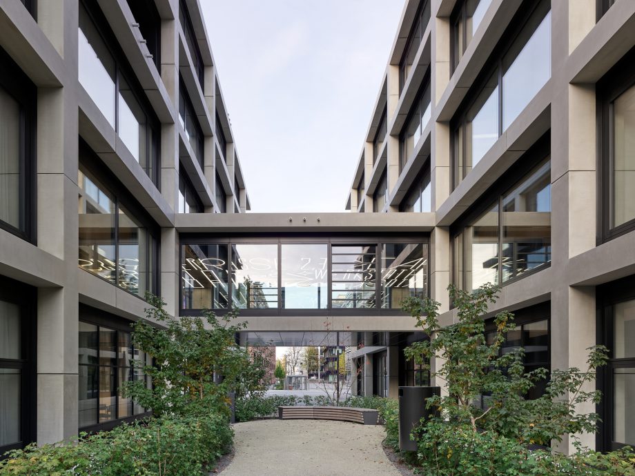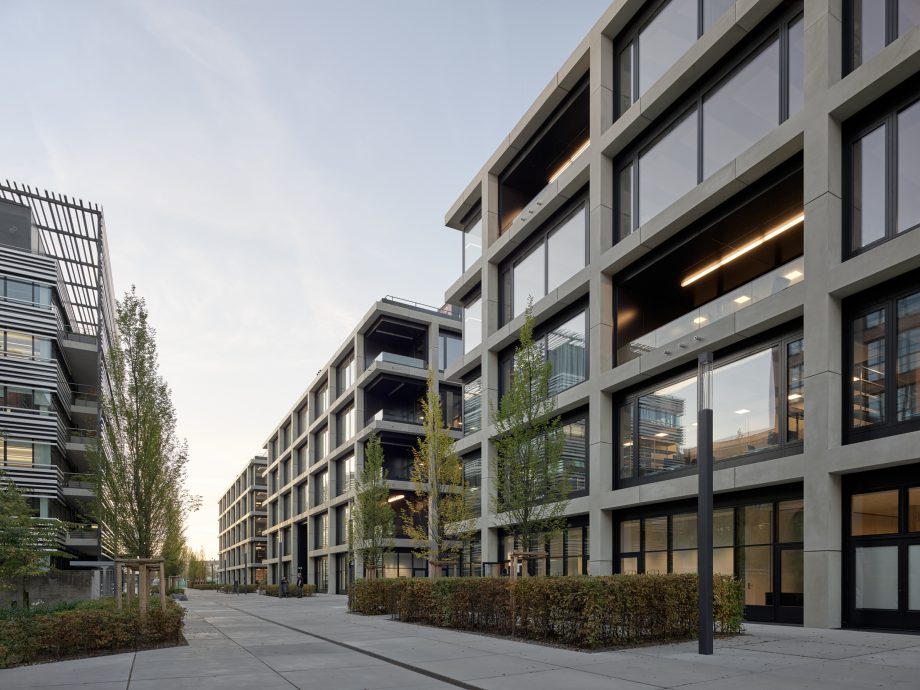 Located in the former industrial and commercial Werksviertel district of Munich, the three iCampus buildings bring a novel office typology to the area – loft-like workspaces fit for contemporary creatives. The flexible internal dynamics of the building are visible through the generous openings on the modular façade. The rational grid consists of over 800 large prefab concrete elements, while dark metal cladding wraps the entrances, stairways and technical spaces in a continuous skin. All the floors come together around large central atriums, which embody the social heart of the complex. Elegant ‘lanterns’ made of laminated timber beams crown the atriums providing plenty of daylight and preventing heat accumulation. They also give way to green rooftop terraces for all tenants and provide views of the nearby Alps. Rooted in the rational appearance of the site’s industrial heritage, with generously proportioned openings and a high level of refinement, the iCampus ensemble blends with the existing urban fabric offering a comfortable and future-proof work environment.