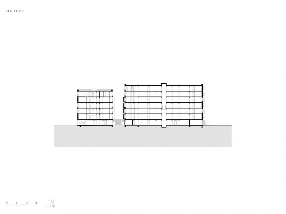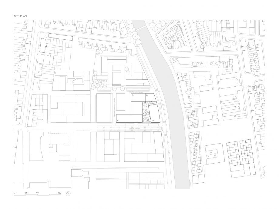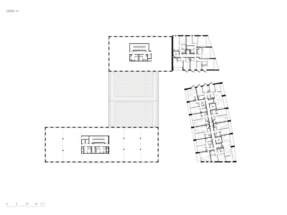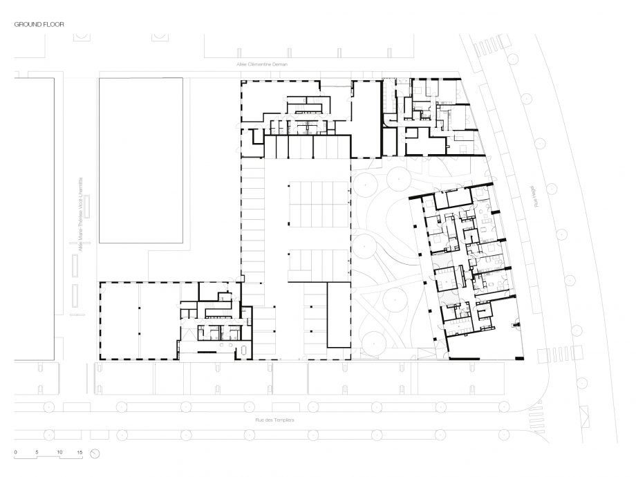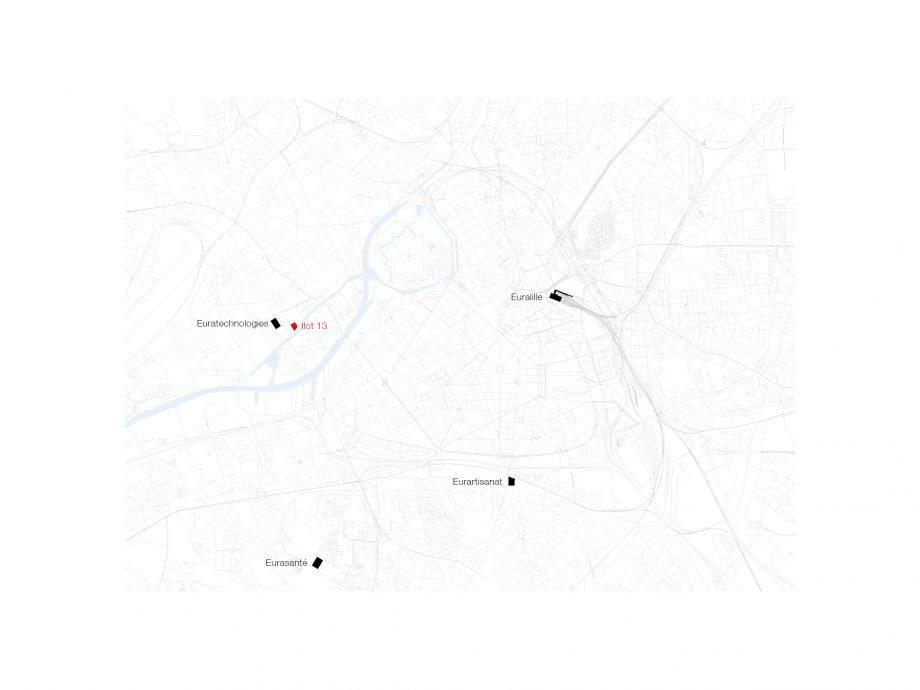 Based on a master plan by Pranlas Descours Architectes and Bruel Delmar, the redevelopment of Rives de la Haute Deûle area in Lille proposes various public spaces along the canal. This urban pattern extends through the different ‘function-defined plots’ (îlots) positioned on both banks along the green spaces. Such is the Îlot 13B, located on the south-eastern edge of the first completed sector of the development zone, overlooking the river canal and bordered by public roads.