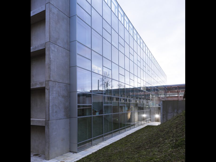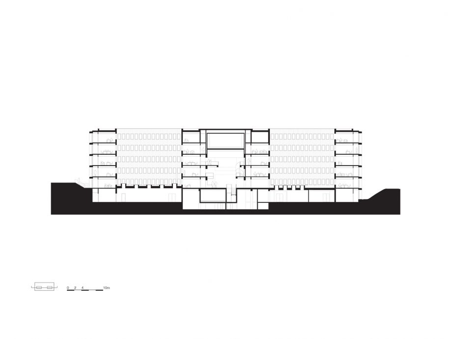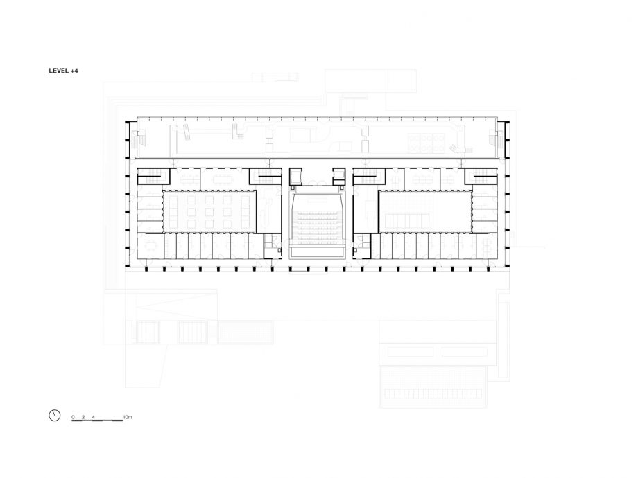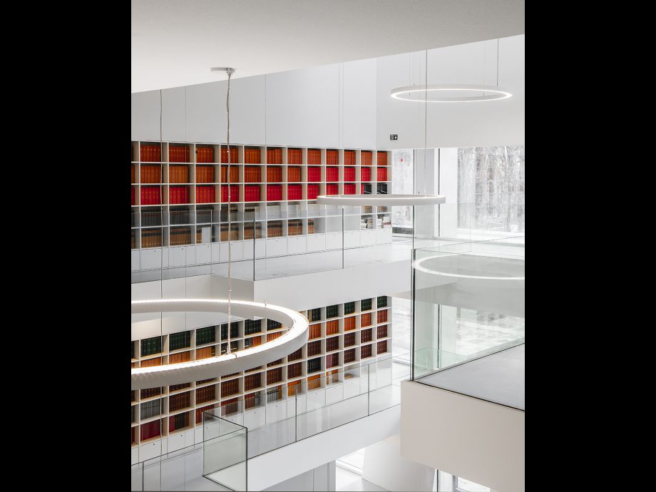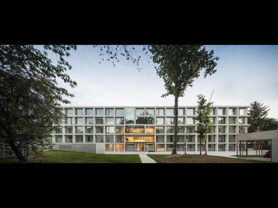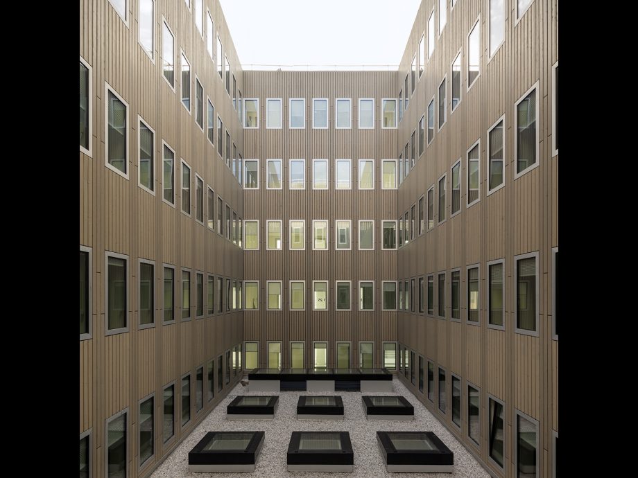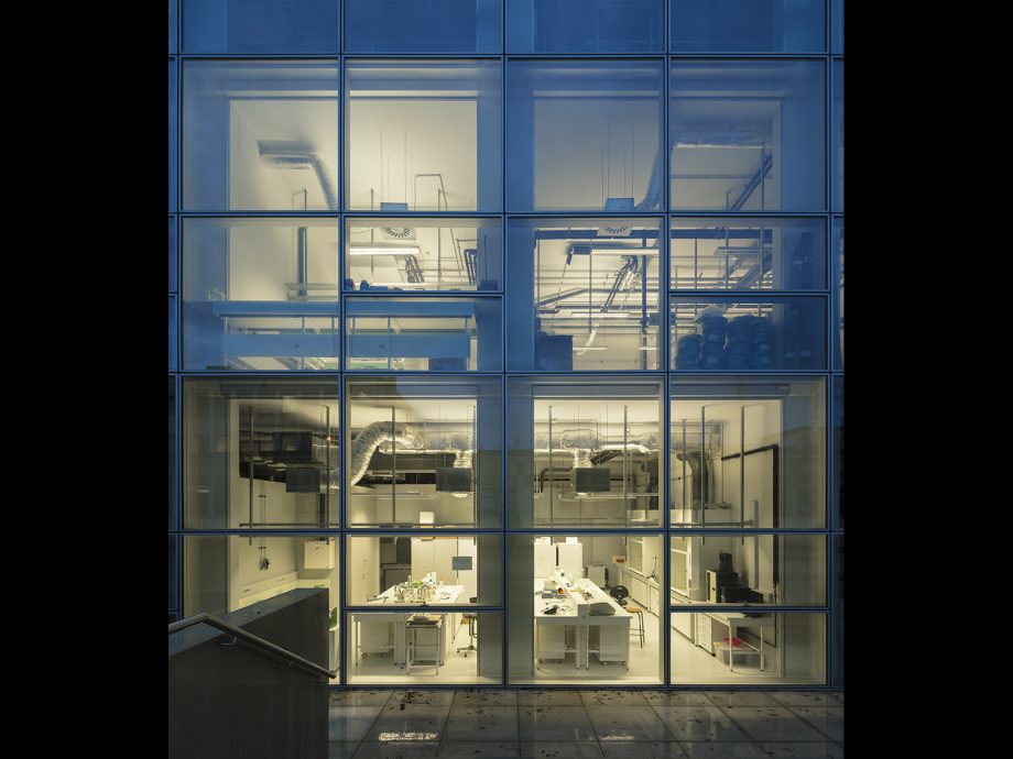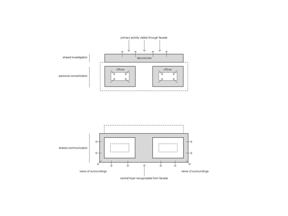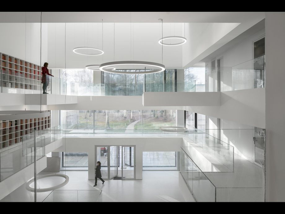 Robust and elegant, while essentially open in character, ISMO building is distinguished by a harmonic coexistence of nature and scientific research. It unites two architecturally expressed realms, housing theoretical and practical research, into a single entity. While the laboratories are situated along the north-facing side of the building behind a sleek curtain wall, the southern facade houses the office areas set around two spacious courtyards providing natural light. Grid like pattern of concrete posts and lintels extends from the south facade around the corners to the sides and reaches all the way to the end corners. Upon entering the building, the atrium unfolds all the way up to the roof with daylight flooding it through the facade and a large skylight. Above the atrium, a large auditorium hovers suspended from above. Aside the entrance, a library wall stretches over two levels, connected by an enclosed spiral steel staircase. Pointing upwards, rectangular balconies project into the space as comfortable settings for conversations and exchange of ideas.