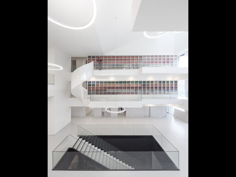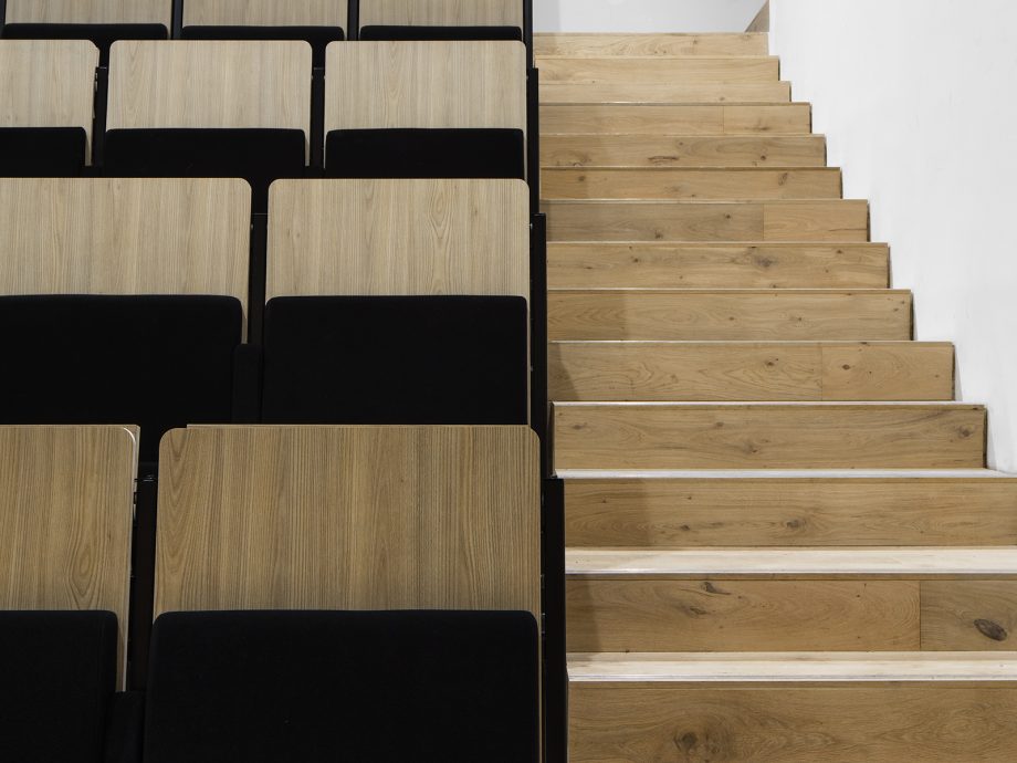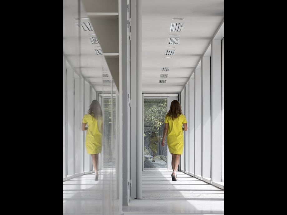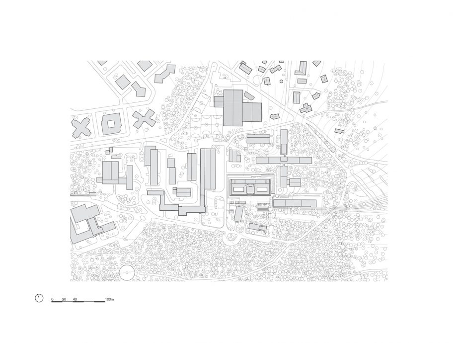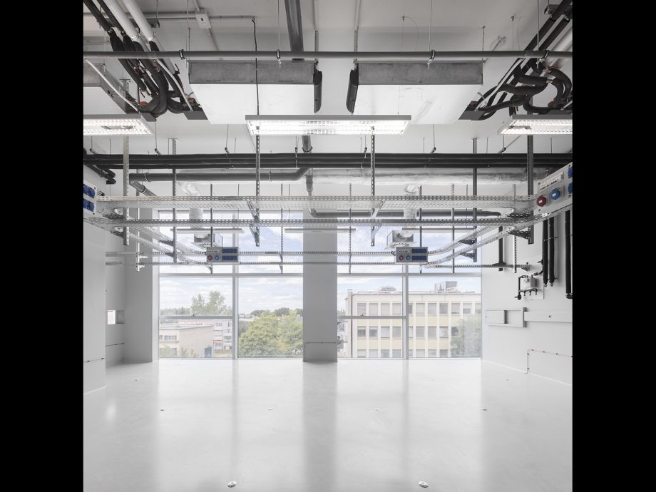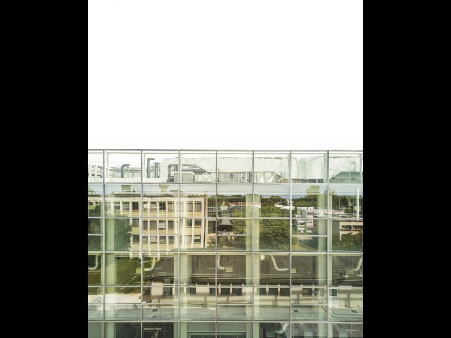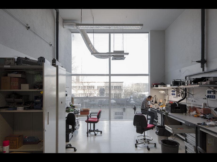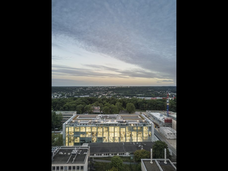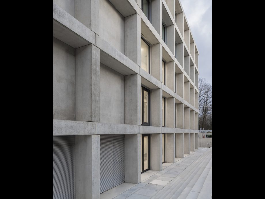 Robust and elegant, while essentially open in character, ISMO building is distinguished by a harmonic coexistence of nature and scientific research. It unites two architecturally expressed realms, housing theoretical and practical research, into a single entity. While the laboratories are situated along the north-facing side of the building behind a sleek curtain wall, the southern facade houses the office areas set around two spacious courtyards providing natural light. Grid like pattern of concrete posts and lintels extends from the south facade around the corners to the sides and reaches all the way to the end corners. Upon entering the building, the atrium unfolds all the way up to the roof with daylight flooding it through the facade and a large skylight. Above the atrium, a large auditorium hovers suspended from above. Aside the entrance, a library wall stretches over two levels, connected by an enclosed spiral steel staircase. Pointing upwards, rectangular balconies project into the space as comfortable settings for conversations and exchange of ideas.