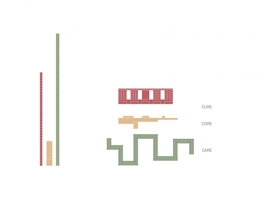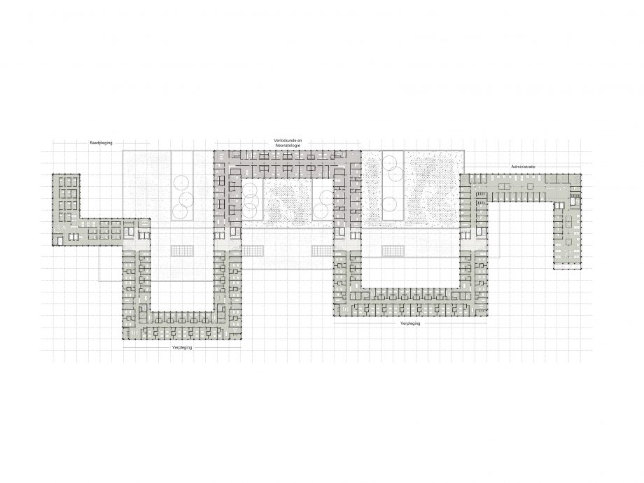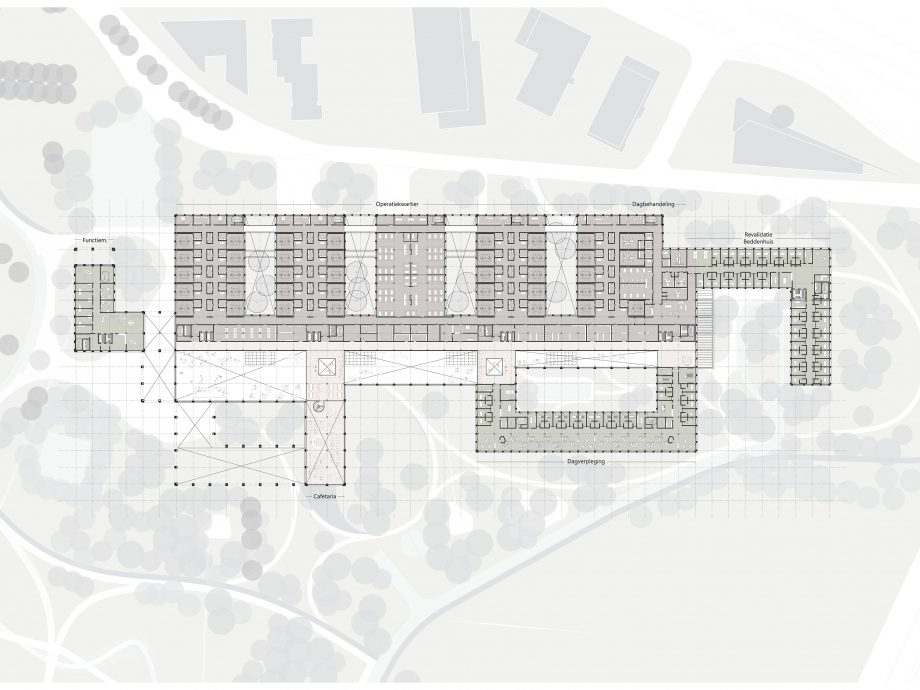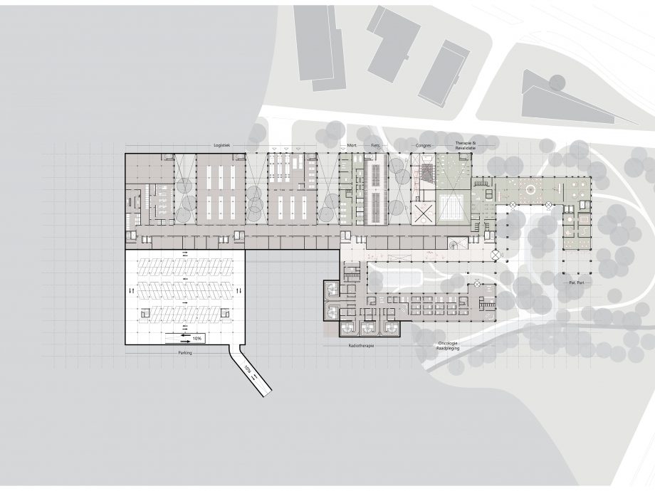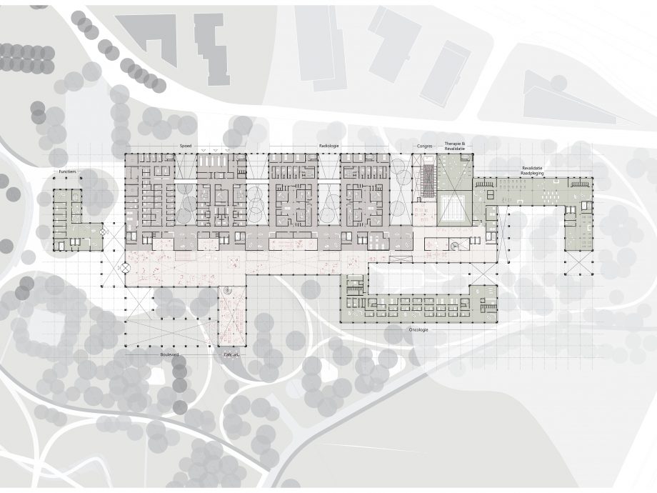 Salvatorpark is a new healing environment, including a new hospital for Hasselt, providing the local citizens with a place to relax, exercise and play. The hospital is an integral part of the park and adds an essential dimension to the landscape. This is achieved by making the public interior part of the routing through the Salvatorpark and focusing on a strong interaction between inside and outside through spacious courtyards. This positively influences the experience and interaction between patients, visitors and staff. Making the human scale the basis for the design, the hospital has been organized from the smallest unit outward – the hospital room with a window that looks out onto various patios or the future park. From the room, one can walk to intimate living rooms nestled in a green environment. Soft colours inspired by nature enliven the interior and facades, whereby the room becomes recognizable in the modular facade design. Personal contact with doctors, nurses and family in a caring interior, where the patient feels more like a guest than a person in need, contributes to a fast recovery. The program is divided into a Cure, Core and Care part. The specific high tech program (the hot floor, radiology and emergency) is positioned in the Cure along the city for efficient logistics. Medium tech and general functions are housed in the Care, meandering through the landscape. Overlaps with the Cure create direct connections inside. A spacious public boulevard – the Care – pierces through the building, giving both Cure and Care easy access. Public facilities along this boulevard generate a lively park lobby.