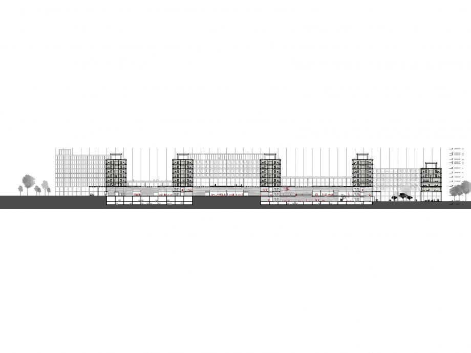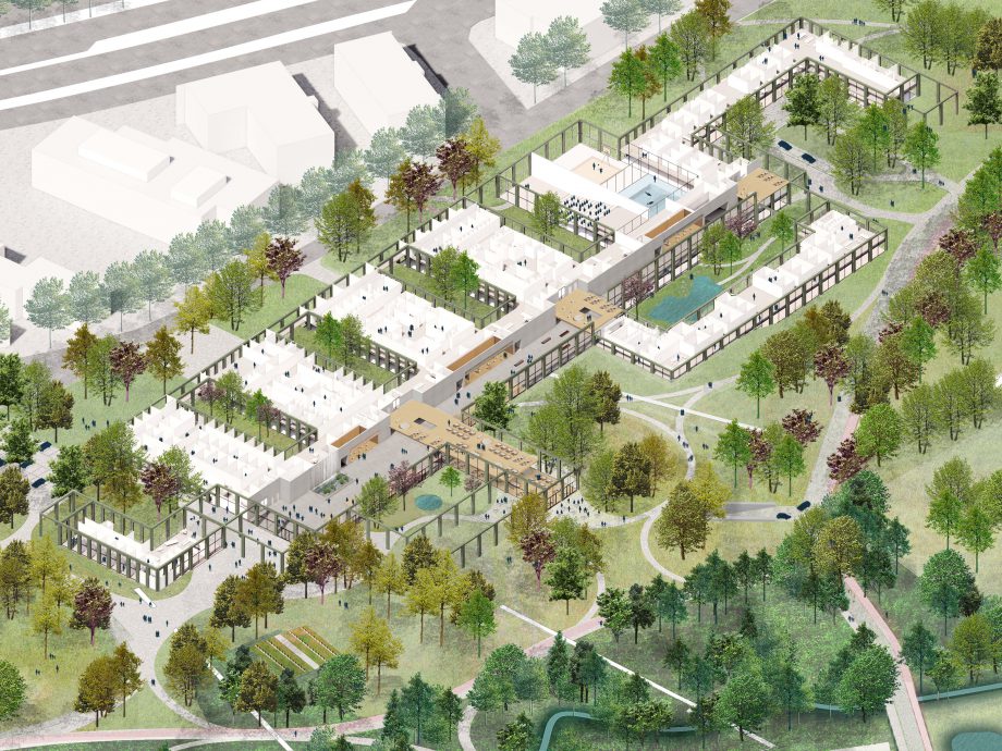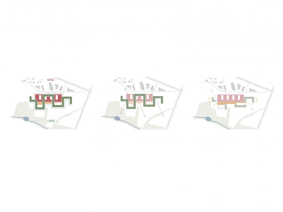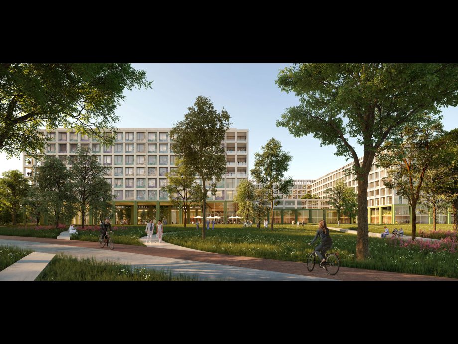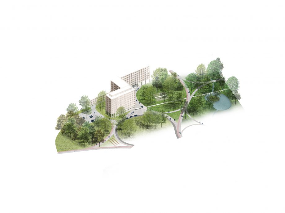 Salvatorpark is a new healing environment, including a new hospital for Hasselt, providing the local citizens with a place to relax, exercise and play. The hospital is an integral part of the park and adds an essential dimension to the landscape. This is achieved by making the public interior part of the routing through the Salvatorpark and focusing on a strong interaction between inside and outside through spacious courtyards. This positively influences the experience and interaction between patients, visitors and staff. Making the human scale the basis for the design, the hospital has been organized from the smallest unit outward – the hospital room with a window that looks out onto various patios or the future park. From the room, one can walk to intimate living rooms nestled in a green environment. Soft colours inspired by nature enliven the interior and facades, whereby the room becomes recognizable in the modular facade design. Personal contact with doctors, nurses and family in a caring interior, where the patient feels more like a guest than a person in need, contributes to a fast recovery. The program is divided into a Cure, Core and Care part. The specific high tech program (the hot floor, radiology and emergency) is positioned in the Cure along the city for efficient logistics. Medium tech and general functions are housed in the Care, meandering through the landscape. Overlaps with the Cure create direct connections inside. A spacious public boulevard – the Care – pierces through the building, giving both Cure and Care easy access. Public facilities along this boulevard generate a lively park lobby.