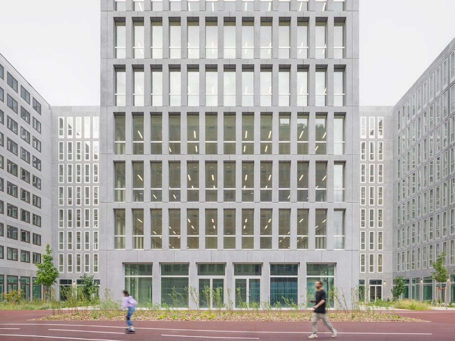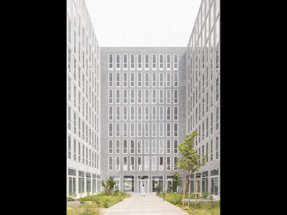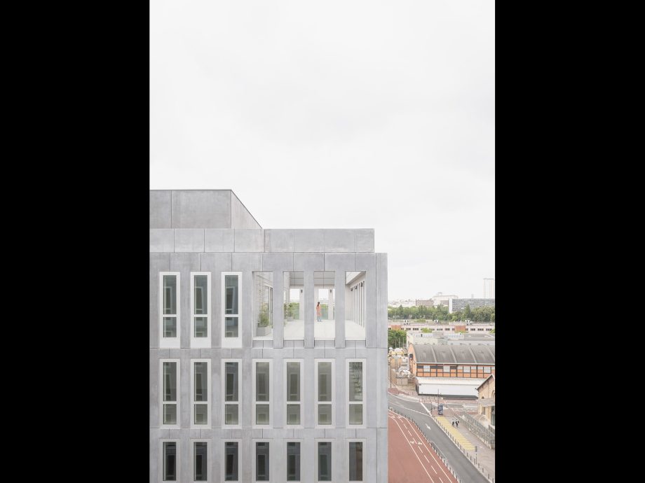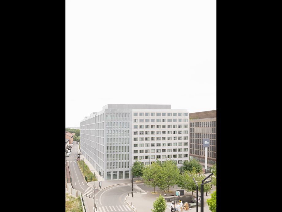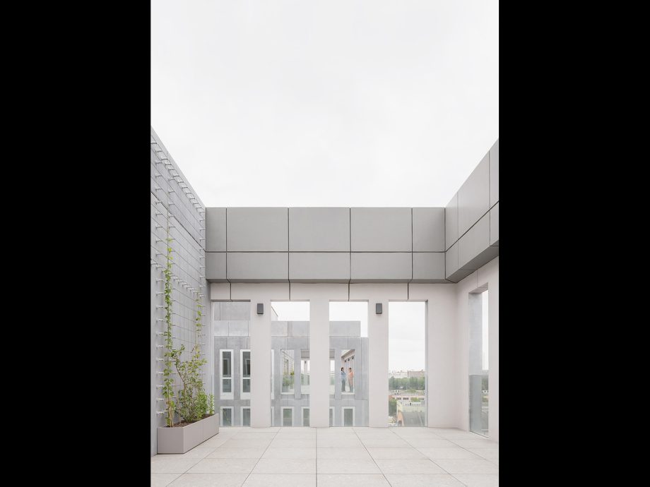 Offices occupy seven floors within the two southern blocks, while the hotel complex located on the main public square toward the north spreads over nine levels. The retail spaces are distributed along the ground floor, actively participating in the daily life of the public square. The upper floors are enriched with terraces connected to the hotel and the shops. To create a connection between the “Place du Front Populaire” (north) and the south of the lot, two nestled wide patios are created to accommodate greenery. These “urban patios”, characterized by verticality, generate landscape alcoves and enrich the urban space with green public areas, along “Rue de Fillettes. For the office section, the elevation grid provides flexibility for partitioning offices, with a solid portion of 43 cm every 1.35 meters. Precast concrete “T” elements form the building structure and façade, with no cosmetic additions. The 43 cm sections are aligned horizontally, concealing the slab structure and creating a uniform grid over the entire comb-shaped volume. Large vertical windows define the façades of these different volumes. The hotel is characterised by panoramic windows that amplify the feeling of space inside the rooms. From the “Place du Front Populaire”, ninety travel scenes illuminate the façade of the hotel.