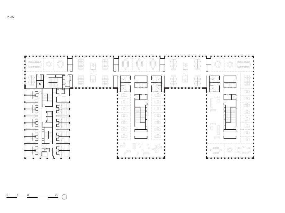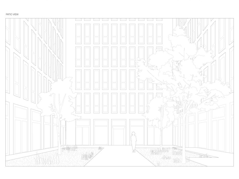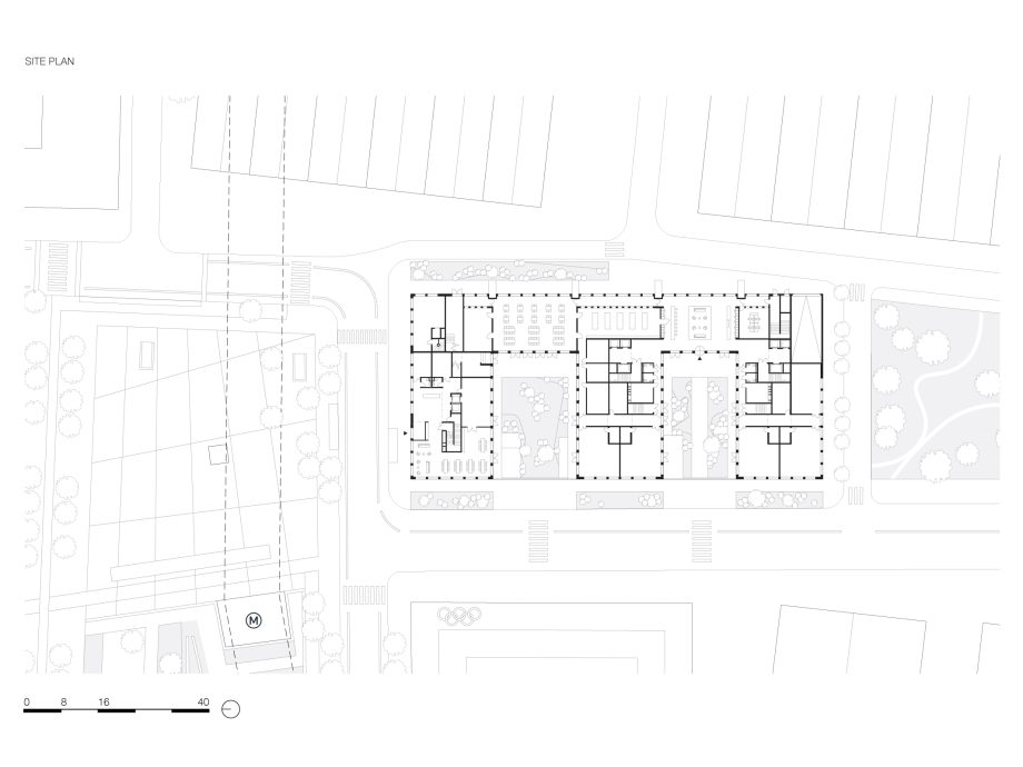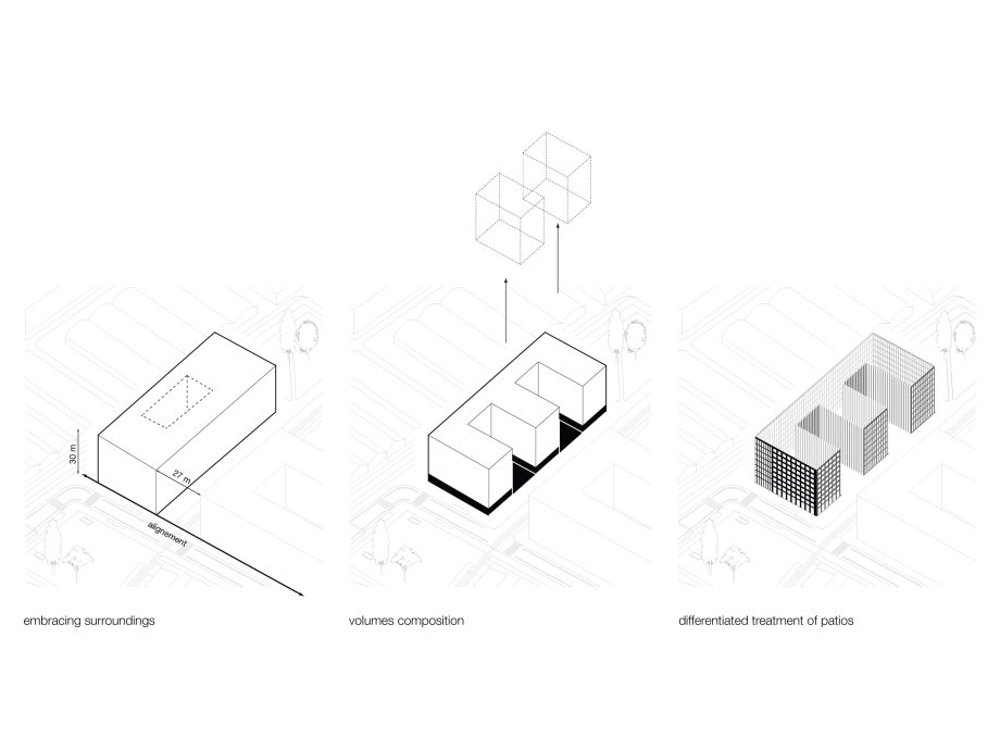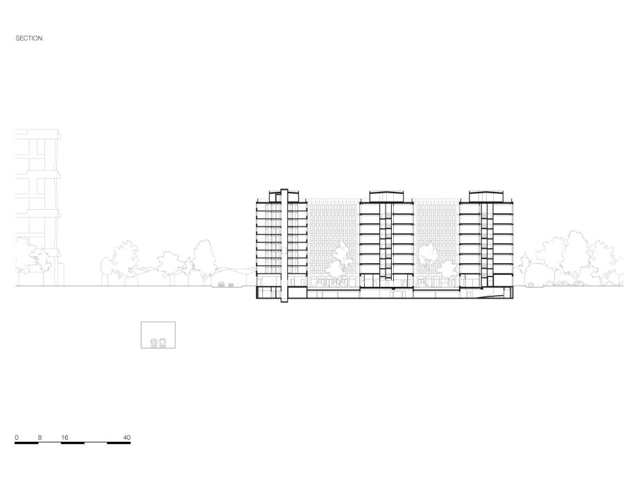 Offices occupy seven floors within the two southern blocks, while the hotel complex located on the main public square toward the north spreads over nine levels. The retail spaces are distributed along the ground floor, actively participating in the daily life of the public square. The upper floors are enriched with terraces connected to the hotel and the shops. To create a connection between the “Place du Front Populaire” (north) and the south of the lot, two nestled wide patios are created to accommodate greenery. These “urban patios”, characterized by verticality, generate landscape alcoves and enrich the urban space with green public areas, along “Rue de Fillettes. For the office section, the elevation grid provides flexibility for partitioning offices, with a solid portion of 43 cm every 1.35 meters. Precast concrete “T” elements form the building structure and façade, with no cosmetic additions. The 43 cm sections are aligned horizontally, concealing the slab structure and creating a uniform grid over the entire comb-shaped volume. Large vertical windows define the façades of these different volumes. The hotel is characterised by panoramic windows that amplify the feeling of space inside the rooms. From the “Place du Front Populaire”, ninety travel scenes illuminate the façade of the hotel.