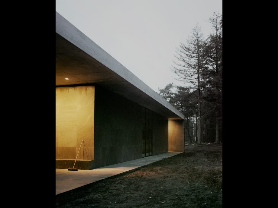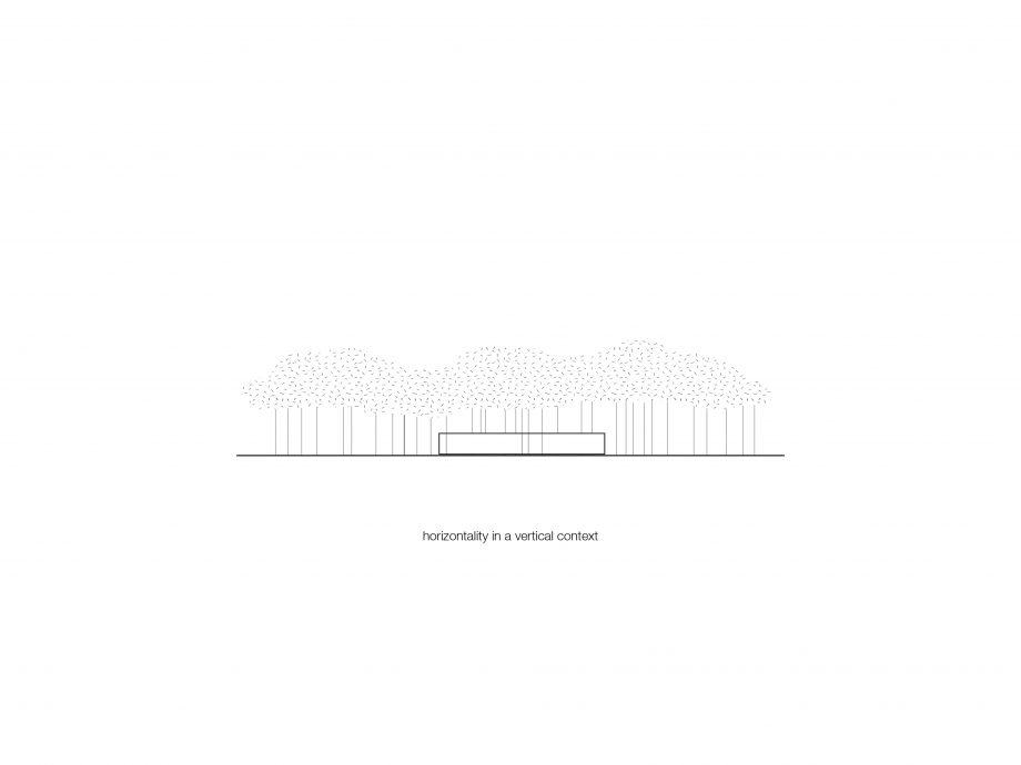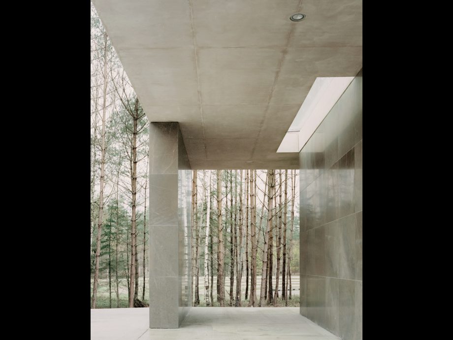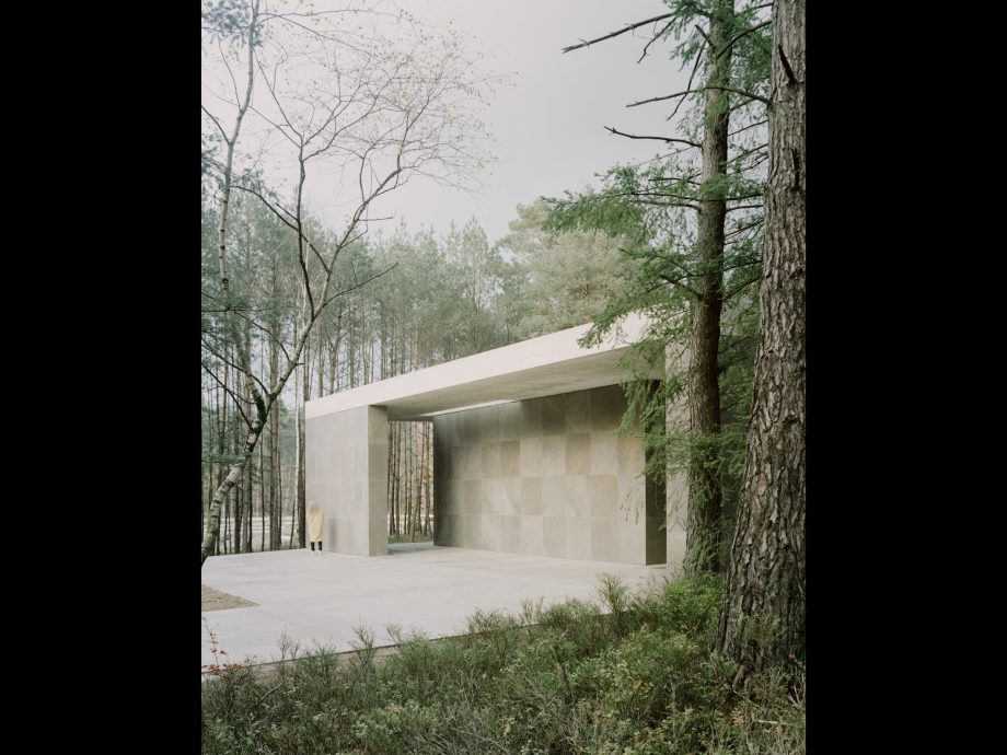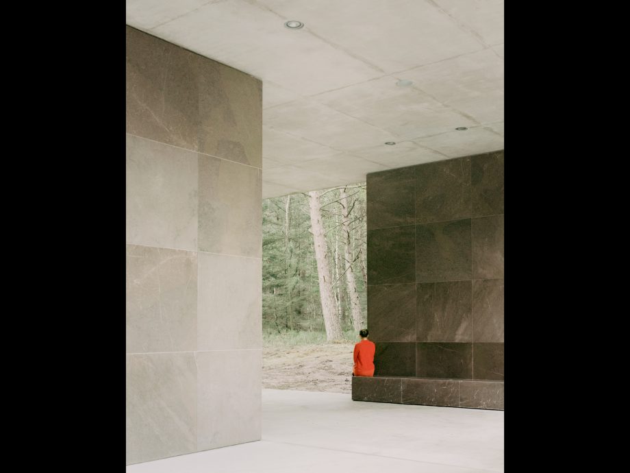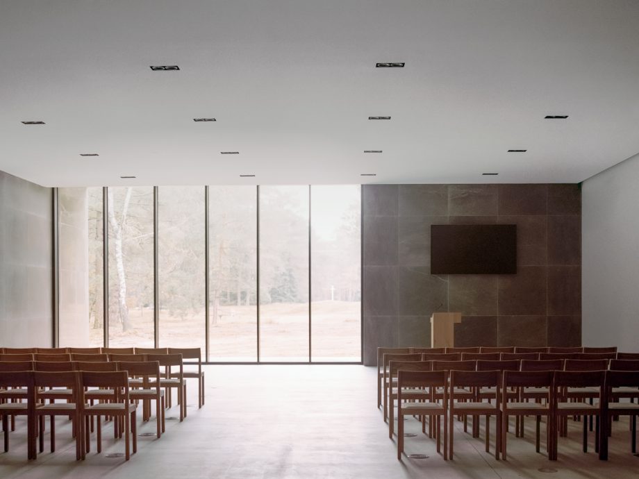 Loenen Pavilion is a multifunctional building dedicated to commemorating the Dutch victims during the Second World War and more recent international conflicts, located at the National Field of Honour in Loenen. The pavilion, with its 52 x 19-meter footprint, stretches along one of the five axes that are the foundation of the site, like a horizontal white line settled amidst slender birch and pine trees. The serene atmosphere and lack of intrusiveness have been achieved by sensitive architectural gestures, proposing a narrow and compact structure, intimate yet open and inviting; obscured by tree trunks yet in clear view. Strategically placed stone-clad walls and roof perforations exposing treetops and open skies accentuate the alternation between open and closed. Sightlines are directed inward, outward, and through to maintain the fragile aura of light and tranquillity, while the functions flow logically into one another. The main space is an auditorium dedicated to assemblies and funeral services for the nearby National Veterans Cemetery, opening up to a multi-purpose room serving both as exhibition and information space and finally a condolences area. Gently detached of any religious connotations, the pavilion conveys a calming natural atmosphere to its interiors, thanks to the unconventional open spatial configuration, the abundant natural light and the elegant choice of materials.