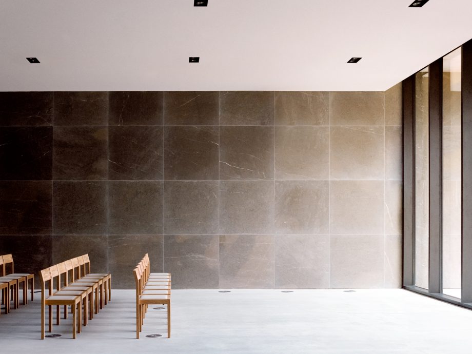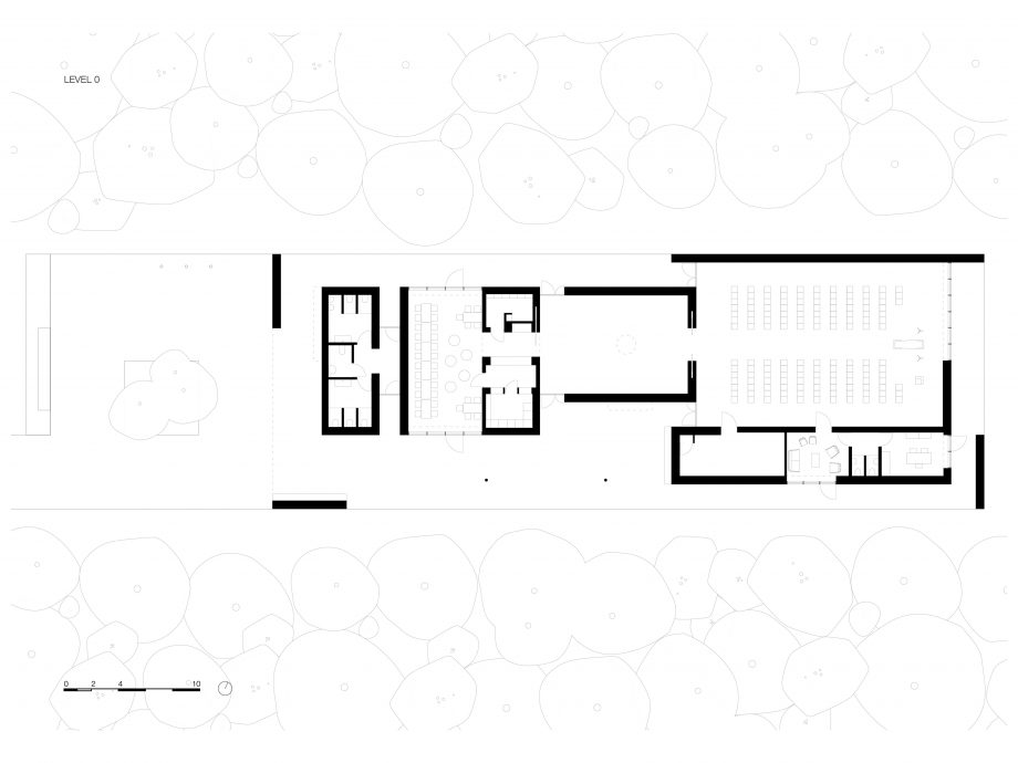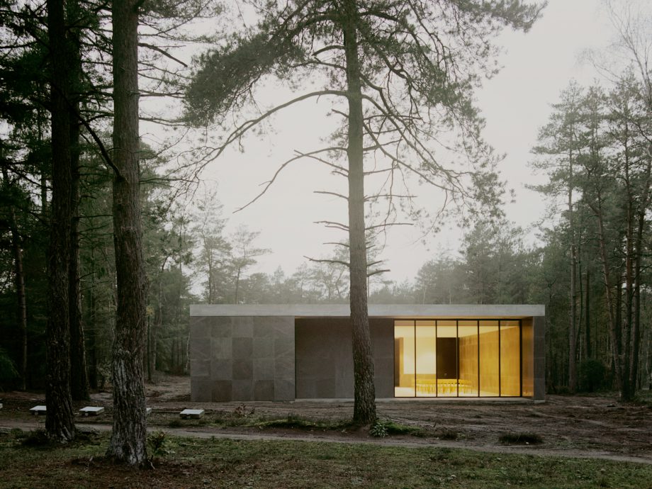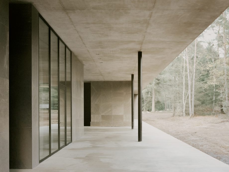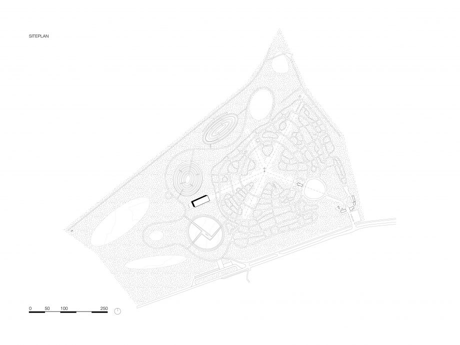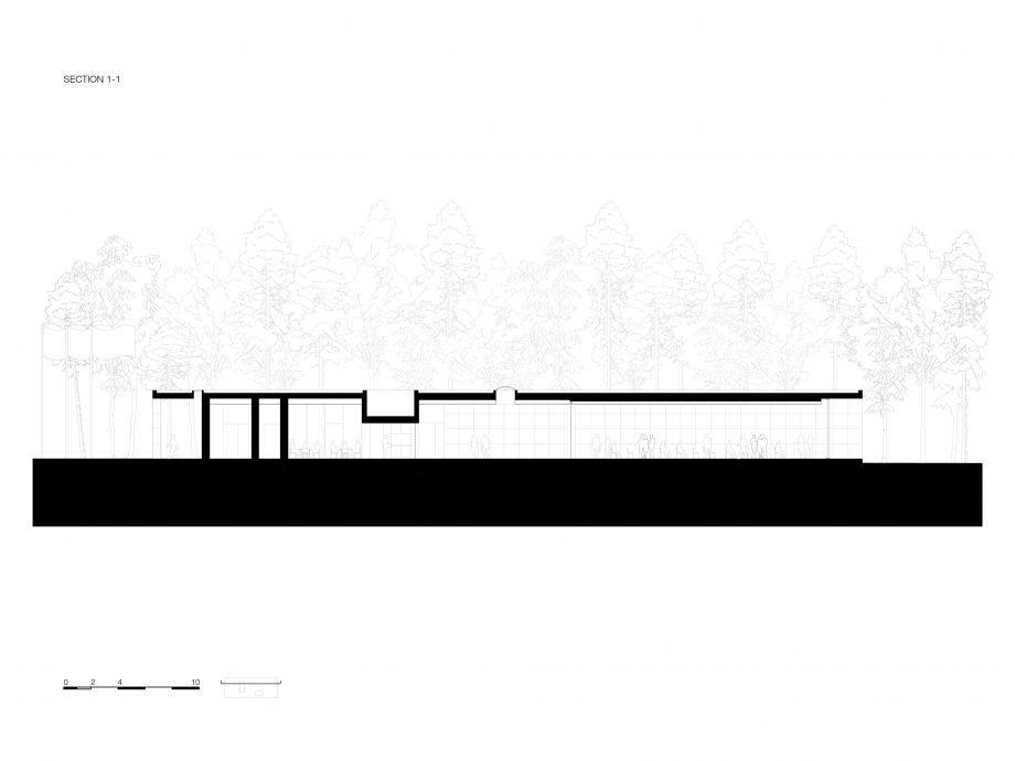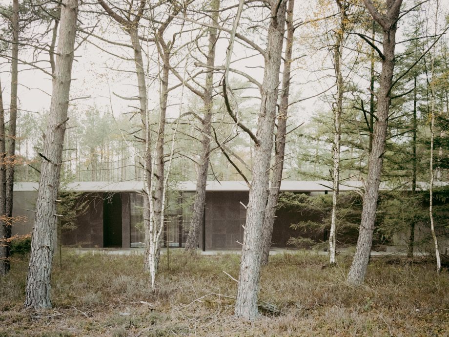 Loenen Pavilion is a multifunctional building dedicated to commemorating the Dutch victims during the Second World War and more recent international conflicts, located at the National Field of Honour in Loenen. The pavilion, with its 52 x 19-meter footprint, stretches along one of the five axes that are the foundation of the site, like a horizontal white line settled amidst slender birch and pine trees. The serene atmosphere and lack of intrusiveness have been achieved by sensitive architectural gestures, proposing a narrow and compact structure, intimate yet open and inviting; obscured by tree trunks yet in clear view. Strategically placed stone-clad walls and roof perforations exposing treetops and open skies accentuate the alternation between open and closed. Sightlines are directed inward, outward, and through to maintain the fragile aura of light and tranquillity, while the functions flow logically into one another. The main space is an auditorium dedicated to assemblies and funeral services for the nearby National Veterans Cemetery, opening up to a multi-purpose room serving both as exhibition and information space and finally a condolences area. Gently detached of any religious connotations, the pavilion conveys a calming natural atmosphere to its interiors, thanks to the unconventional open spatial configuration, the abundant natural light and the elegant choice of materials.