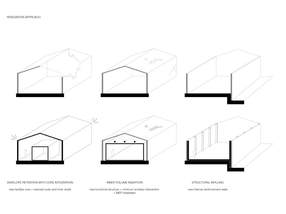 Three main approaches guide preservation and reuse: “ Inner volume insertion” introduces a new functional structure within the existing shell, allowing minimal interference with the exterior while reorganising the interior. “Envelope retention with core integration” restores both outer and inner facades and incorporates a new internal core to meet modern needs without compromising the building’s appearance, and the “Structural infilling” adds carefully designed elements that support and reinforce the existing structure, responding to its unique geometry and condition.