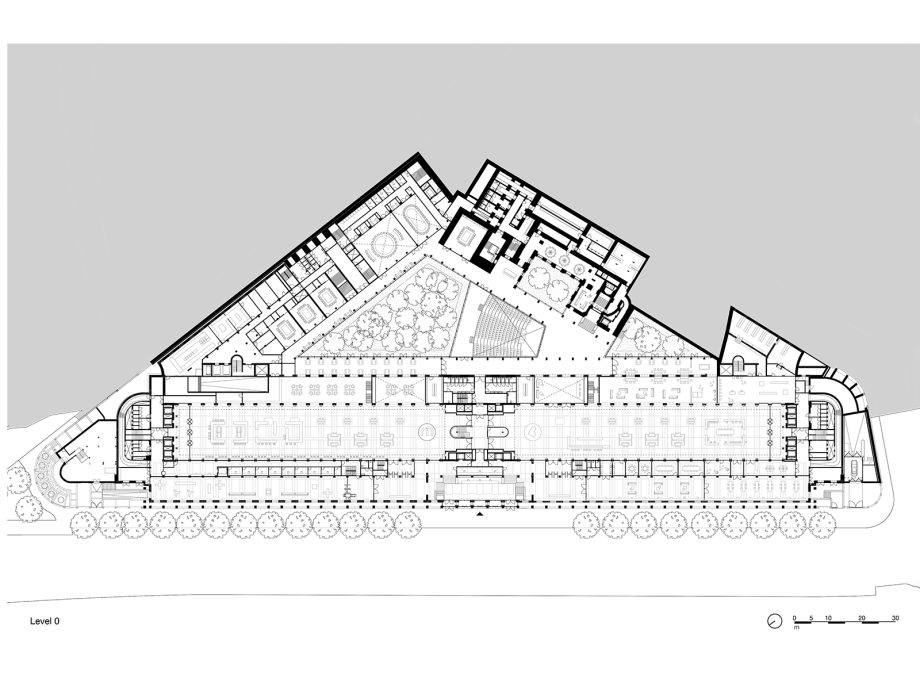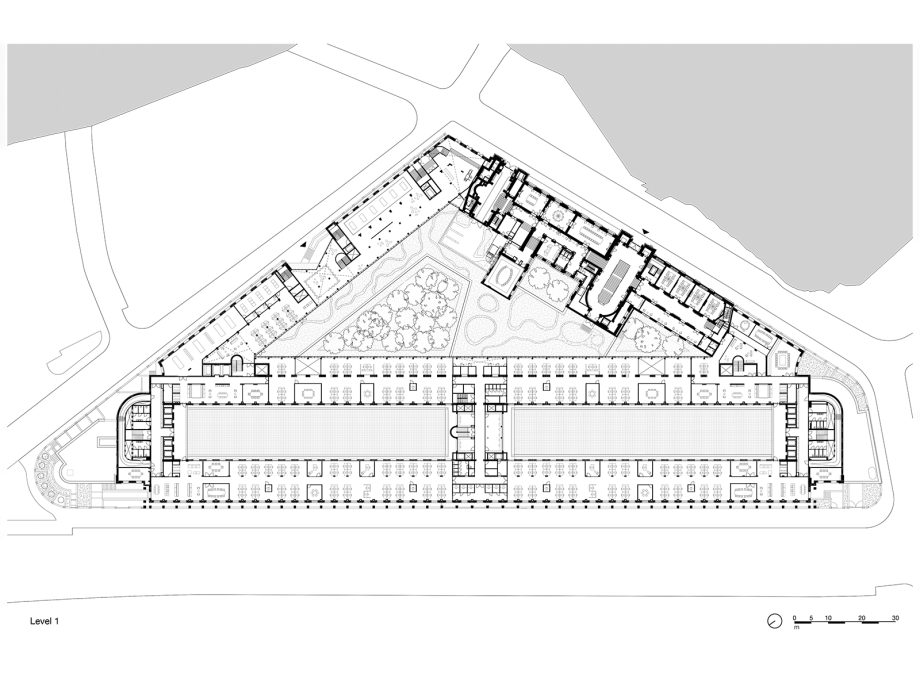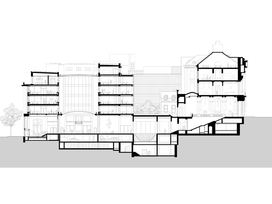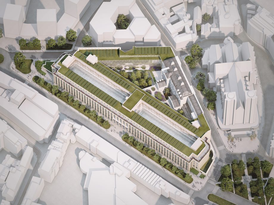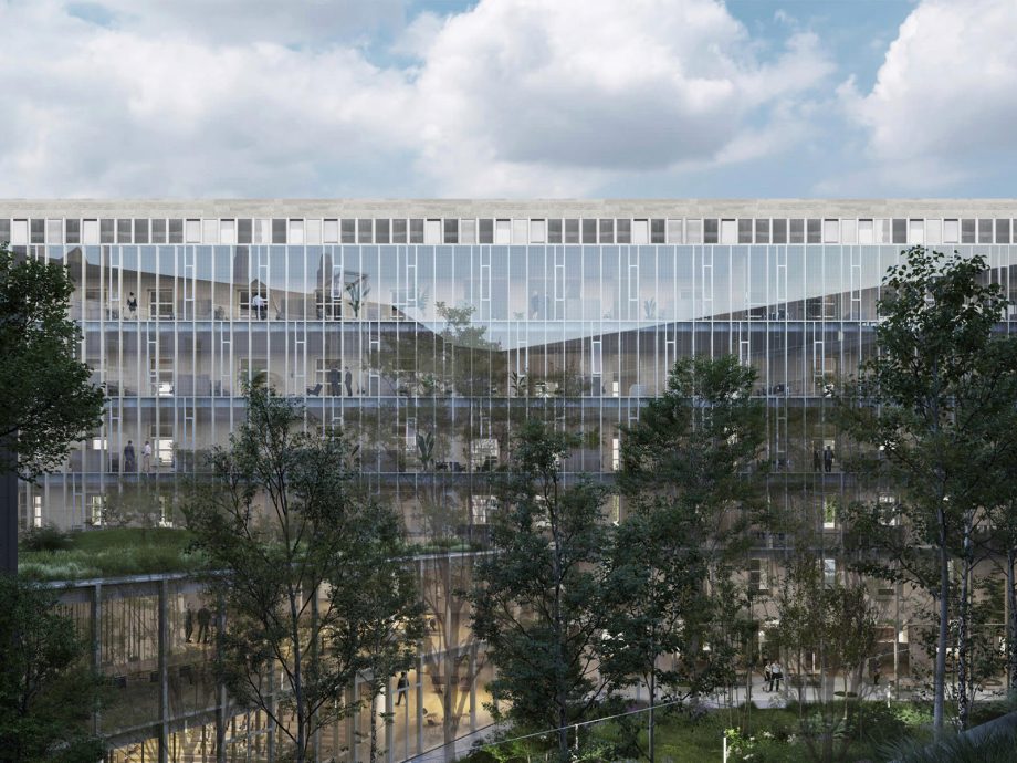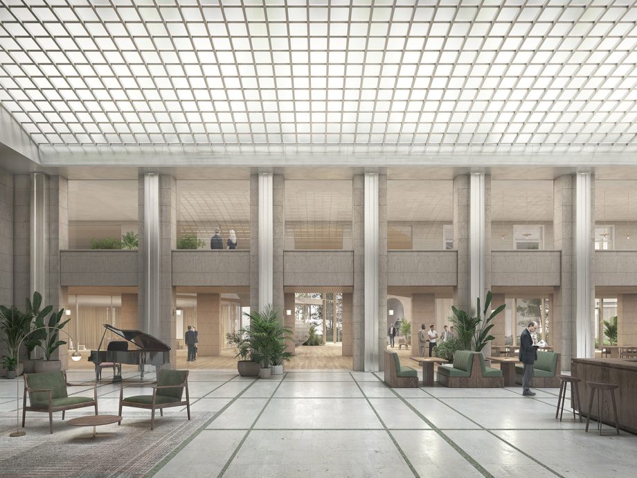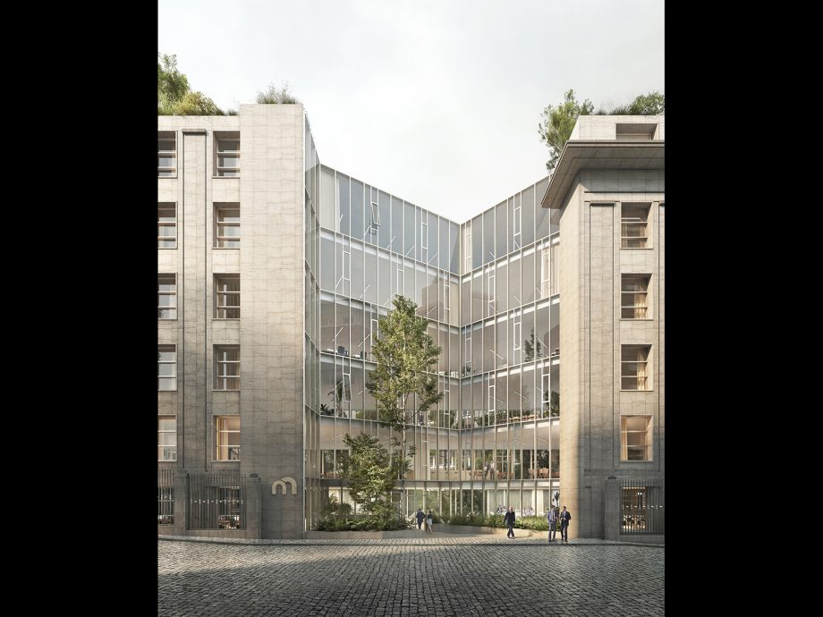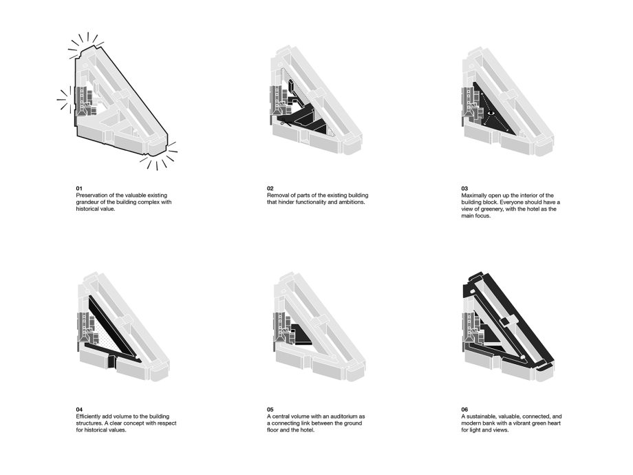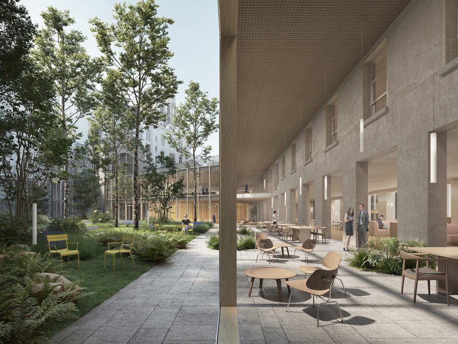NBB1, located on Boulevard de Berlaimont, consists of historic structures from the 1860s to the 1960s. The renovation will retain these valuable heritage components while transforming the space into a future-oriented environment. Key features include removing restrictive elements to create a spacious courtyard garden adjacent to the former counter hall and enhancing natural light and green views. Strategic voids will improve vertical connectivity, and some ground-floor areas will have double-height ceilings to increase spaciousness. The office wings will be expanded to ensure all workstations face the garden, with a new transparent facade blending interior and exterior spaces.