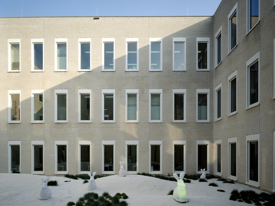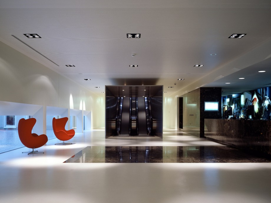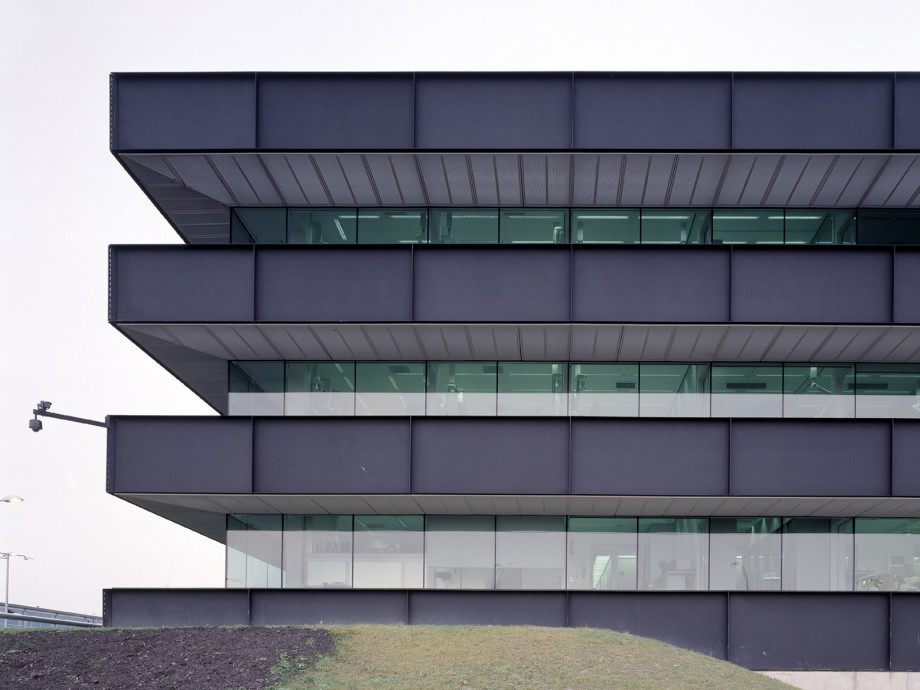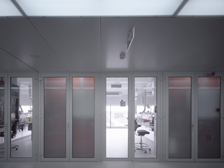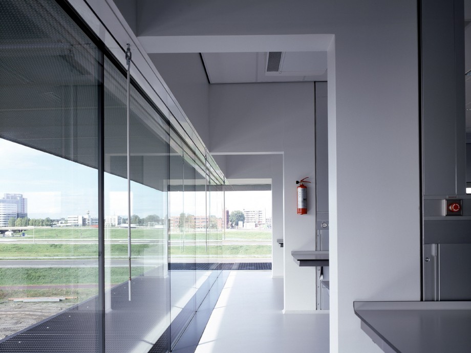 Located in Ypenburg, The Hague, the NFI is a glazed volume in a steel box set in a typical Dutch motorway landscape. The building is both a high security bulwark and an eye-catcher. The NFI programme yields a corridor of almost 1100 metres long, lined on one side by cellular offices and on the other by laboratories. This required corridor was ‘folded up’ to produce a building on four levels, one of which is underground. The programme is arranged around six patios and in such a way that the size and position of the individual laboratories can be adapted to changing circumstances; these laboratories are located along the outer perimeter of the building. The steel box acts as solar shading, where light penetration is different on each side because the steel cantilevers around the building are not equally deep. The architectural and spatial expressions of the interior are determined by materials and colour.
