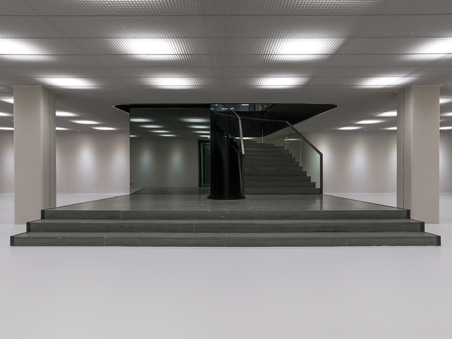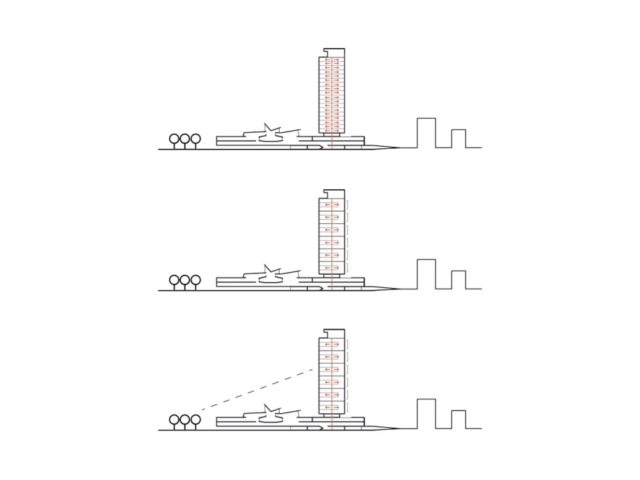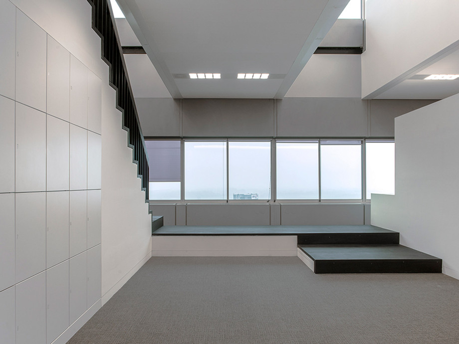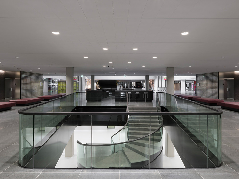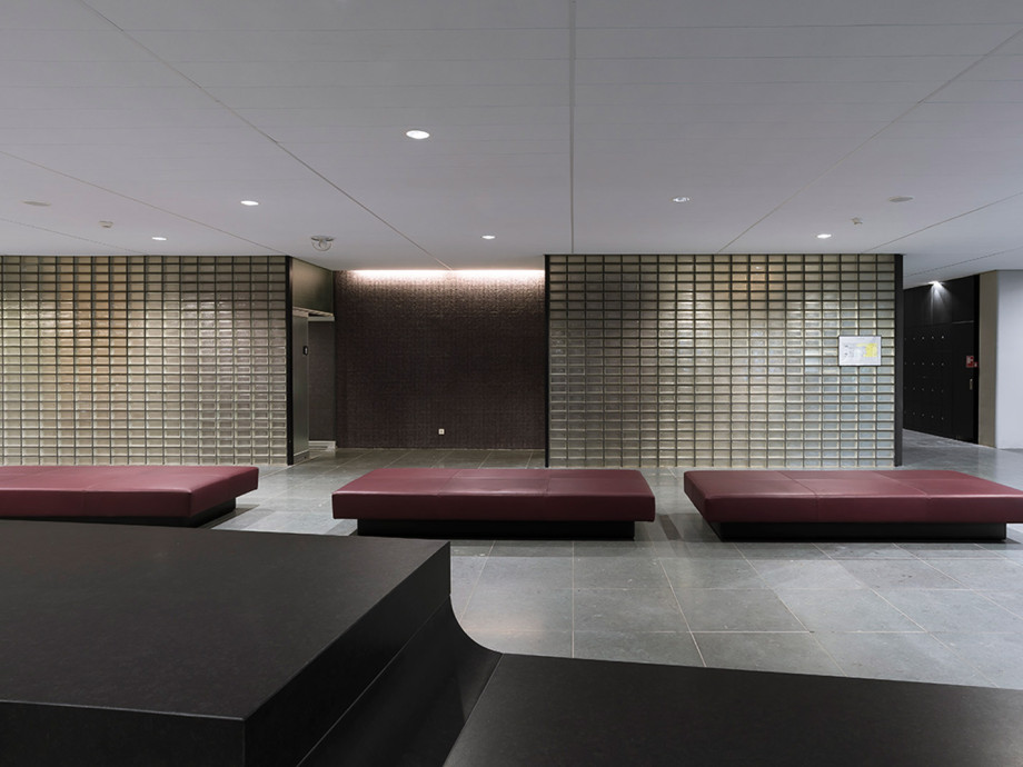 The challenge of the renovation project was in the correct reading of the original spatial quality of the plan, in freeing the plinth from the security barriers and in updating the building to the contemporary needs. KAAN Architecten’s intervention achieved an extensive openness of the three levels of the horizontal plinths. In the eighteen-storey office tower the rooms are replaced by a flexible working space and are clustered in three floors each. Lifts stop every three floors and two flights of stairs serve each independent cluster.