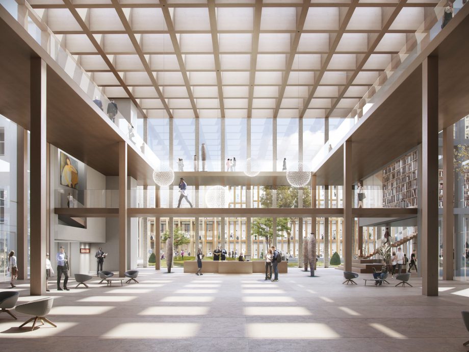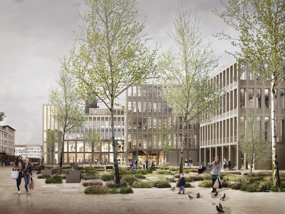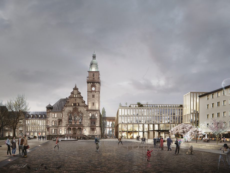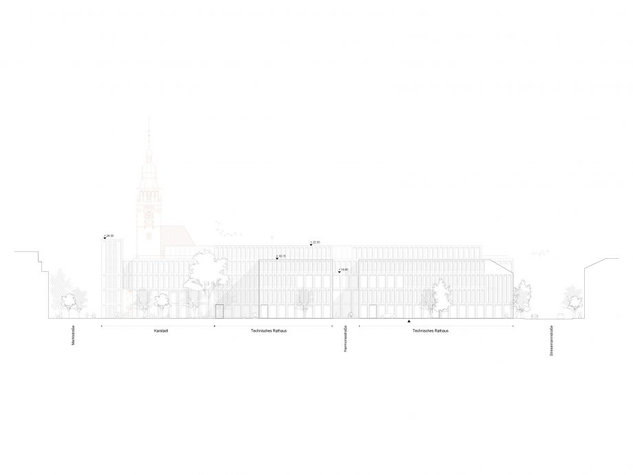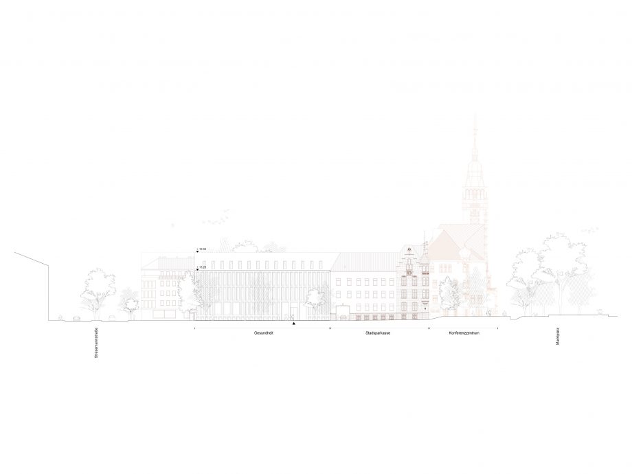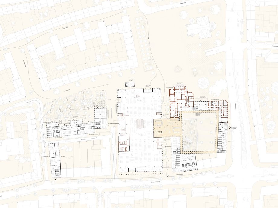 The design of the new town hall in Mönchengladbach completes an ensemble of existing buildings with very different structural interventions. It creates a new piece of accessible urban space, instead of another typical administration building. A central foyer is located in the heart of the new town hall. At first glance, the foyer shows and opens up all areas accessible to the public: the library, the café, the congress centre, the department store and the green courtyard. A green passage leads from the market and the street directly into the foyer to the main entrance of the new town hall on the ground floor level. At night this part of the greened outside space can be closed off for visitor traffic. On the second floor, an inner central axis connects the work areas of all three town halls, which together form the new town hall of Mönchengladbach, like a backbone. This is where employees can meet and exchange knowledge.
