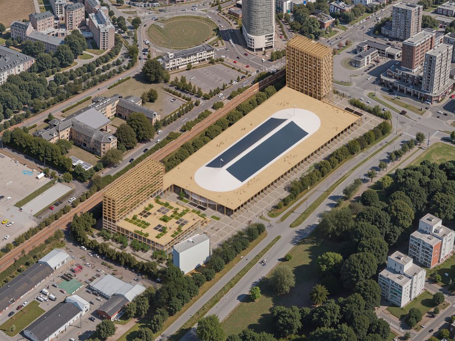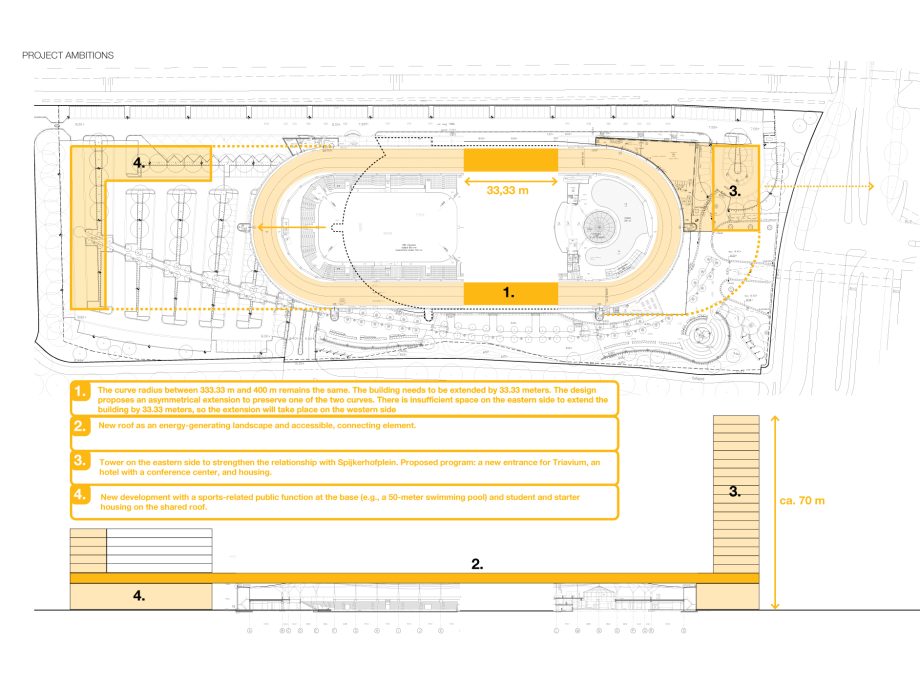 Among these interventions, and in relation to them, is a sports complex, the Triavium. It is a locally well-known ice-skate rink featuring a hockey stadium and restaurant facilities. The existing Triavium includes a long-track ice rink measuring 333.33 meters. While it meets regulations, there is a desire to extend the track to 400 meters while keeping the hockey stadium tribune and roof in place. Improving the rink and the area offers several opportunities: improved access via the nearby station allows the parking area at the Triavium site to become a multimodal hub, with connections through or alongside the Triavium; there is space available to expand the Triavium complex both at the front, with the potential to create a new address on Spijkerhofplein, and at the rear. The site is highly suitable for iconic high-rise buildings with features that attract and appeal to modern urban residents.
