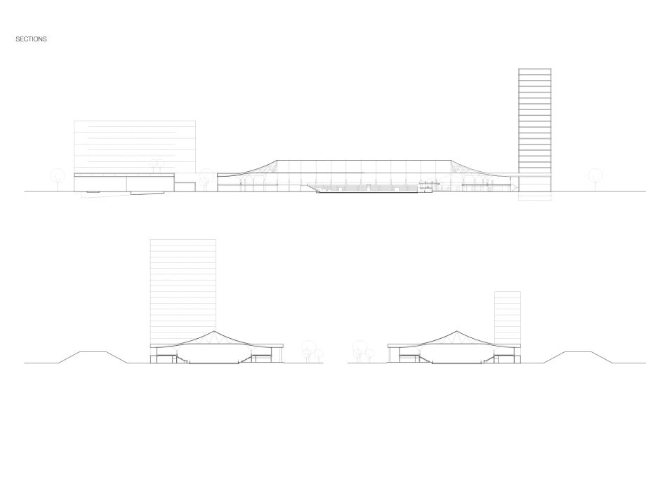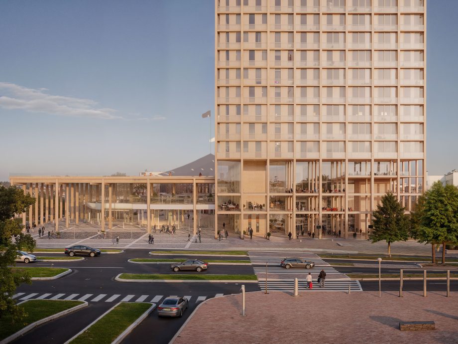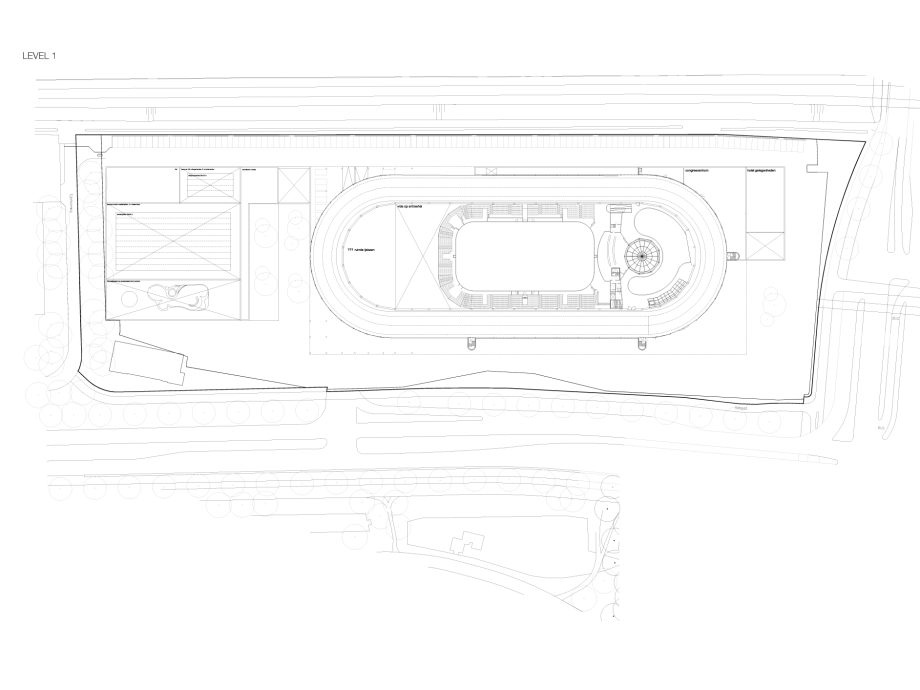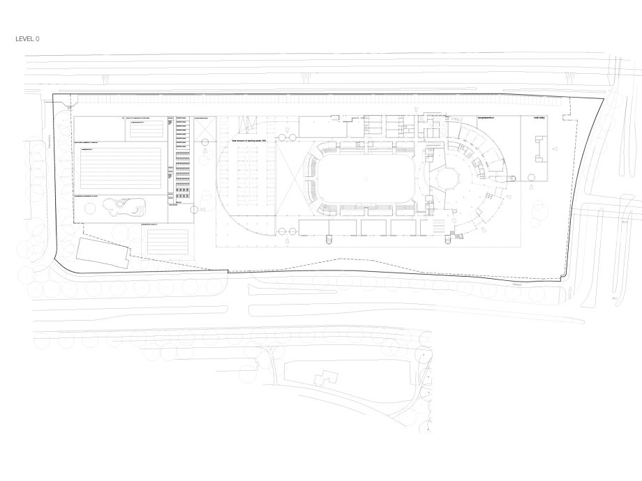 Additional facilities are built on the site to enhance the location’s business model: a swimming pool complex consisting of a 50m bath and several recreation baths, a student housing complex, a hotel with congress center, and a residential tower. A large, accessible roof deck provides connection between the program parts and offers a stunning view on the surroundings. The timber load-bearing structure takes advantage of the available wood industry in the surrounding area.