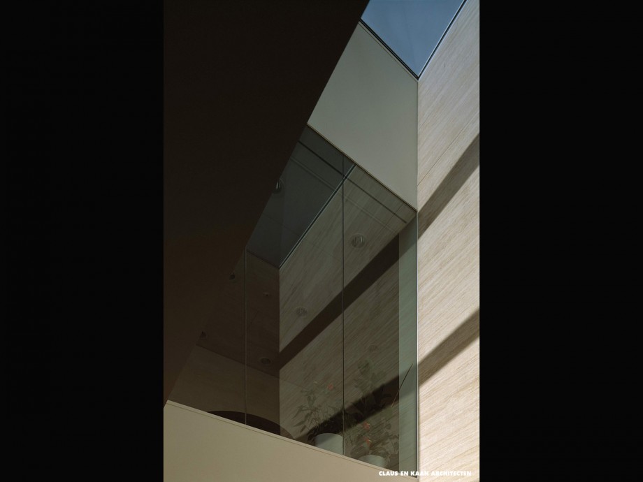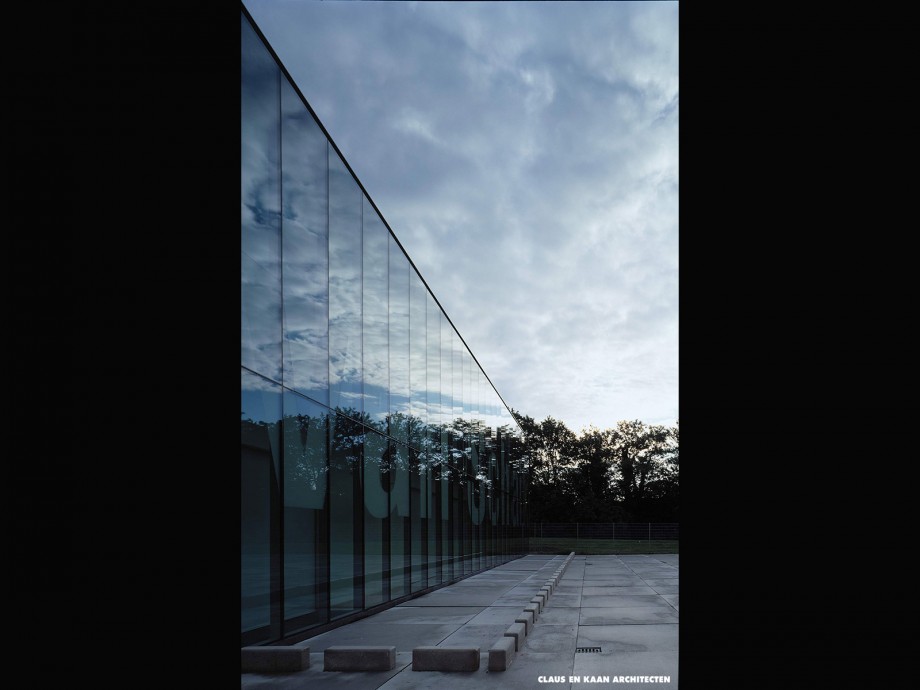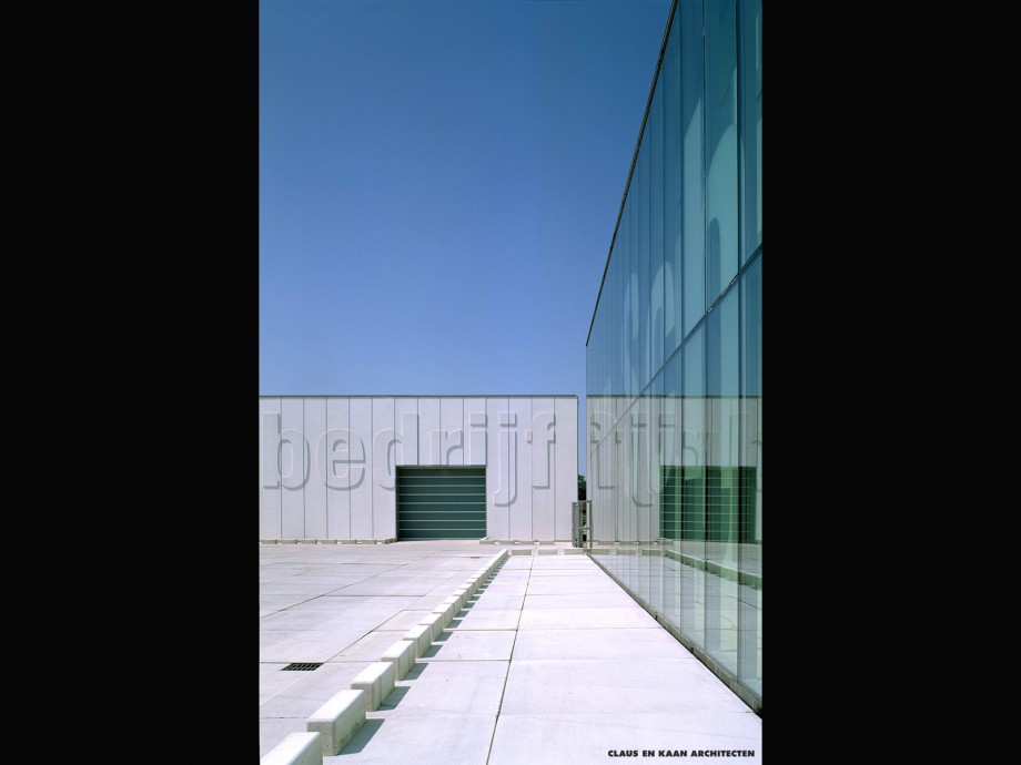 The car park is a clean and open service space. The two buildings bordering it are a linguistic as well as a compositional ensemble: the glazed façade of the office is imprinted with the company’s name, while its field of operation – bouwbedrijf – is in relief on the concrete wall of the warehouse. The lettering incorporated into the façade ensures that no illuminated signs or neon letters disrupt the architectural order. The design effectively represents the company through its volumes rather than iconic formalism.