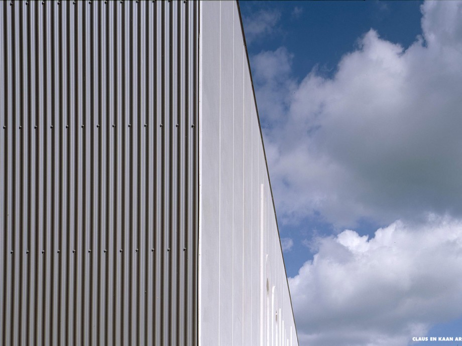 The project consists of two orthogonal volumes that turn their backs on a clutter of outlying sheds. One volume is for storage, the other offices. The latter has two faces: one quite closed façade, fronting onto the car park; the other with a glazed south-facing façade that overlooks the work yard. Behind this glass screen is a double-height gallery that gives access to the offices.