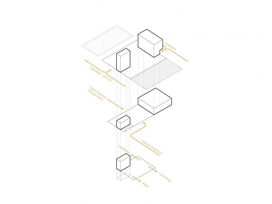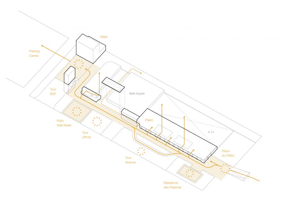 Located under the esplanade of the most famous business district in Paris, the underground slab of La Défense has been designed to separate the functions for the users from technical or logistical purposes. KAAN Architecten proposal highlights the inherent beauty of these residual volumes, activating various flexible spaces and making them accessible after being unused for years.