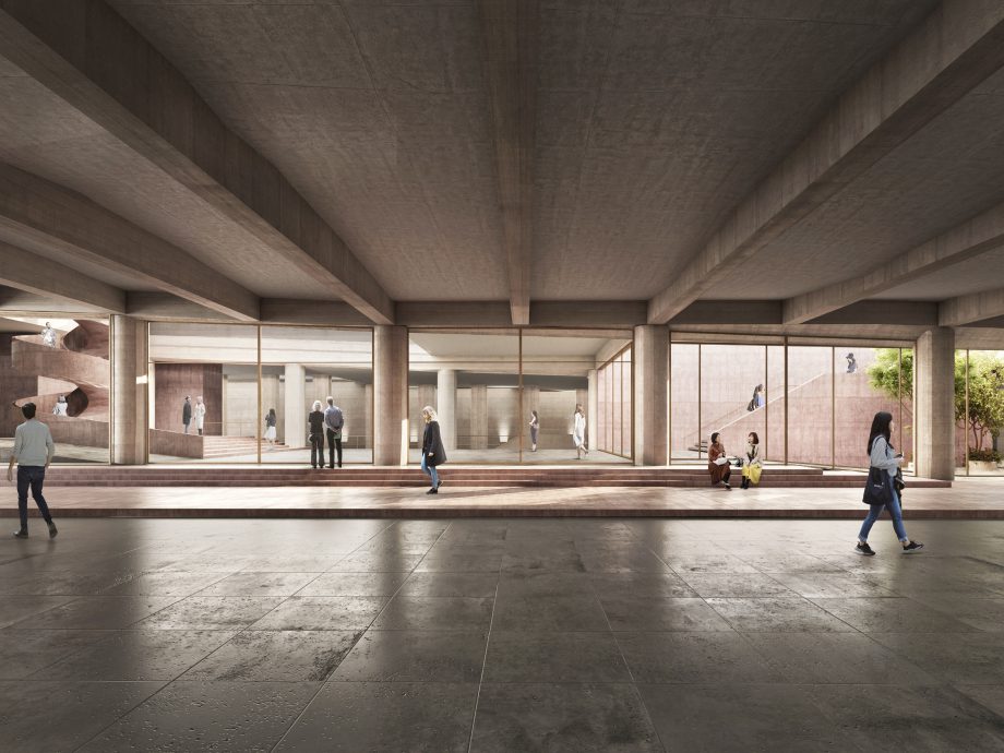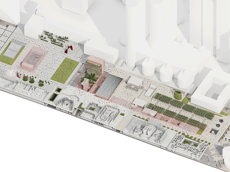 The project articulates different public squares, while the main access is located in Place de la Statue, allowing visitors to enter the central volume of the ‘Cathédrale’ through a wide staircase and a garden, creating a green oasis in the heart of the district. Meanwhile, La Voie des Sculpteurs constitutes the backbone of the project, creating a real seam between the surface and the underside of the Esplanade de La Défense. To diminish the infrastructural character of this space, natural light is brought in by piercing the slab of the Esplanade, coherently to the functions located on the surface, and further establishing direct connections between the levels. The stratification between old and new is evident through the use of tinted concrete, as the project weaves a red thread, both symbolic and material, between the different volumes and accesses.