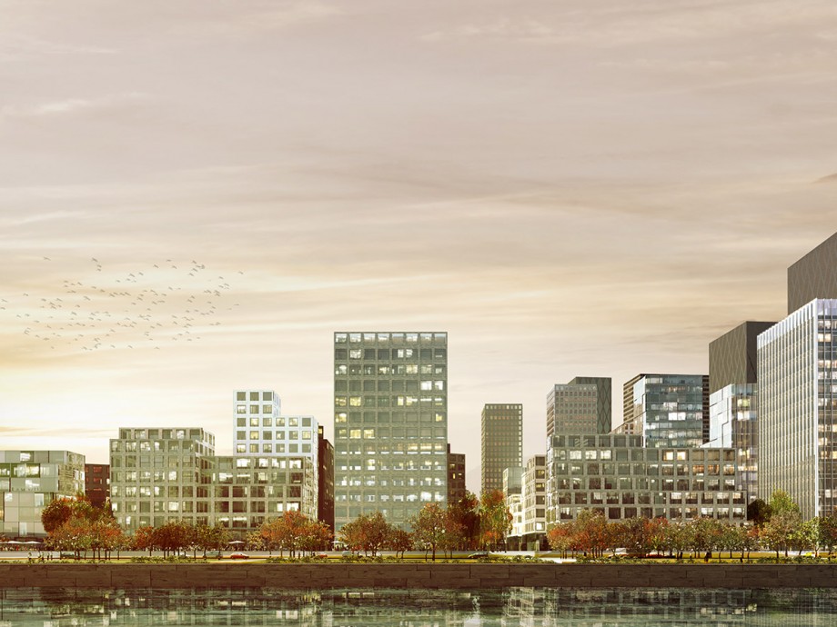 The 350 x 300 meters plot is half-covered by two towers, residential and retail buildings and by a 20% of green areas. The height of the new development slopes down from 100 to 6 meters to gain the best facing South direction and the buildings’ views are opened towards the highest tower of the CBD. The landscape is composed by a big green cross connecting North-South and East-West, by boardwalks, private courtyards and a sport area located along the navigable river.