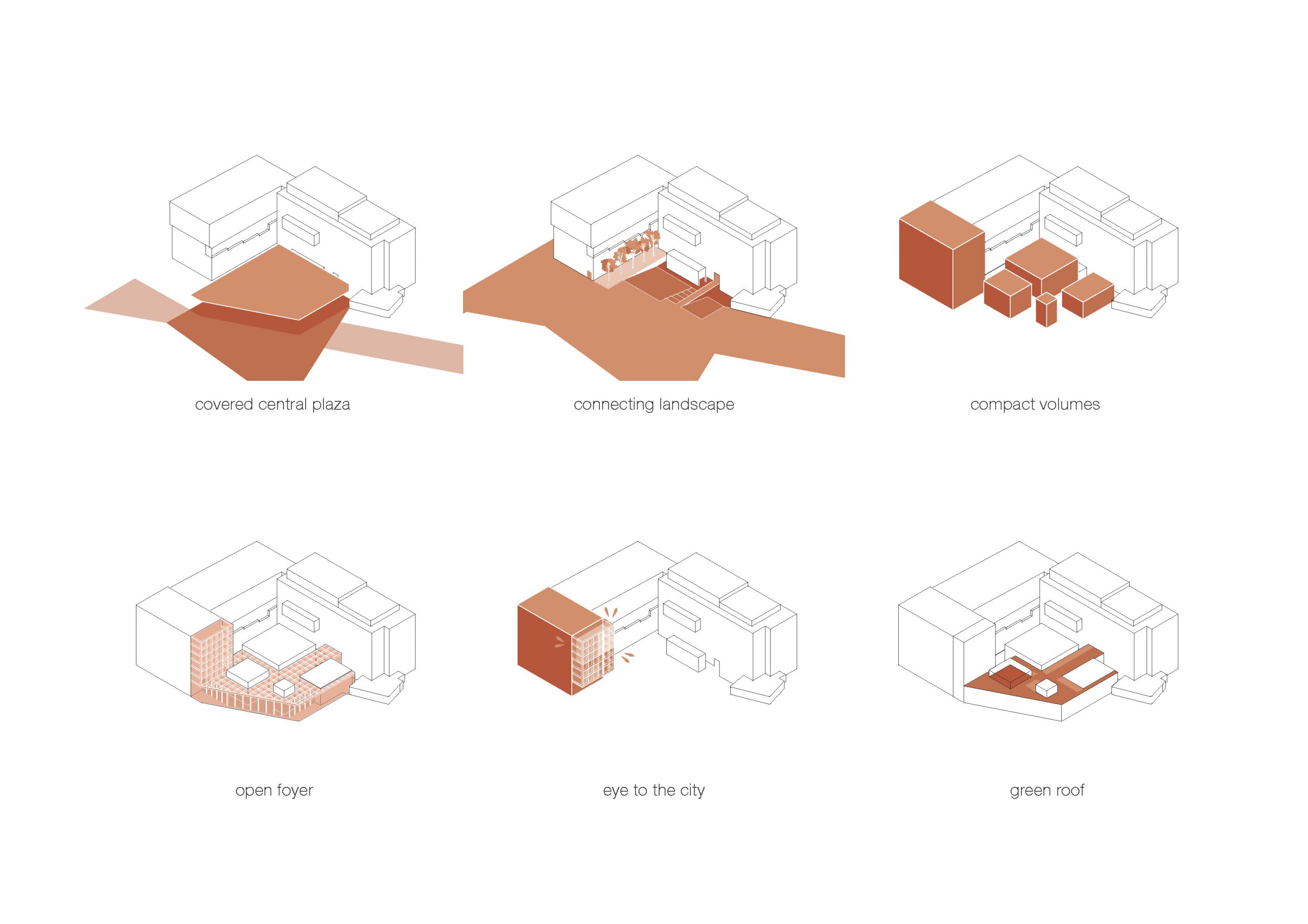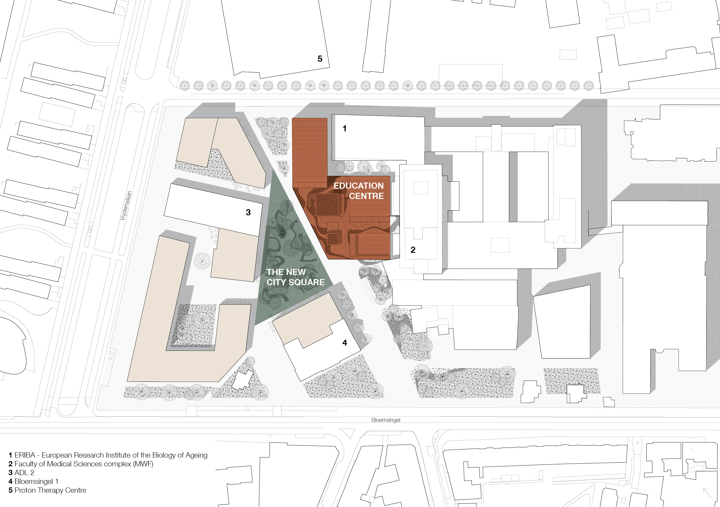 In the past, the gradual expansion of the campus created a sprawling network of buildings with complex internal relations. The new Education Centre will re-establish the flows and clearly define the public space, becoming a central accessible core for the University and functioning as the main entrance for the Healthy Ageing Campus. The complex will rise between the ERIBA building, the Faculty of Medical Science complex and the new Proton Therapy Centre of the University Medical Center Groningen, joining a cluster of existing structures with shared facilities that provide access to the clinic, research facilities and companies.