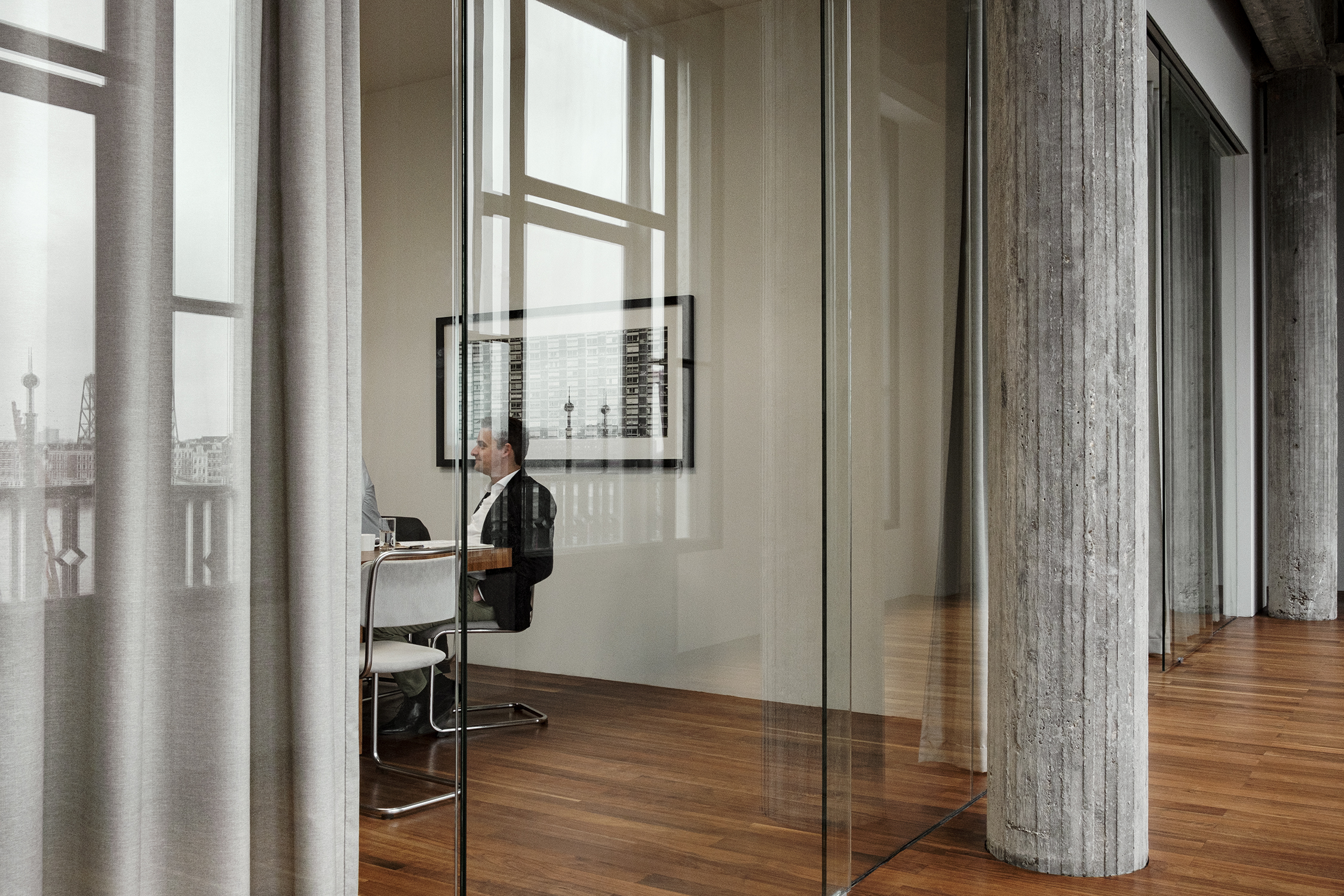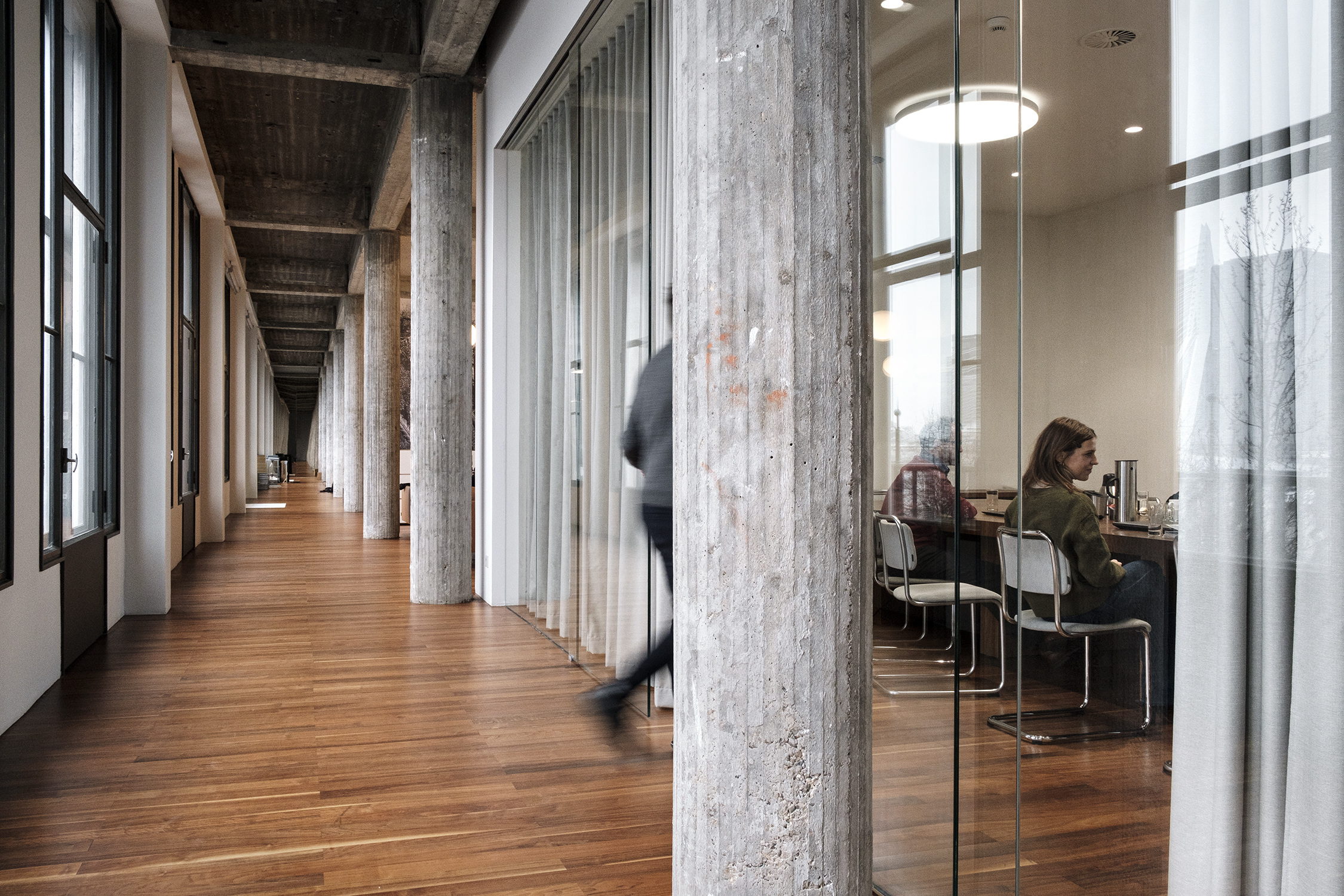 All of this takes place in a photogenic space flooded with daylight coming in from both sides, with long corridors and passages allowing Powilleit to experiment with composition. Working, meeting and leisure spaces are all effectively connected, producing a variety of different shots ranging from still lifes to overviews.