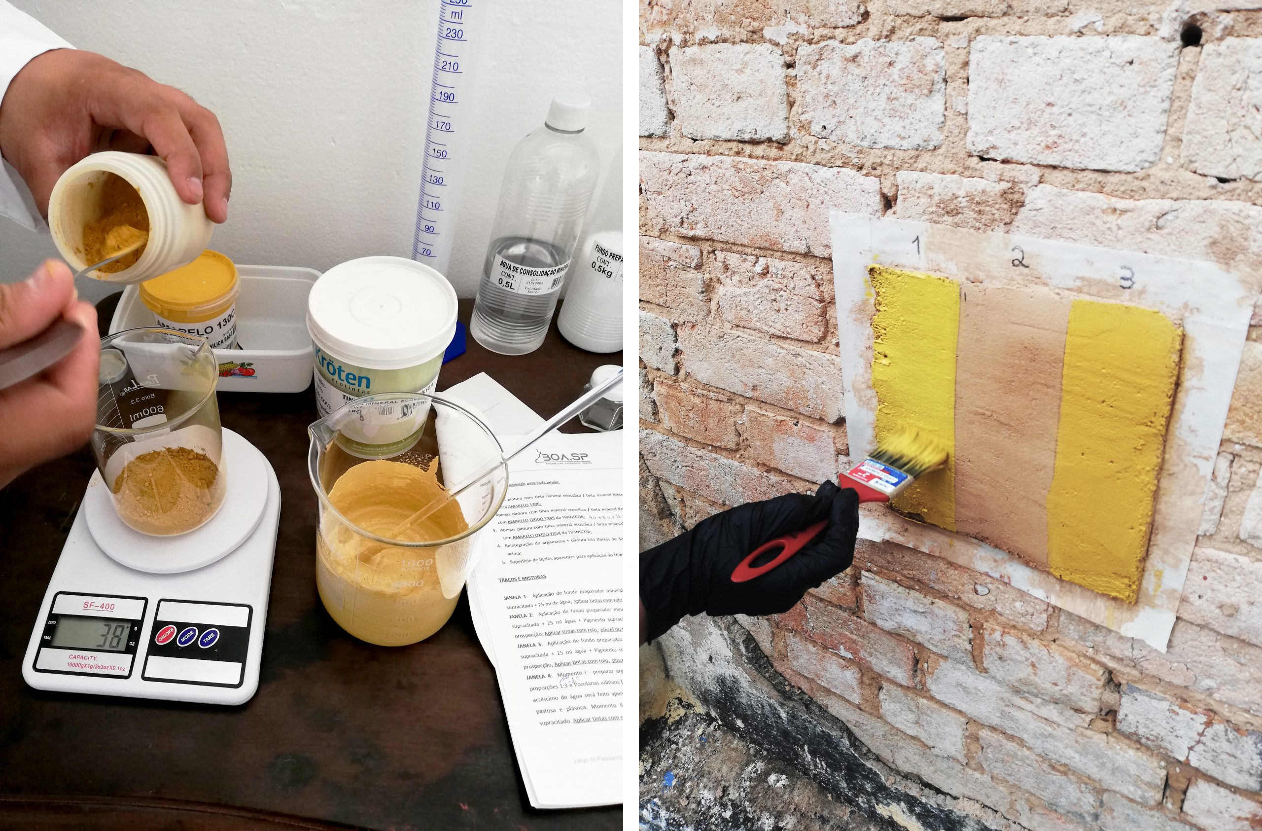 All application tests were carried out within sampling windows which allow controlled and comparable results, to obtain the best solution for the originally painted facades, as well as to ensure the conservation of exposed brick masonry.