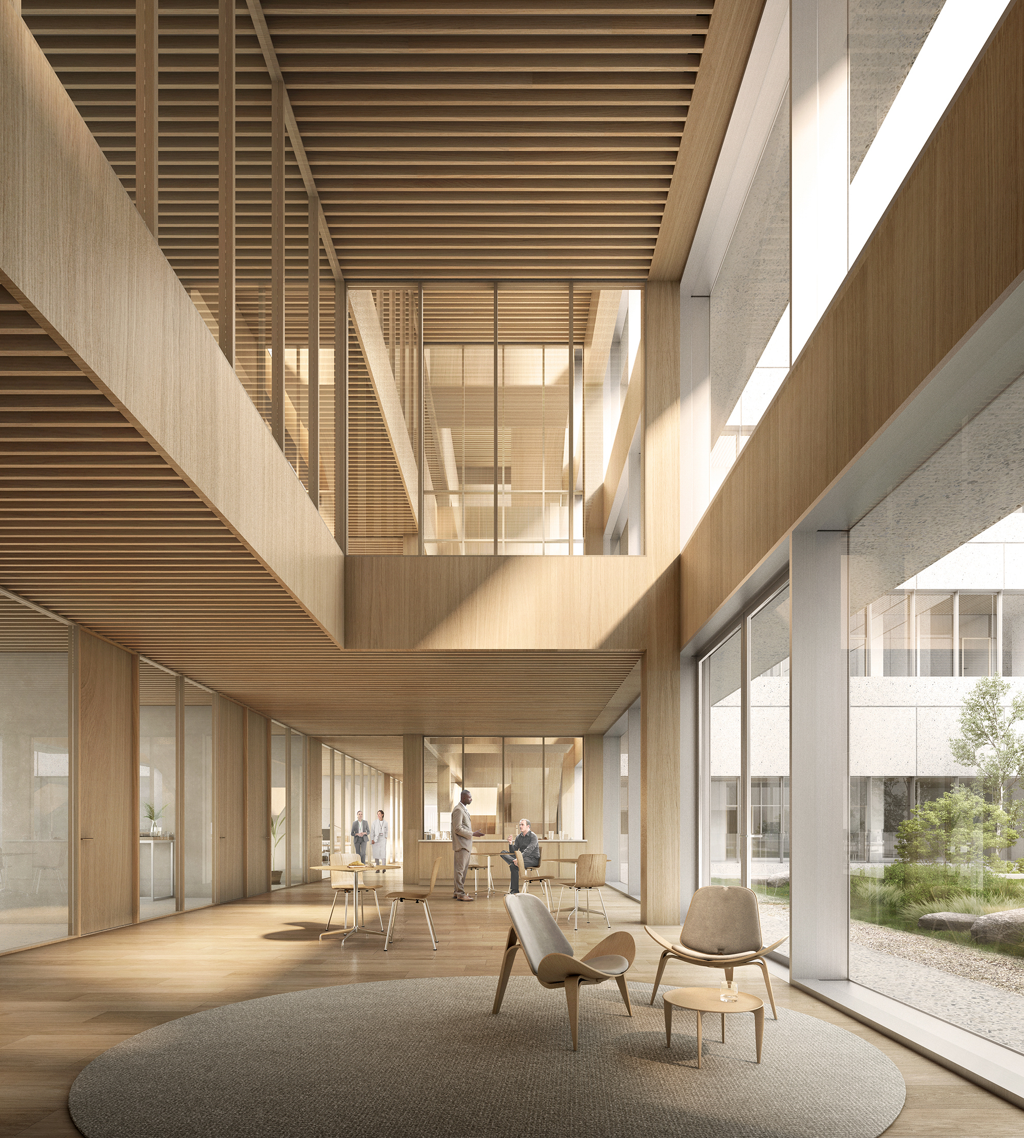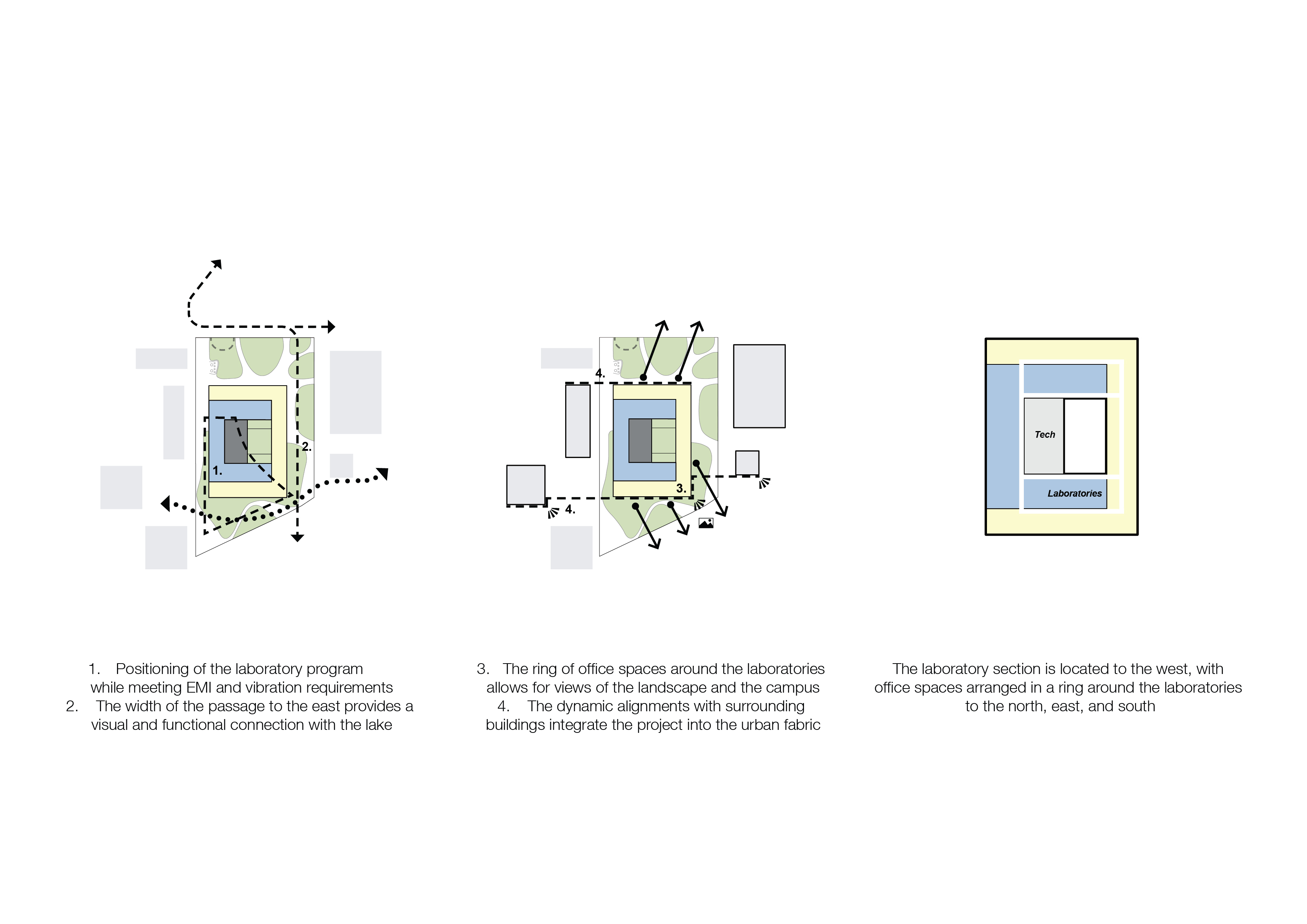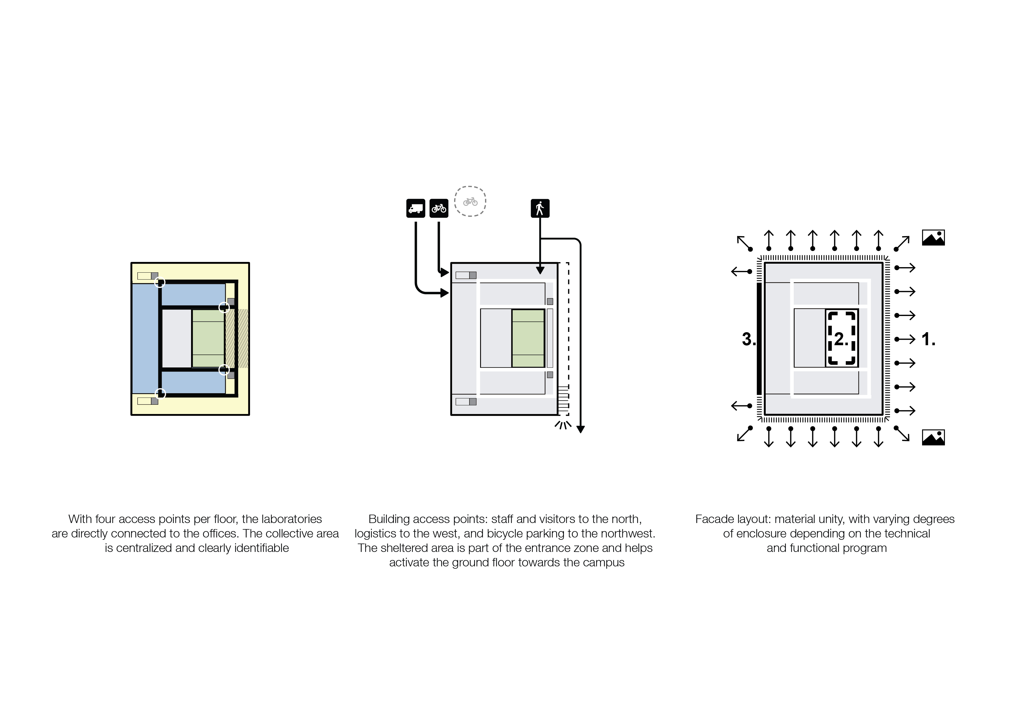 The building’s design centres on a precision-focused concept, similar to that of a Swiss clock. A C-shaped laboratory volume encircles a central technical “silo” that is isolated from the main structure to reduce vibrations and disturbances. This core technical space, critical for housing equipment, is layered by circulation, preparation, and experimental areas, ensuring optimal operational efficiency. Surrounding the lab is a modular wooden office structure that connects the building to its natural surroundings, offering expansive views of the campus, Lake Geneva, and the Alps.