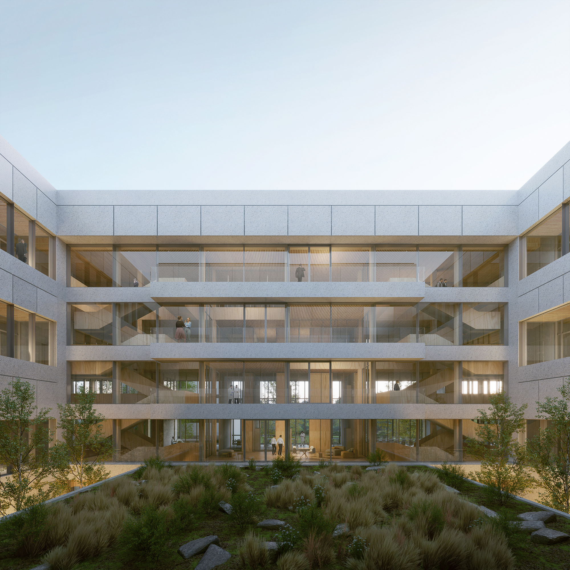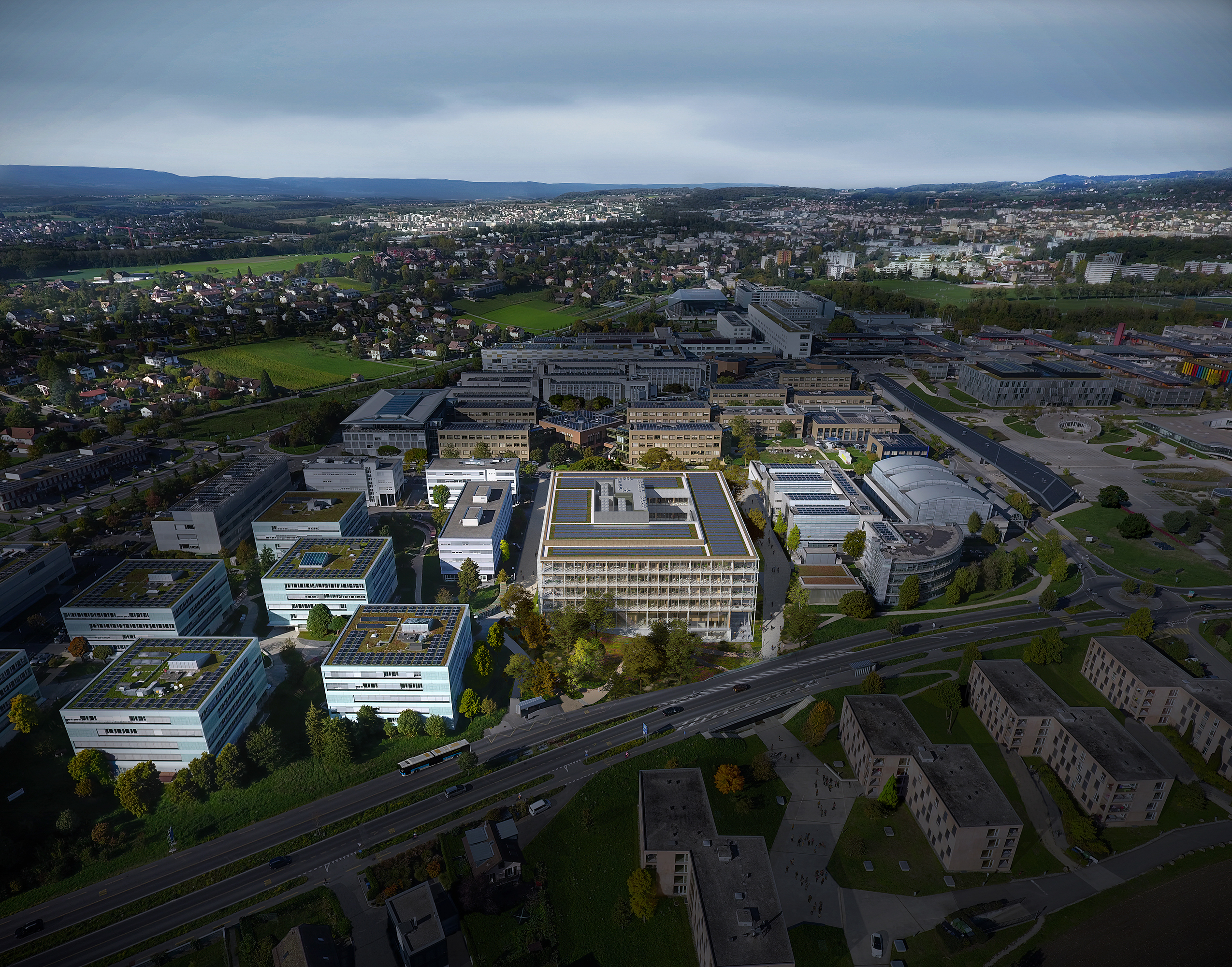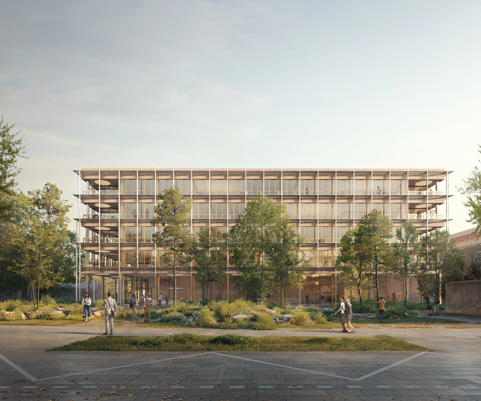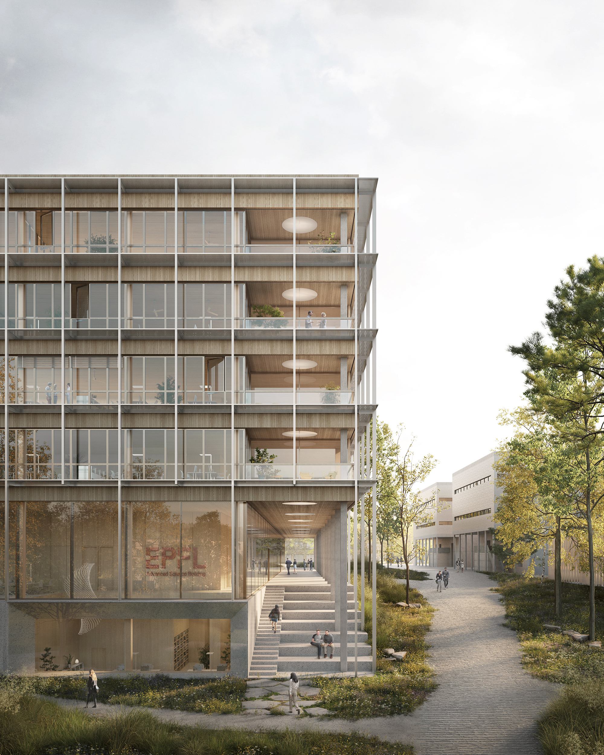 The ASB will replace the current Colladon parking lot, adding seven laboratory and office space floors, two of which are underground. Designed to support 26 research groups and over 500 users, it meets EPFL’s stringent research demands while fostering a collaborative environment. Sustainability is central to the design, with features like a compact form to reduce thermal loss, automated exterior blinds for solar control, and rooftop photovoltaic panels. Materials are selected to minimise greenhouse gas emissions and include local resources, with hybrid wood-concrete floors to lower environmental impact without compromising thermal inertia.