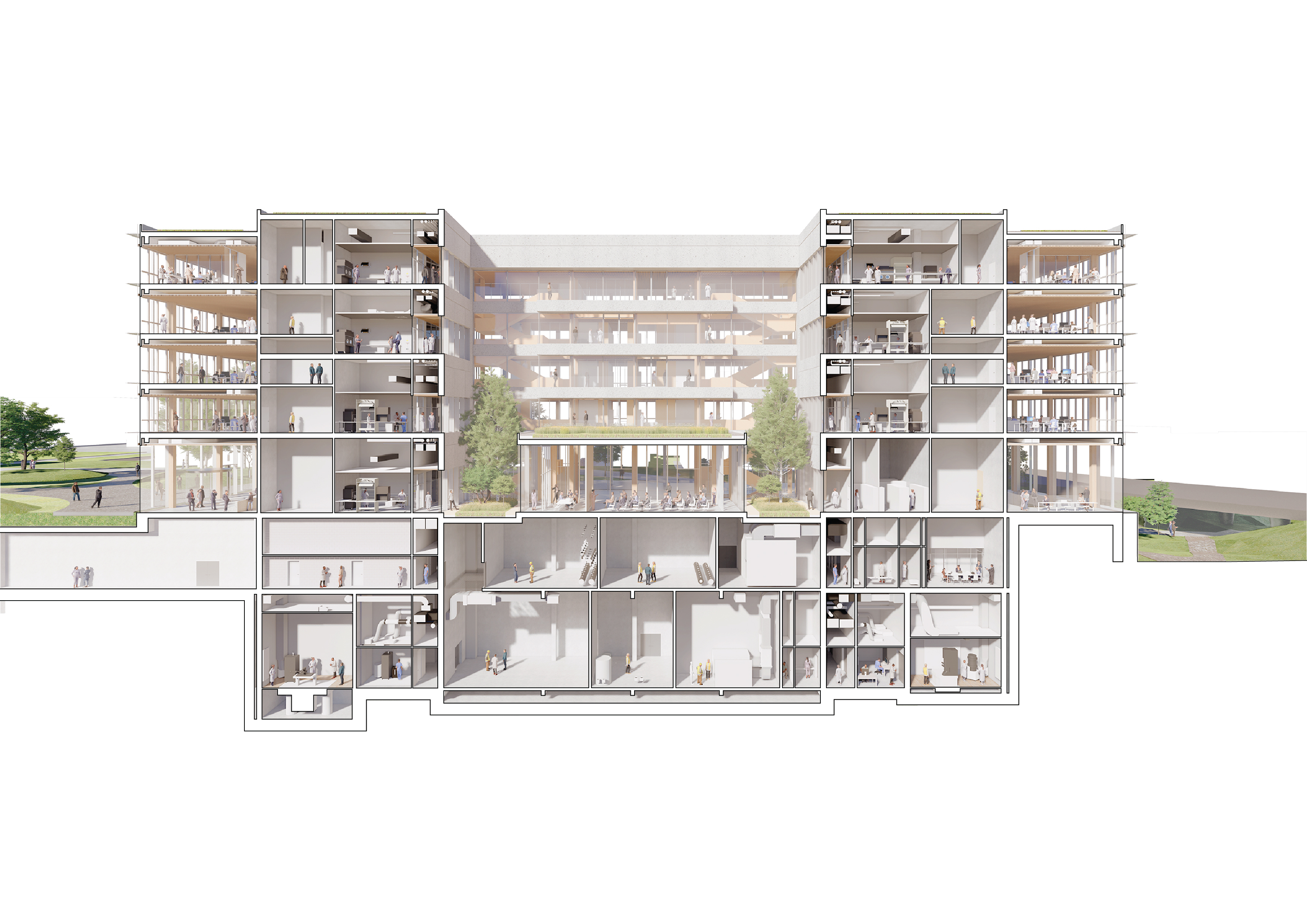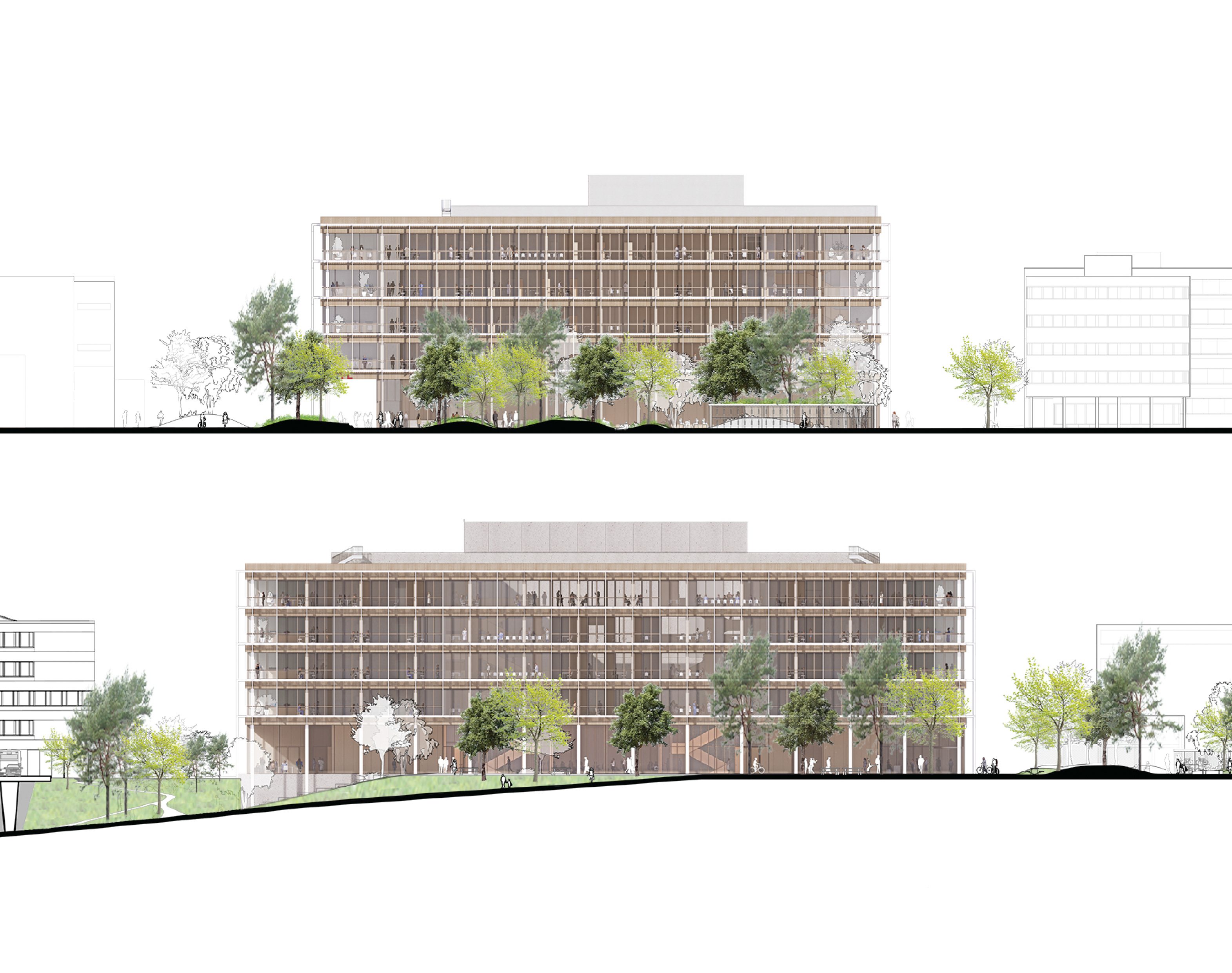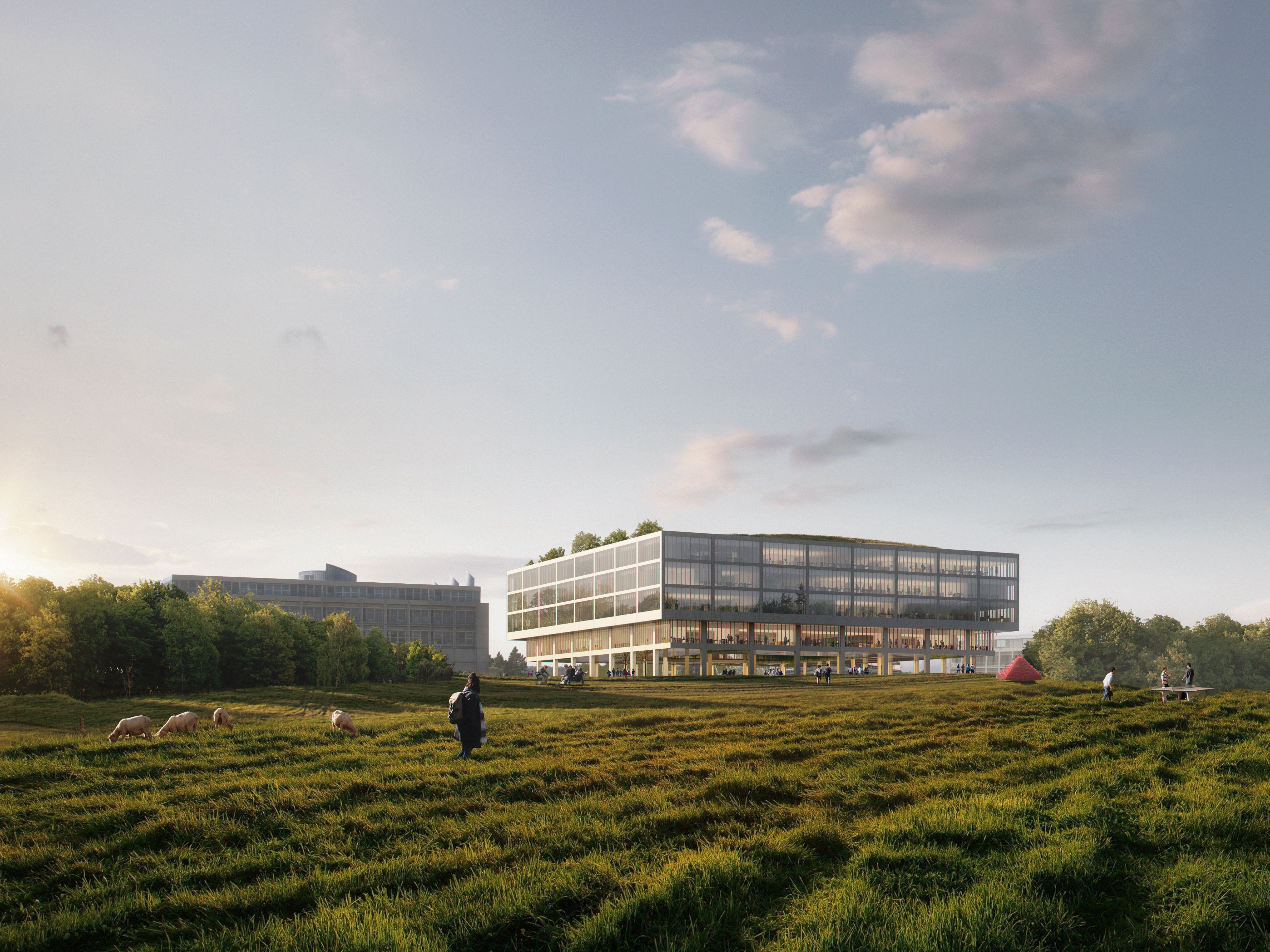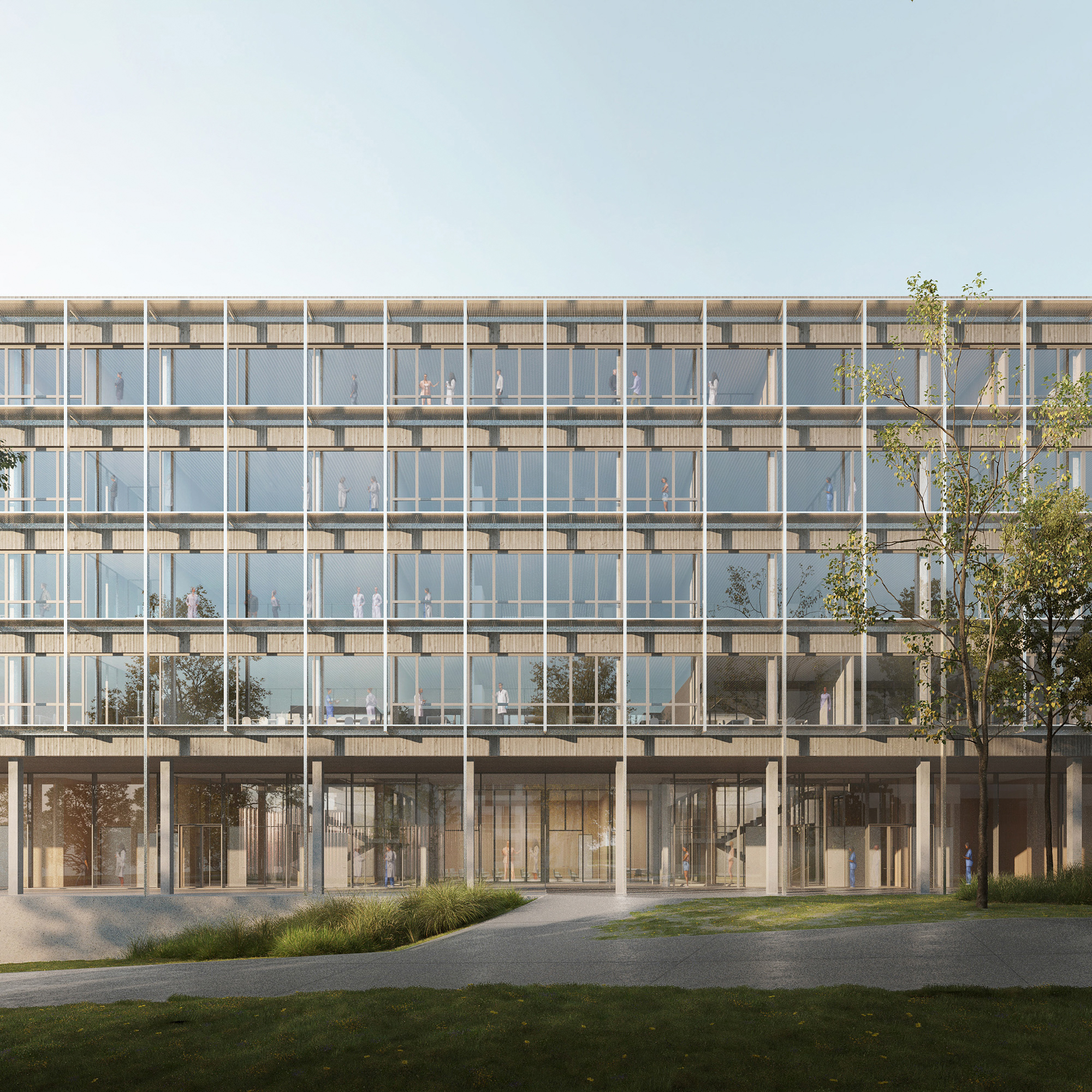 The ASB will replace the current Colladon parking lot, adding seven laboratory and office space floors, two of which are underground. Designed to support 26 research groups and over 500 users, it meets EPFL’s stringent research demands while fostering a collaborative environment. Sustainability is central to the design, with features like a compact form to reduce thermal loss, automated exterior blinds for solar control, and rooftop photovoltaic panels. Materials are selected to minimise greenhouse gas emissions and include local resources, with hybrid wood-concrete floors to lower environmental impact without compromising thermal inertia.