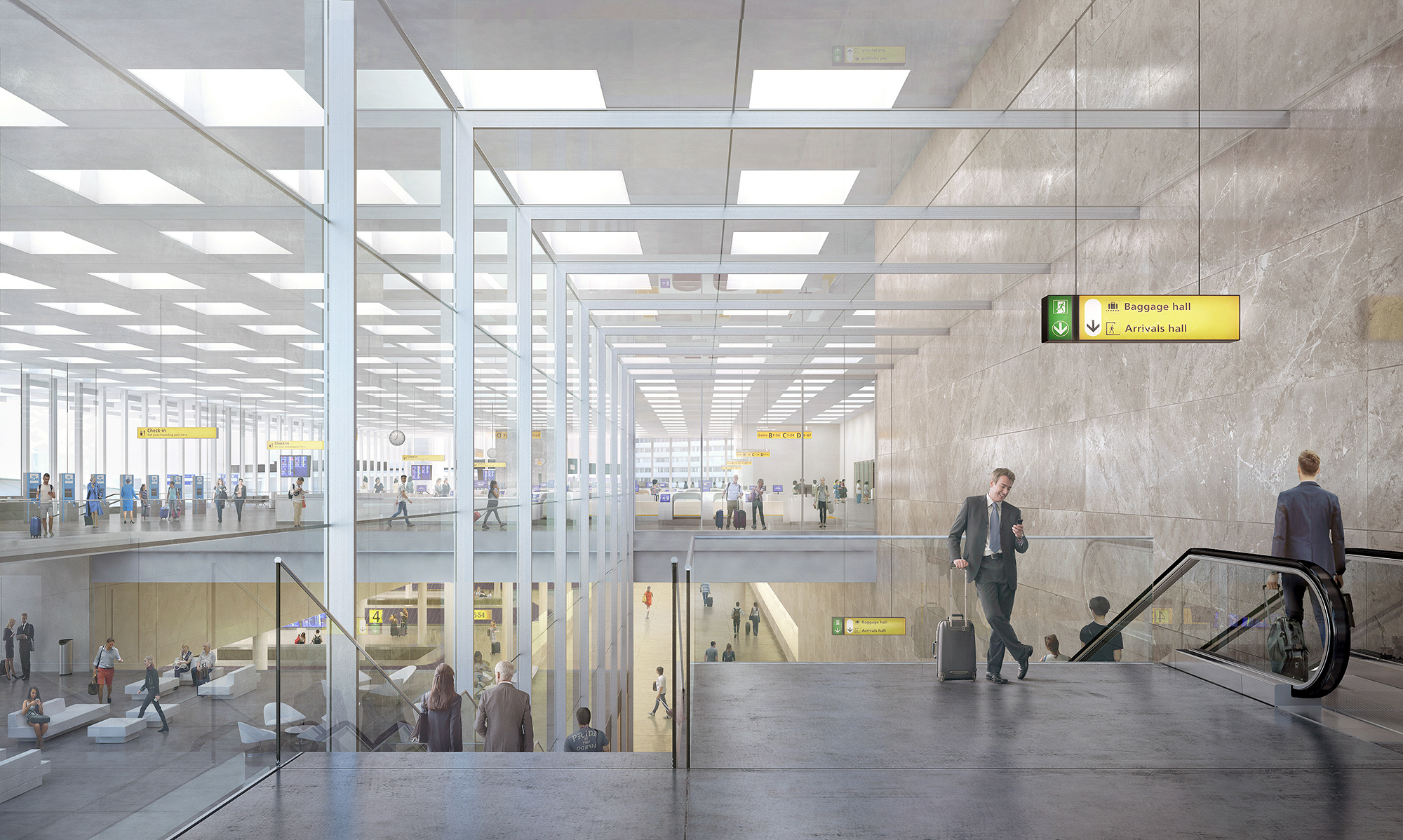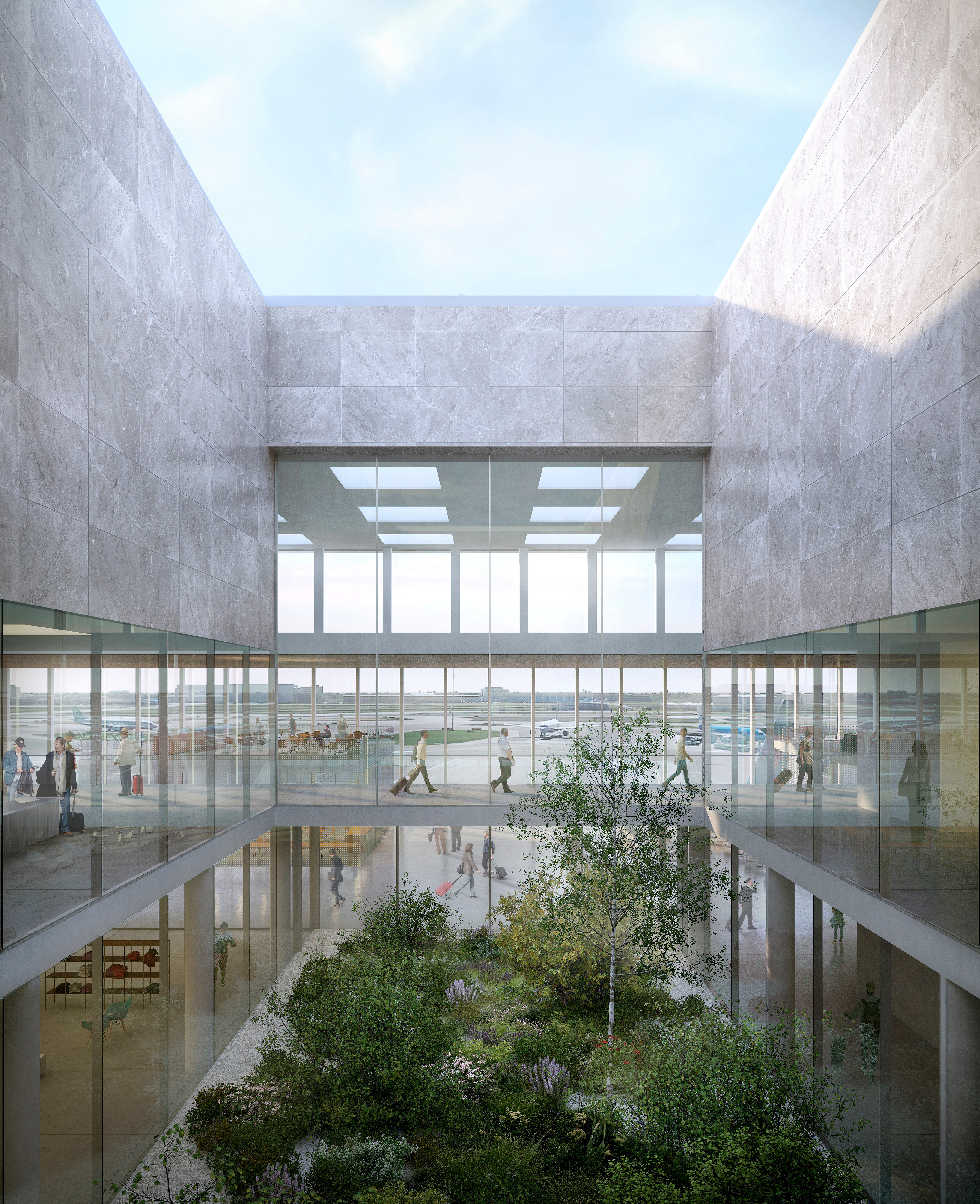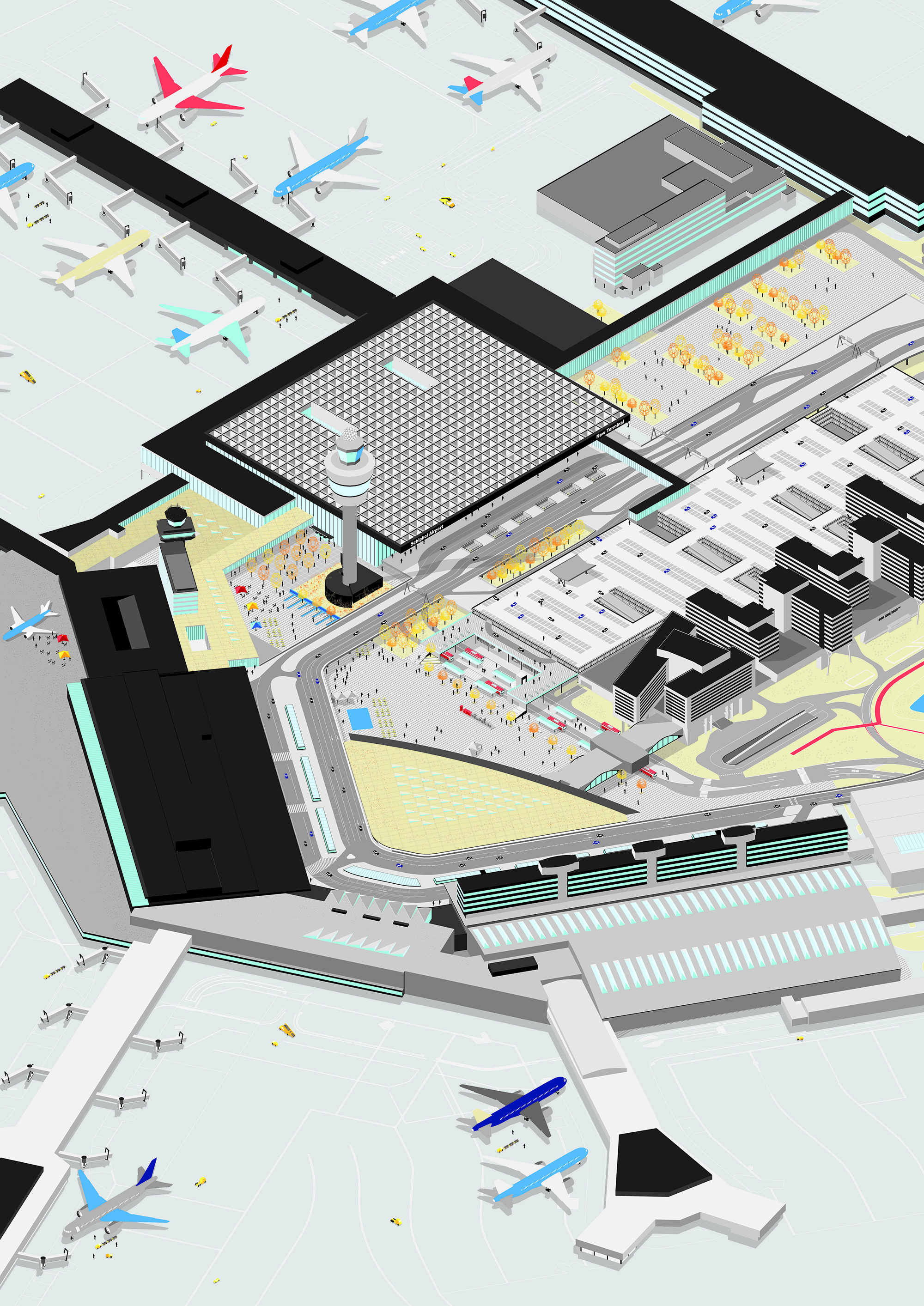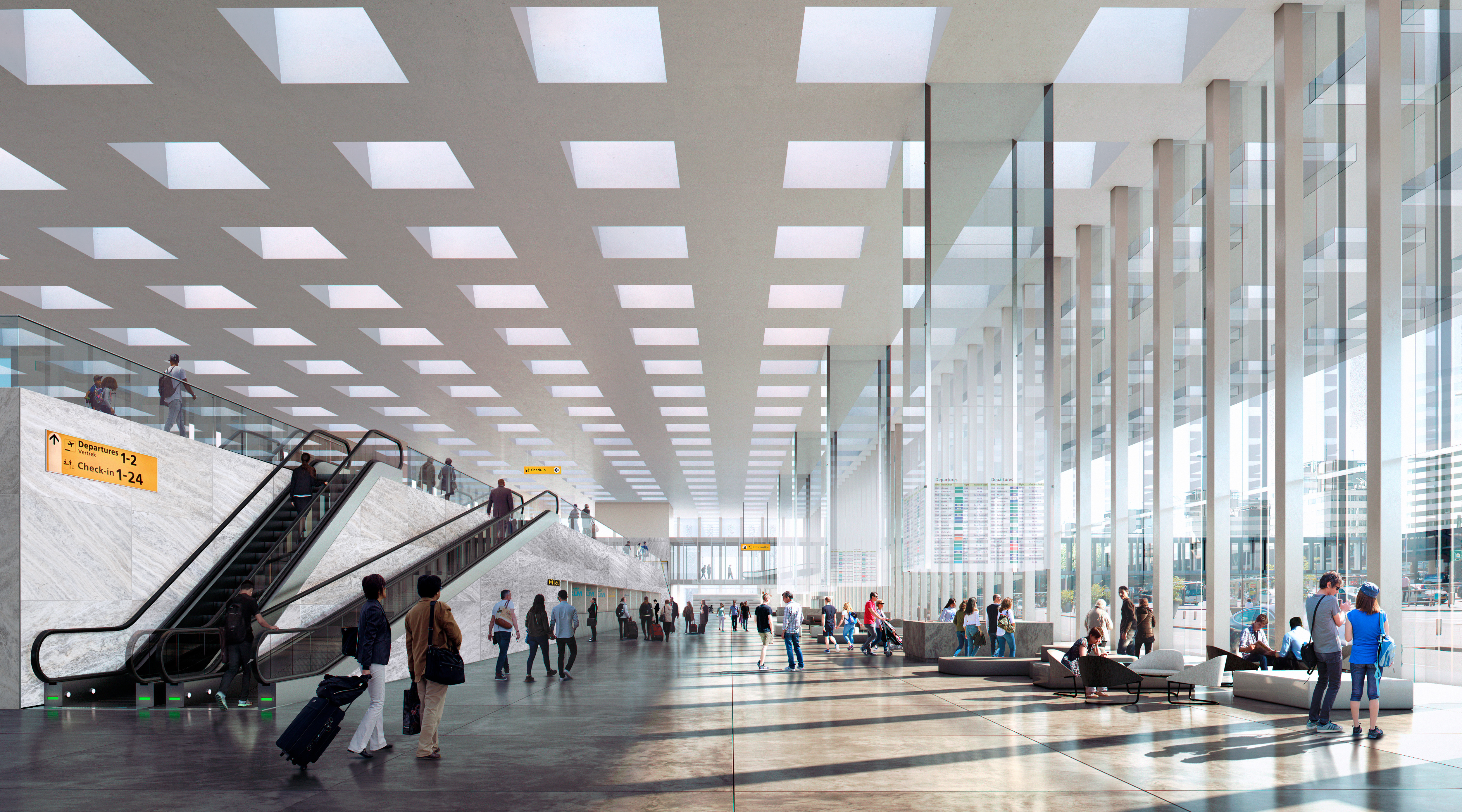KAAN Architecten, in collaboration with Estudio Lamela, ABT and Ineco, are designing the new terminal at Amsterdam Airport Schiphol. The spatial organization of the new 100,500 m2 terminal, its design, and the treatment of its façades, are based on the ability to link up with Schiphol Plaza, the train station and potential future expansions. This is achieved through architectural clarity, spatial openness, and details such as overhangs and black eaves.