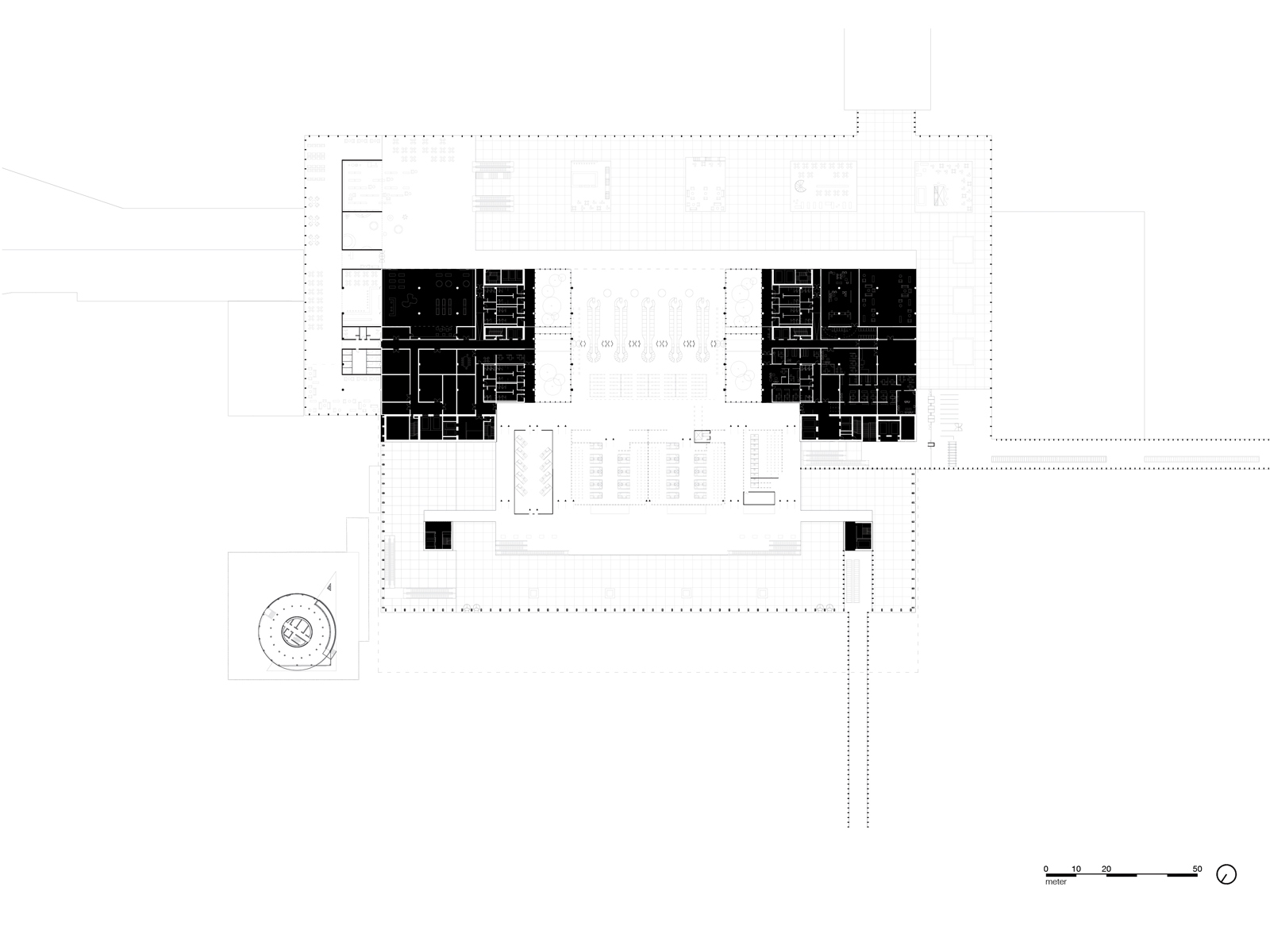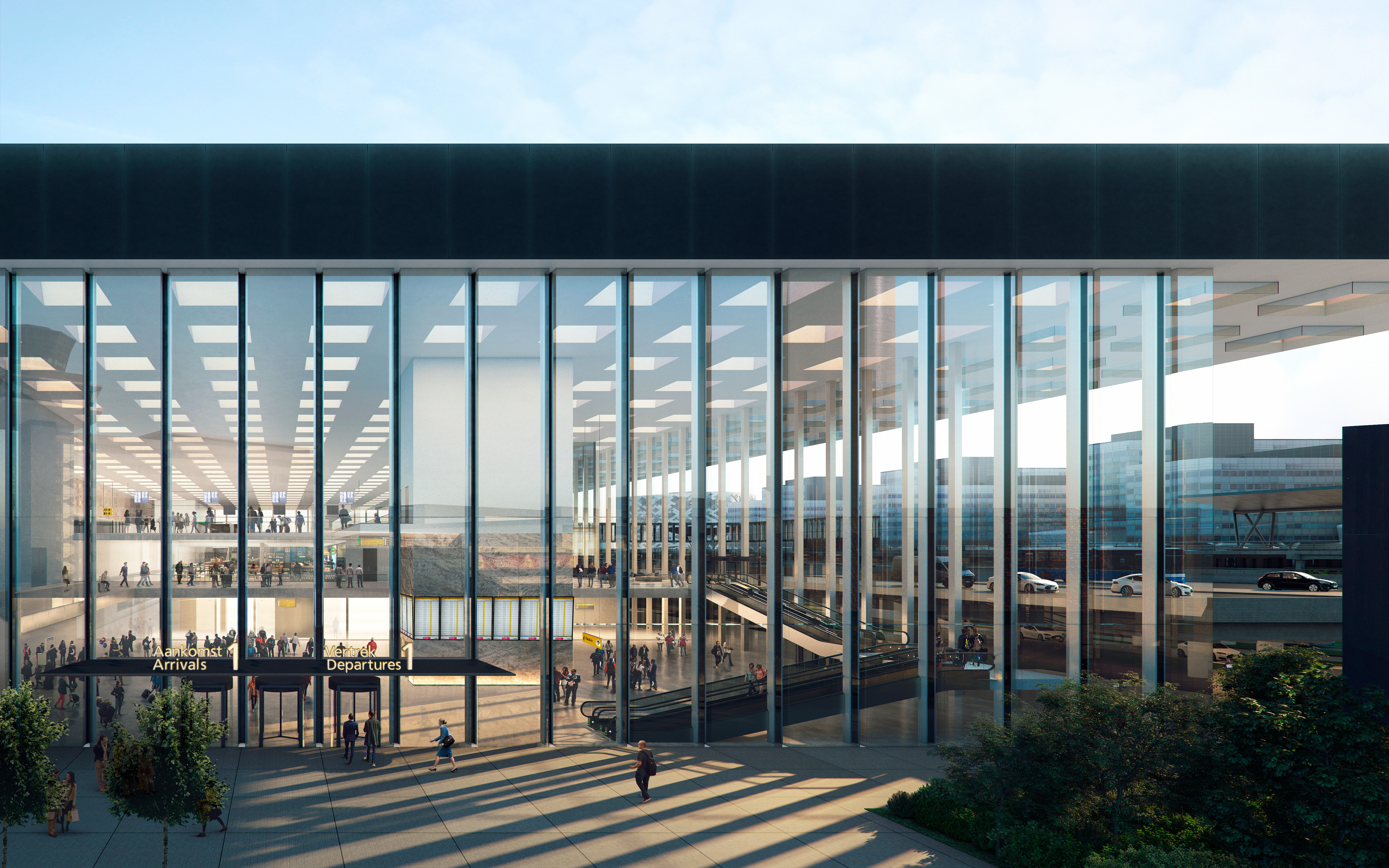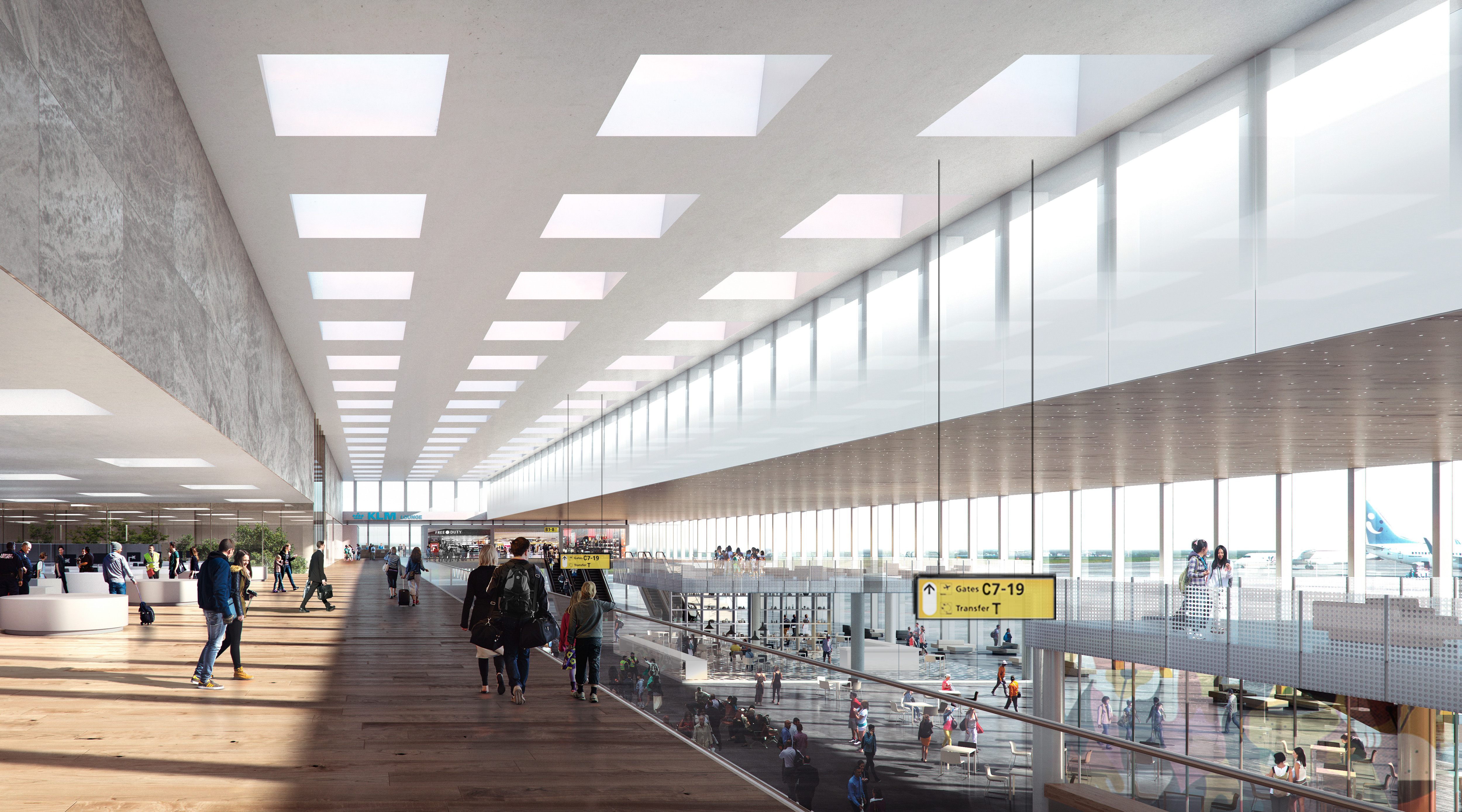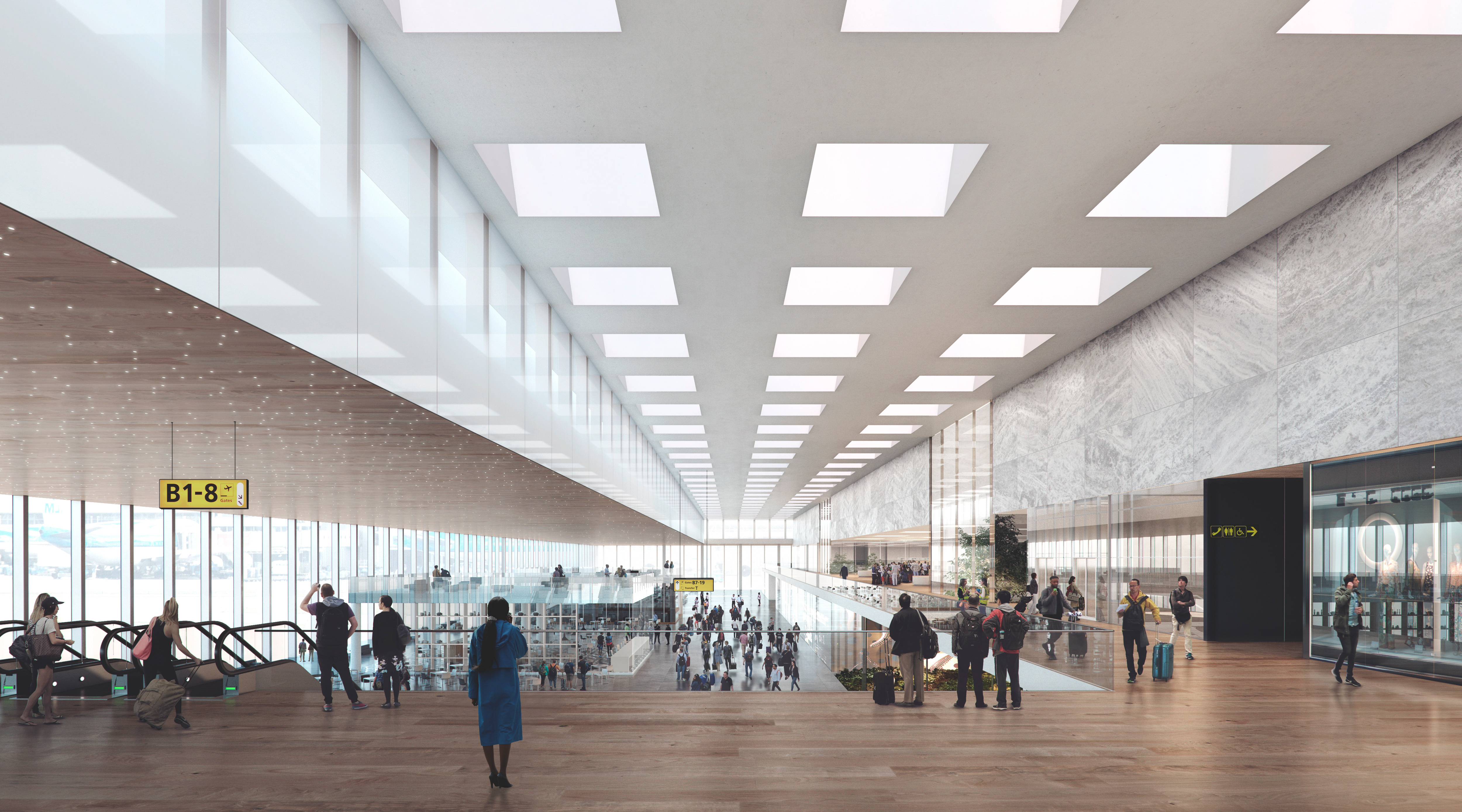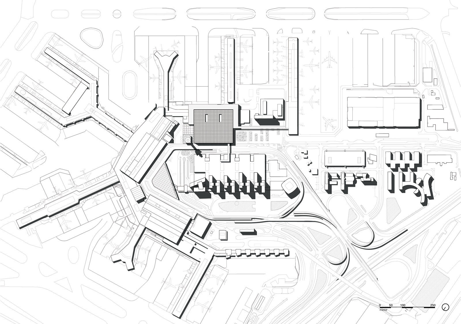 KAAN Architecten, in collaboration with Estudio Lamela, ABT and Ineco, are designing the new terminal at Amsterdam Airport Schiphol. The spatial organization of the new 100,500 m2 terminal, its design, and the treatment of its façades, are based on the ability to link up with Schiphol Plaza, the train station and potential future expansions. This is achieved through architectural clarity, spatial openness, and details such as overhangs and black eaves.
