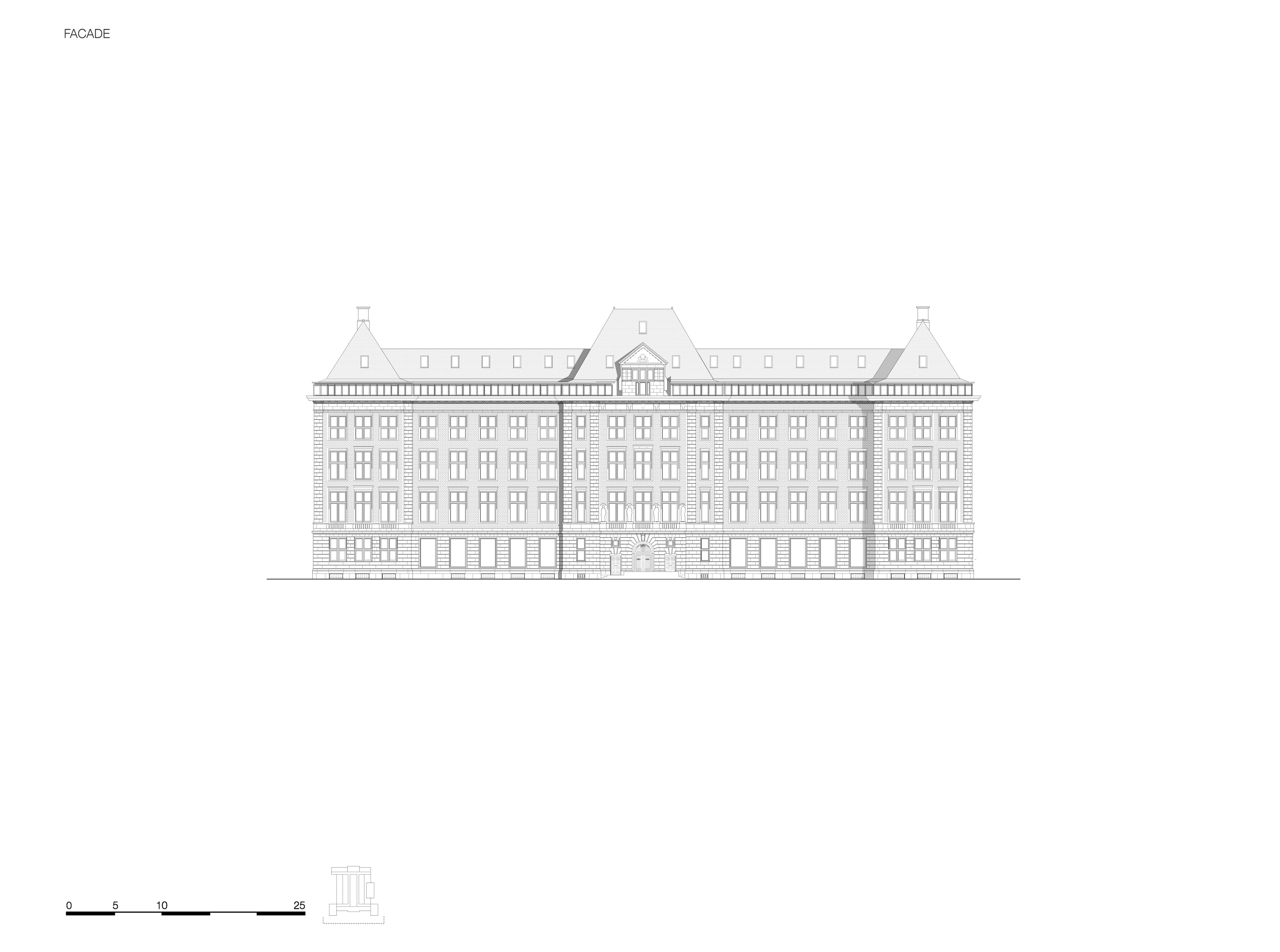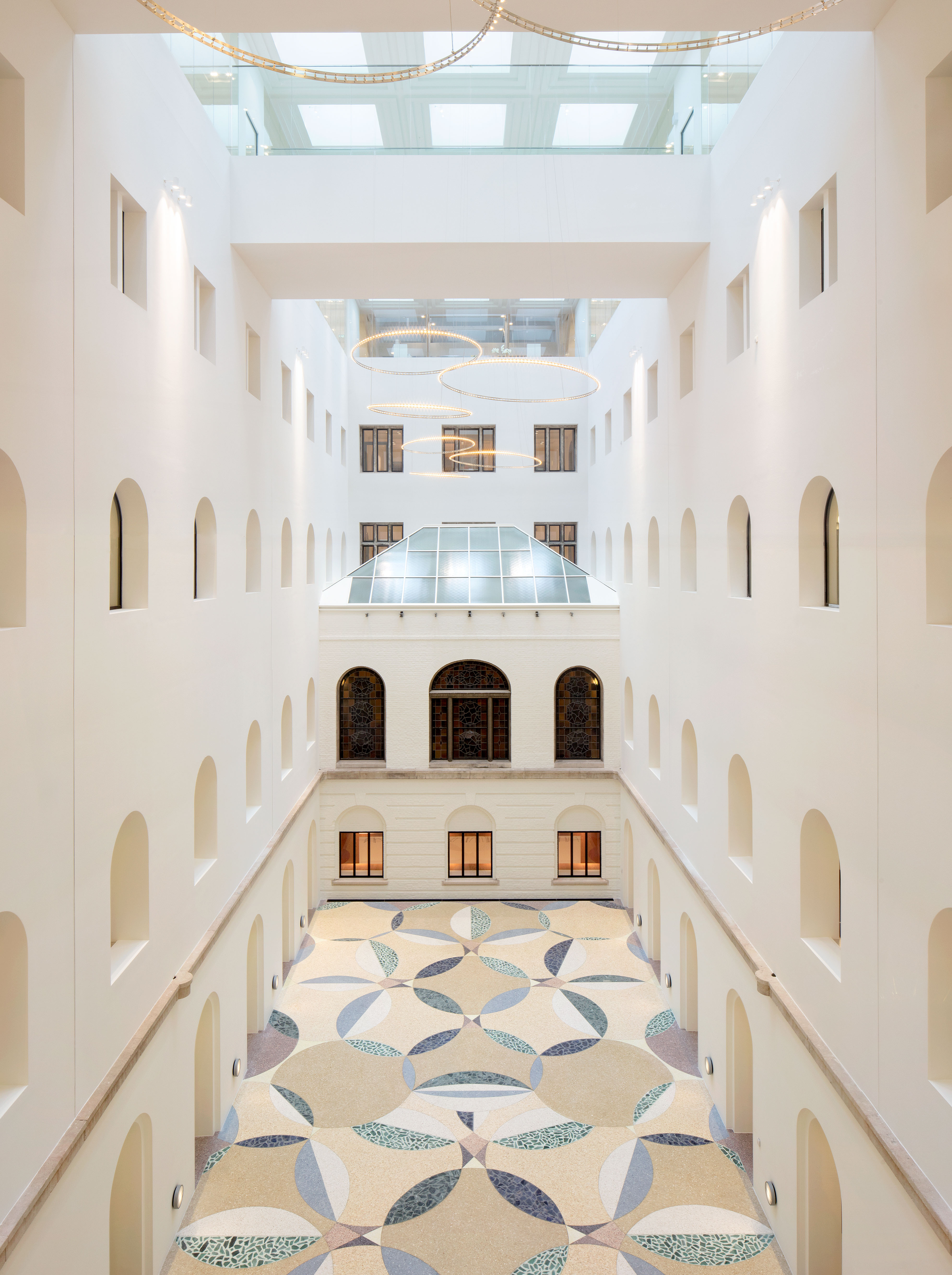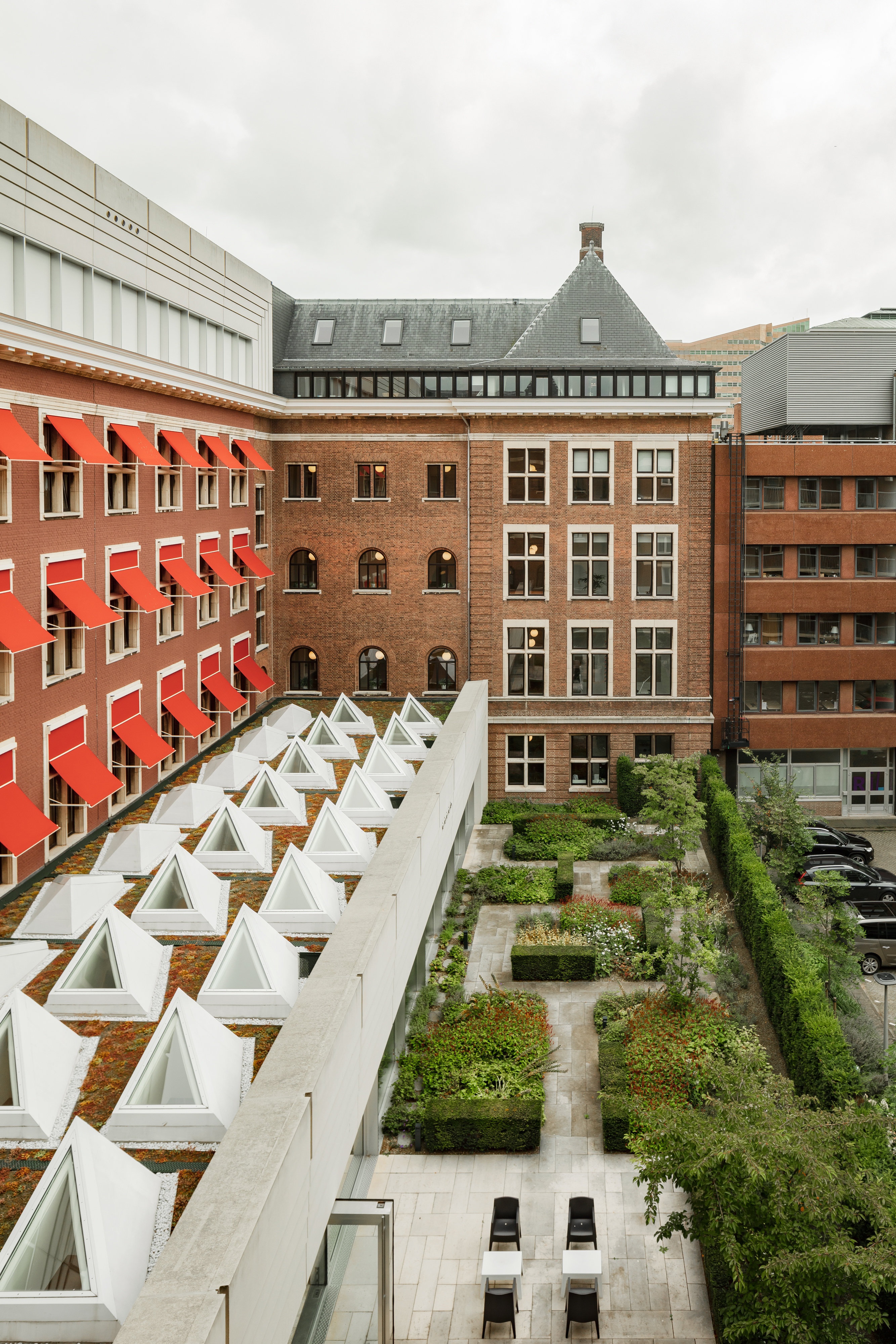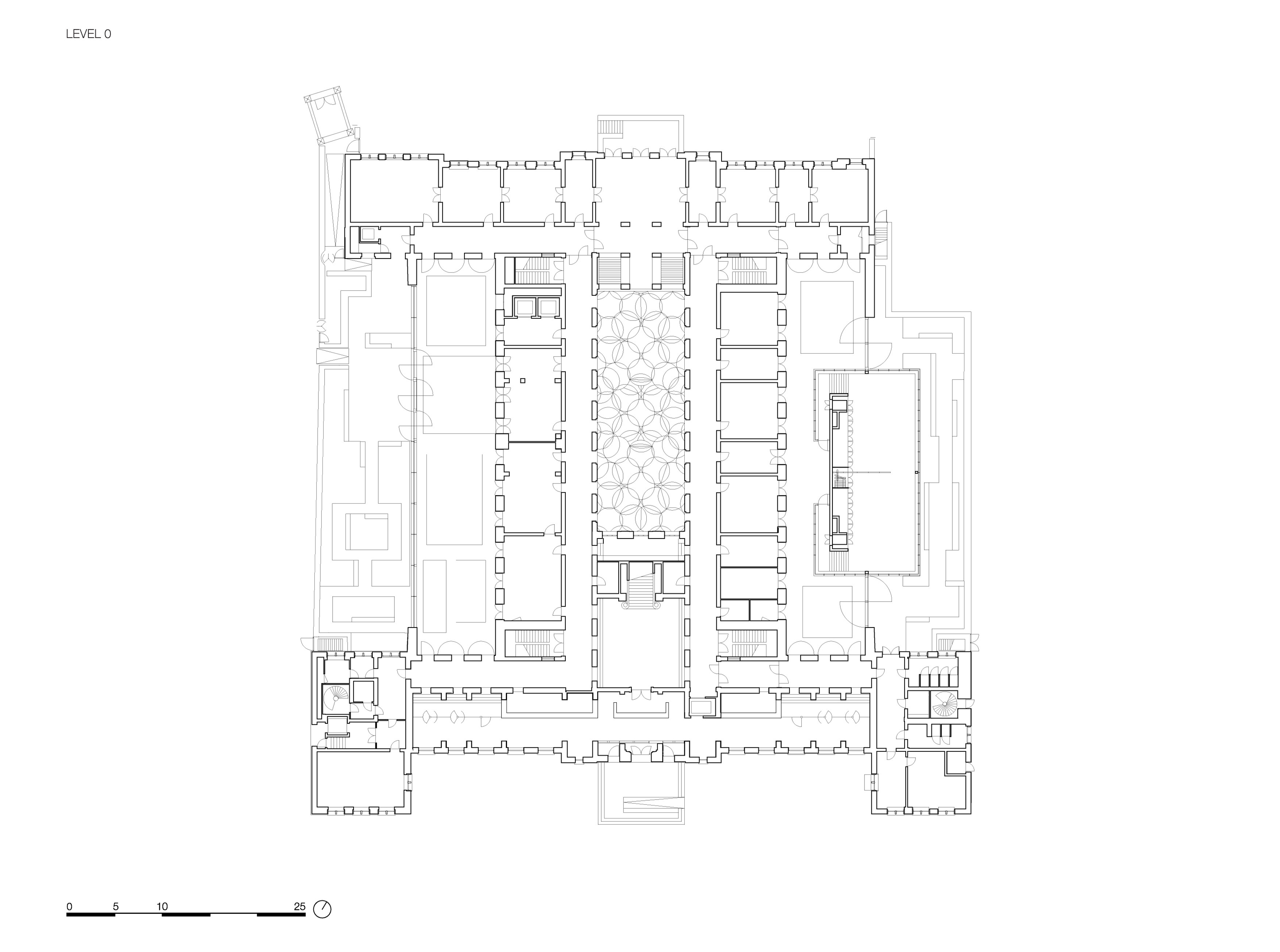 The closed hierarchical building was transformed into an open and inviting one through a clear spatial configuration and additive design. All passageways are aligned, creating long sightlines through the building, enhancing contact with the street, woods and gardens, and simplifying wayfinding. At the core of the building, a large atrium with a new mosaic floor gives a focus to the four upper floors, which house workspaces for various institutions.