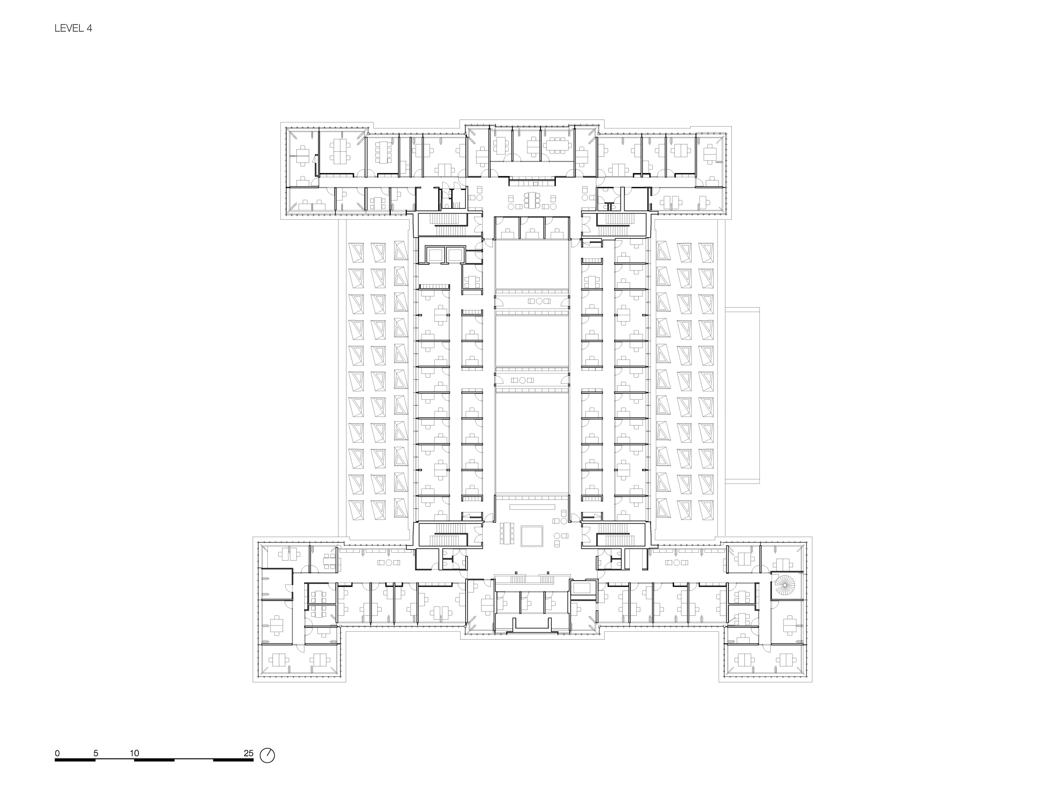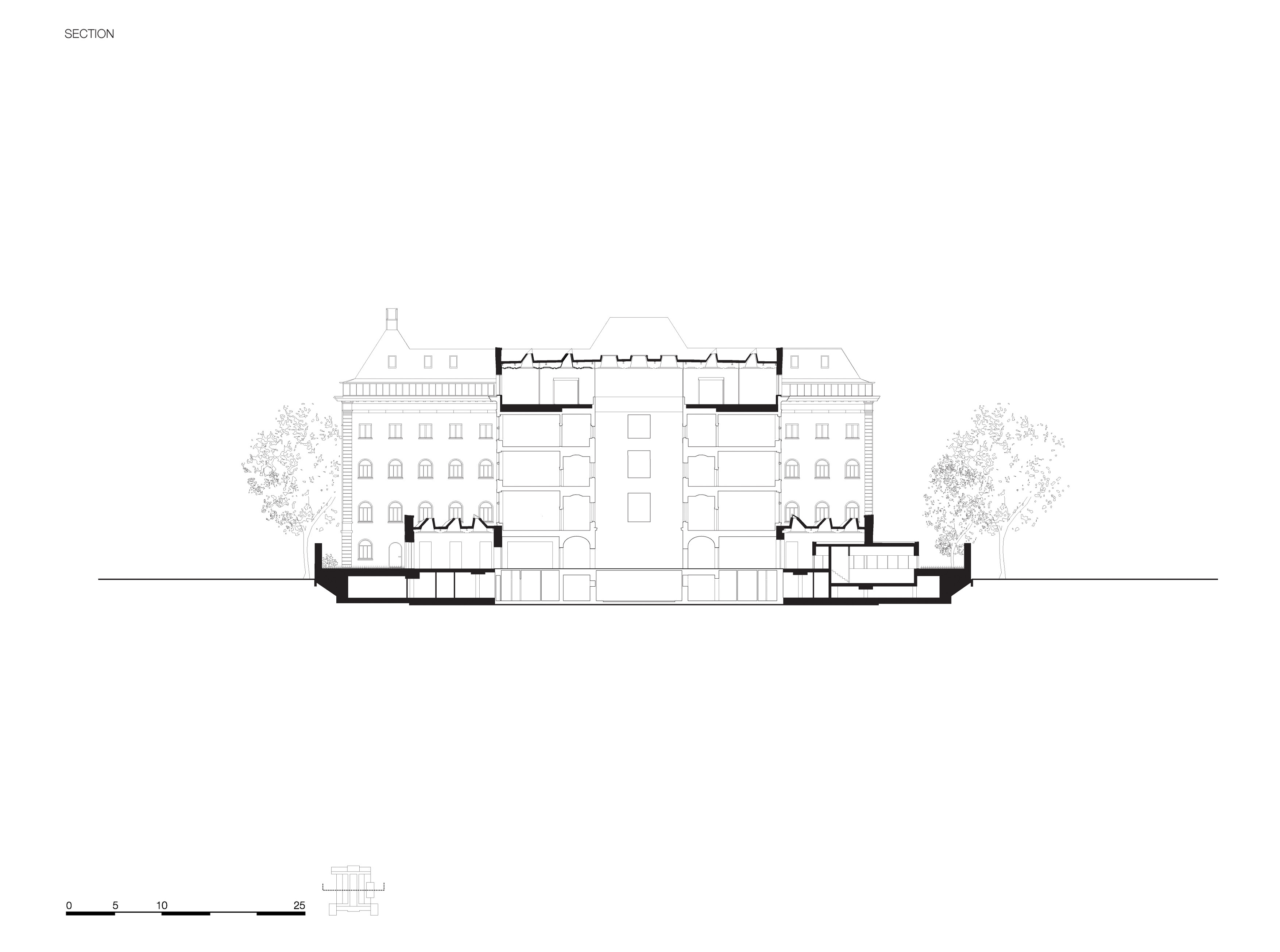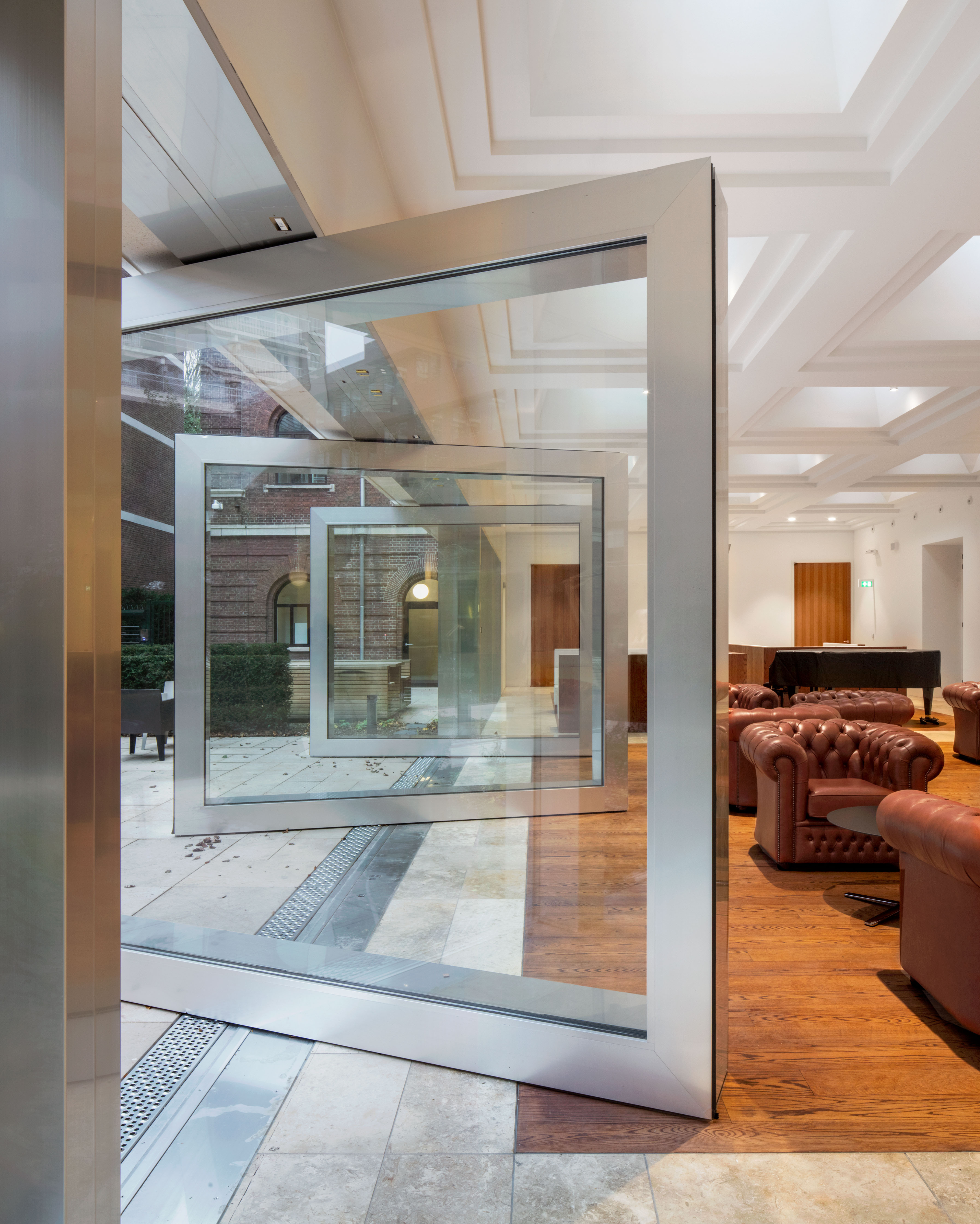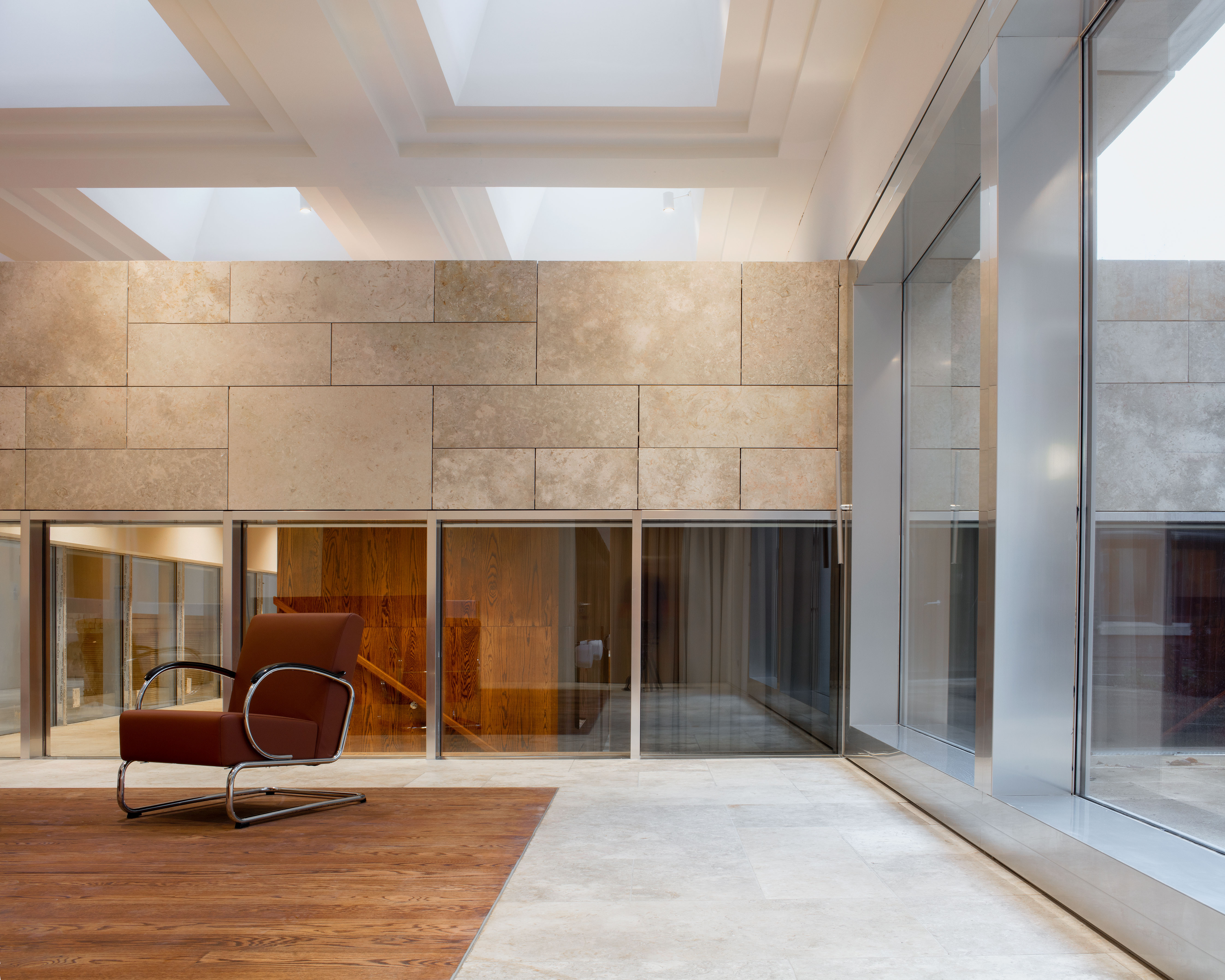 The closed hierarchical building was transformed into an open and inviting one through a clear spatial configuration and additive design. All passageways are aligned, creating long sightlines through the building, enhancing contact with the street, woods and gardens, and simplifying wayfinding. At the core of the building, a large atrium with a new mosaic floor gives a focus to the four upper floors, which house workspaces for various institutions.
