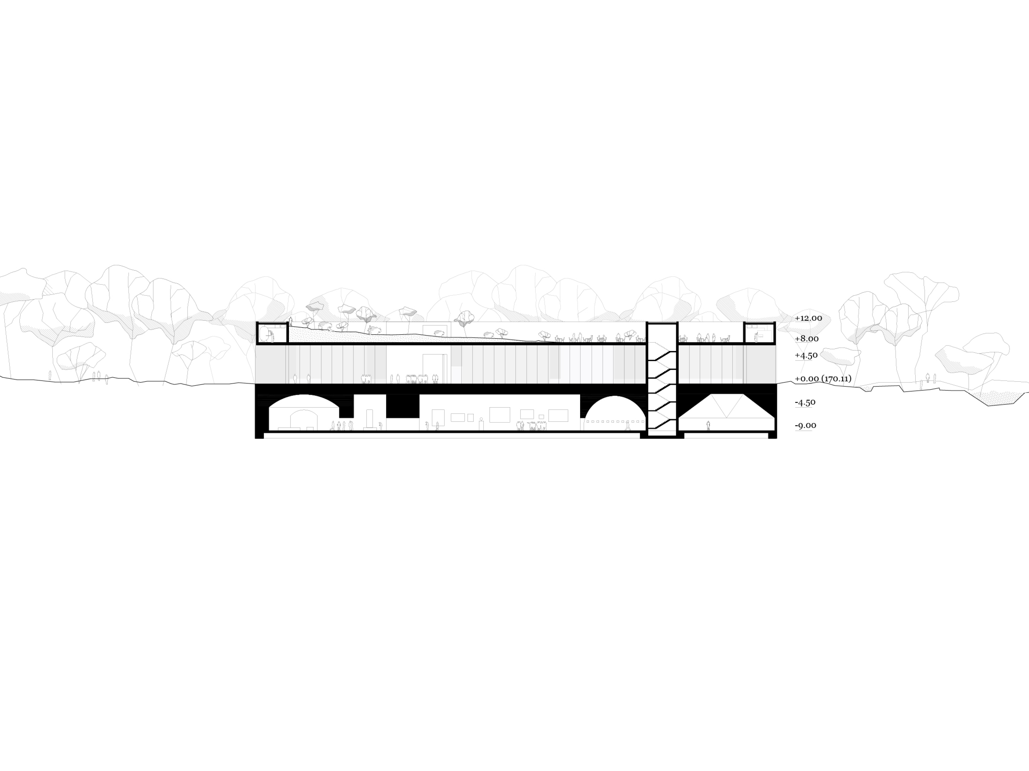 The Babyn Yar Holocaust Memorial Centre is located in Kyiv, near the ravine where the mass shootings occurred in 1941. The layers of history were covered by layers of earth, and the ravine is now a memorial park. The site immerses the visitor in the natural scenography of the woodland, which offers space for reflection on the past and provides a view into the future through the sunlight penetrating the forest. The mass of the building is formed out of a large, solid, and dark volume which sinks into the layers of the historical landscape.