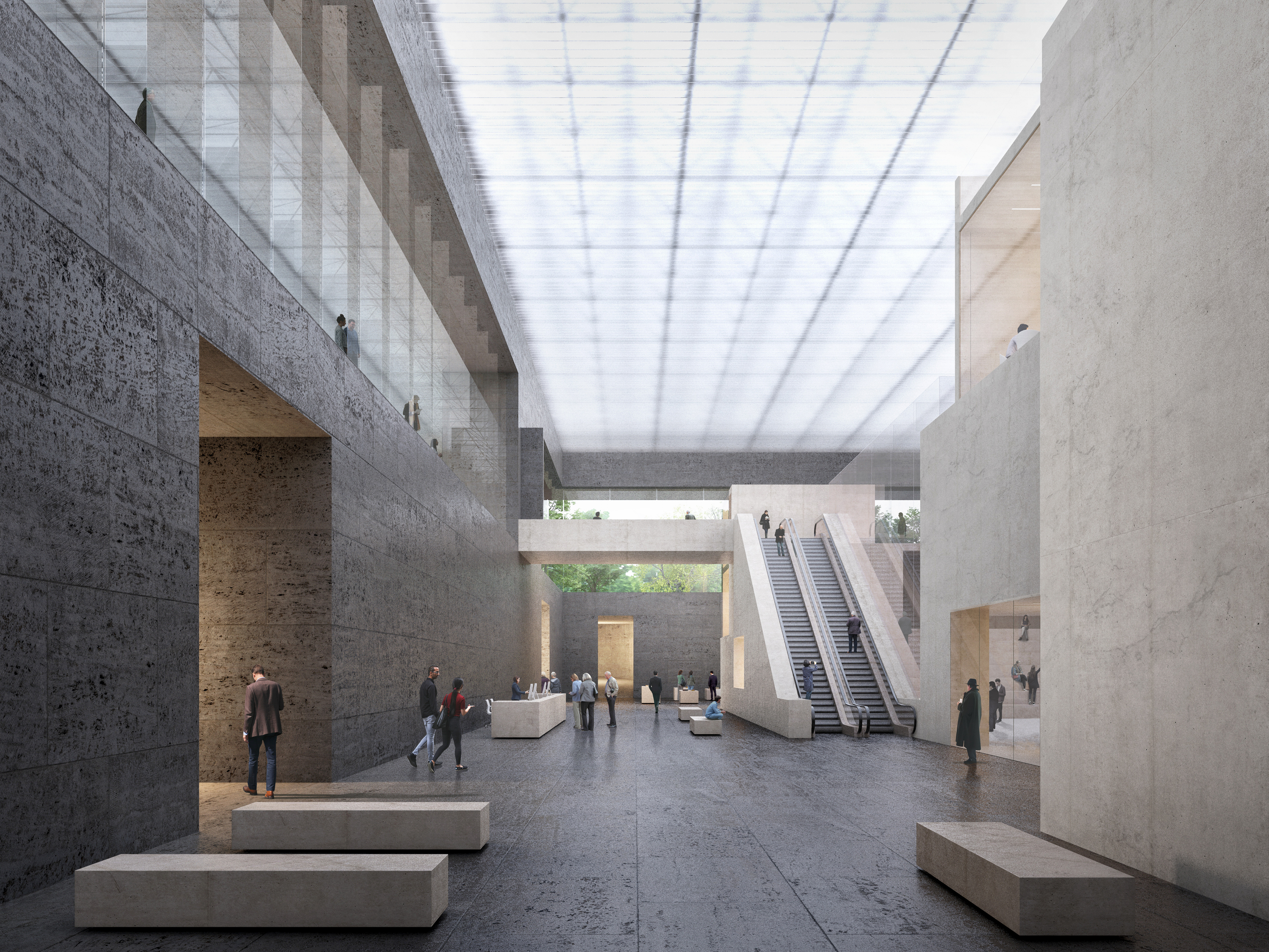Within the main volume, a sloping landscape of light houses spaces for the production of knowledge. The foyer, placed in the ravine, connects all the functions of the Memorial Centre and creates an active place of encounters, connecting the past and future of the site. It is flanked by exhibition spaces dedicated to the past, and research and learning spaces focused on the future and designed for unearthing, collecting, and sharing new knowledge in the hopes of preserving peace.