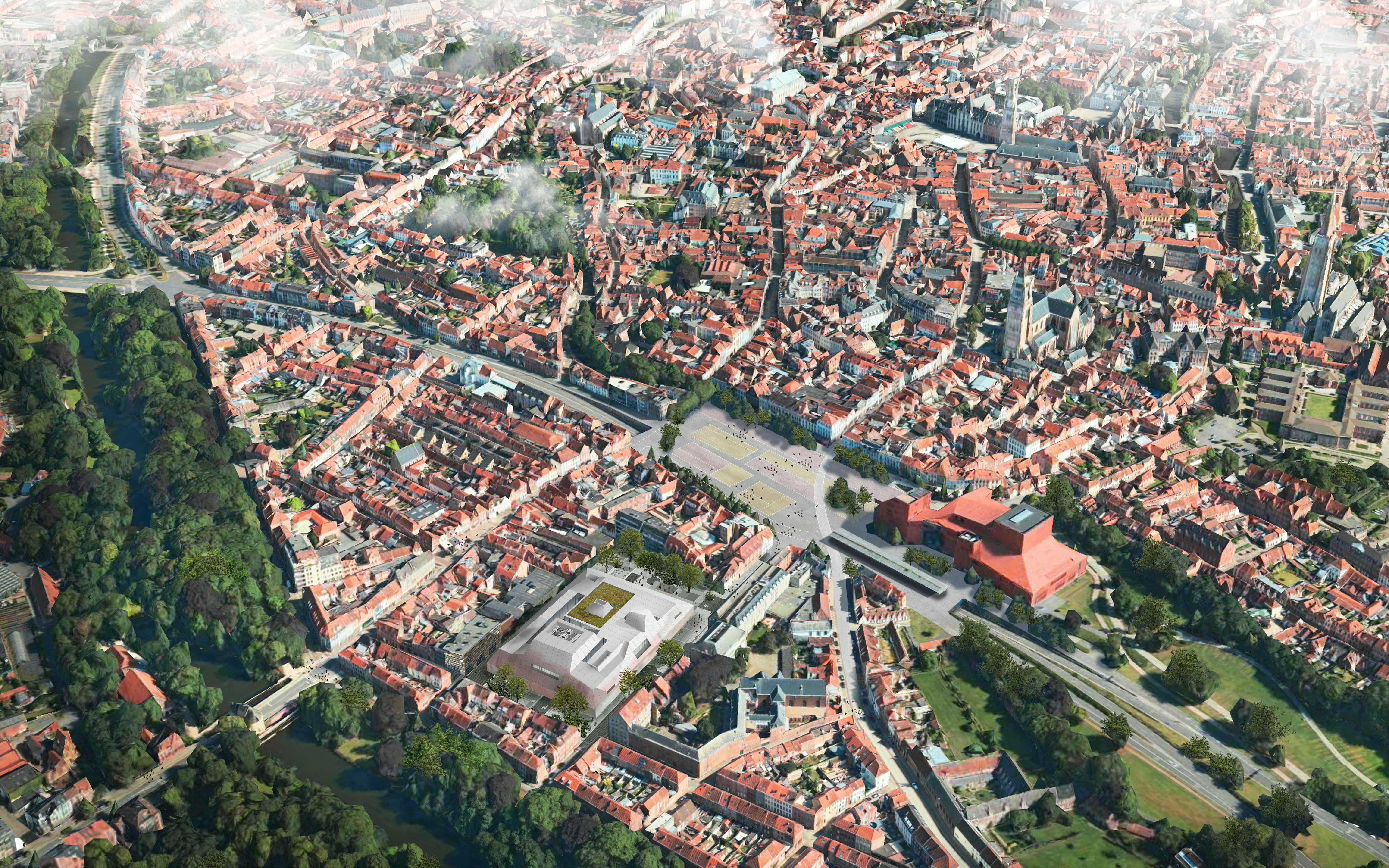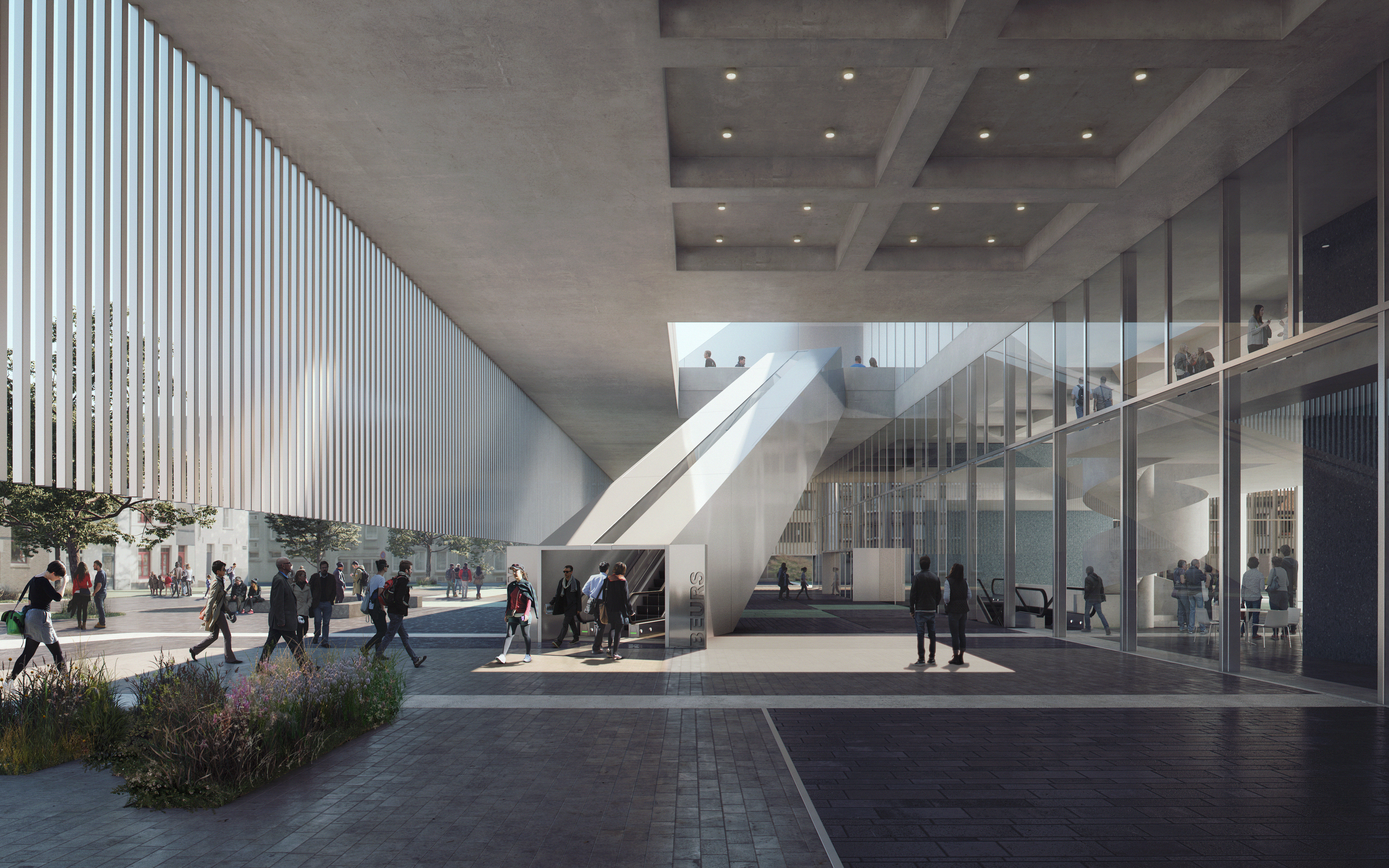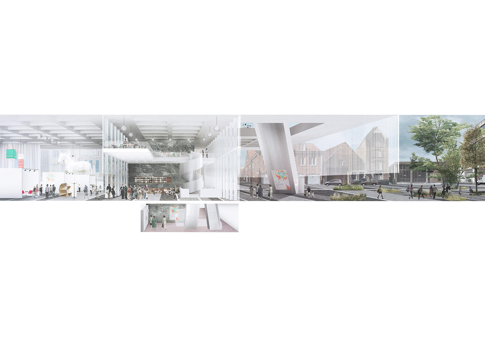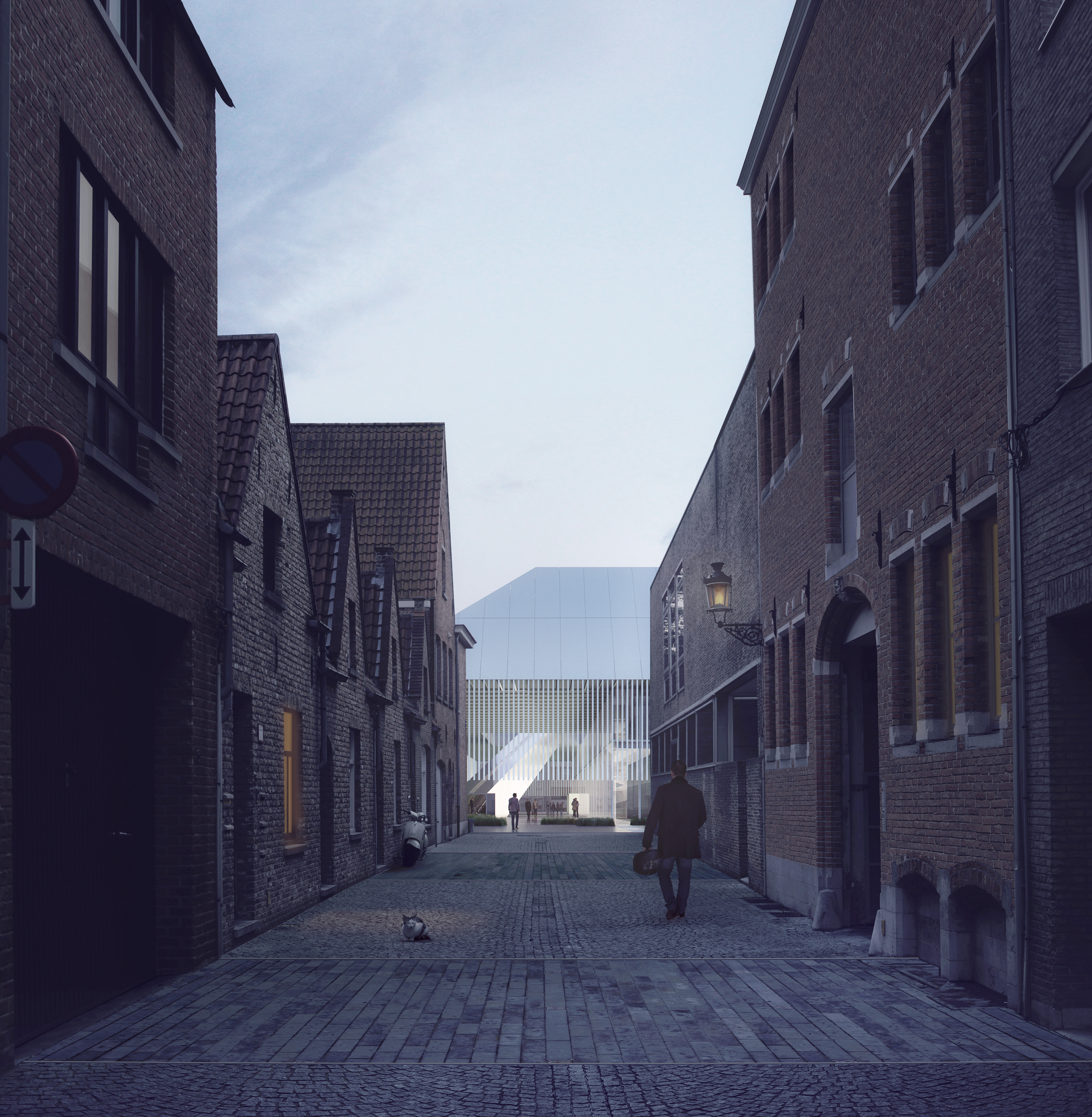 Beurssite Bruges is a proposal for the congress and exhibition centre at the Beursplein, in the UNESCO-listed medieval city center of Bruges. The design is a contemporary response to the characteristic roof-scape of Bruges, while offering the experience of a continuous square on ground level. In each of the four corners, the building’s logistics are housed in supporting legs, which provide an unobstructed, flexible exhibition space of 4500m2 in the centre of the plan. Transparent facades provide continuous connection between the building and city.