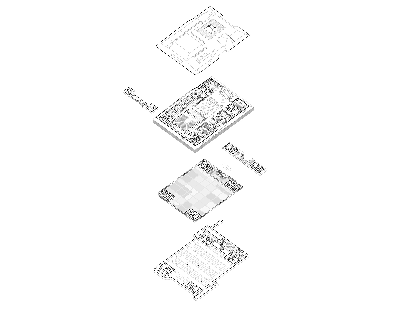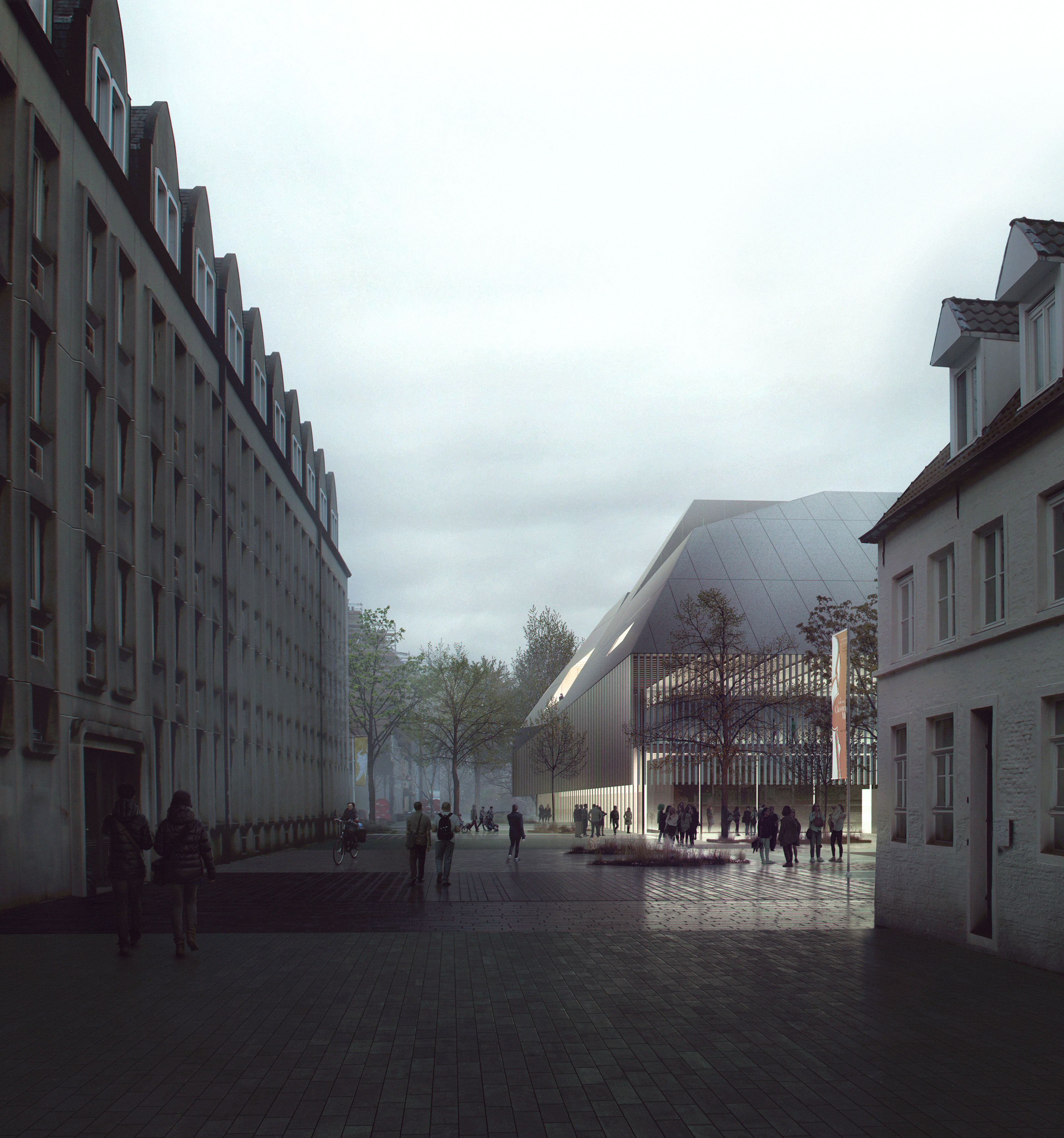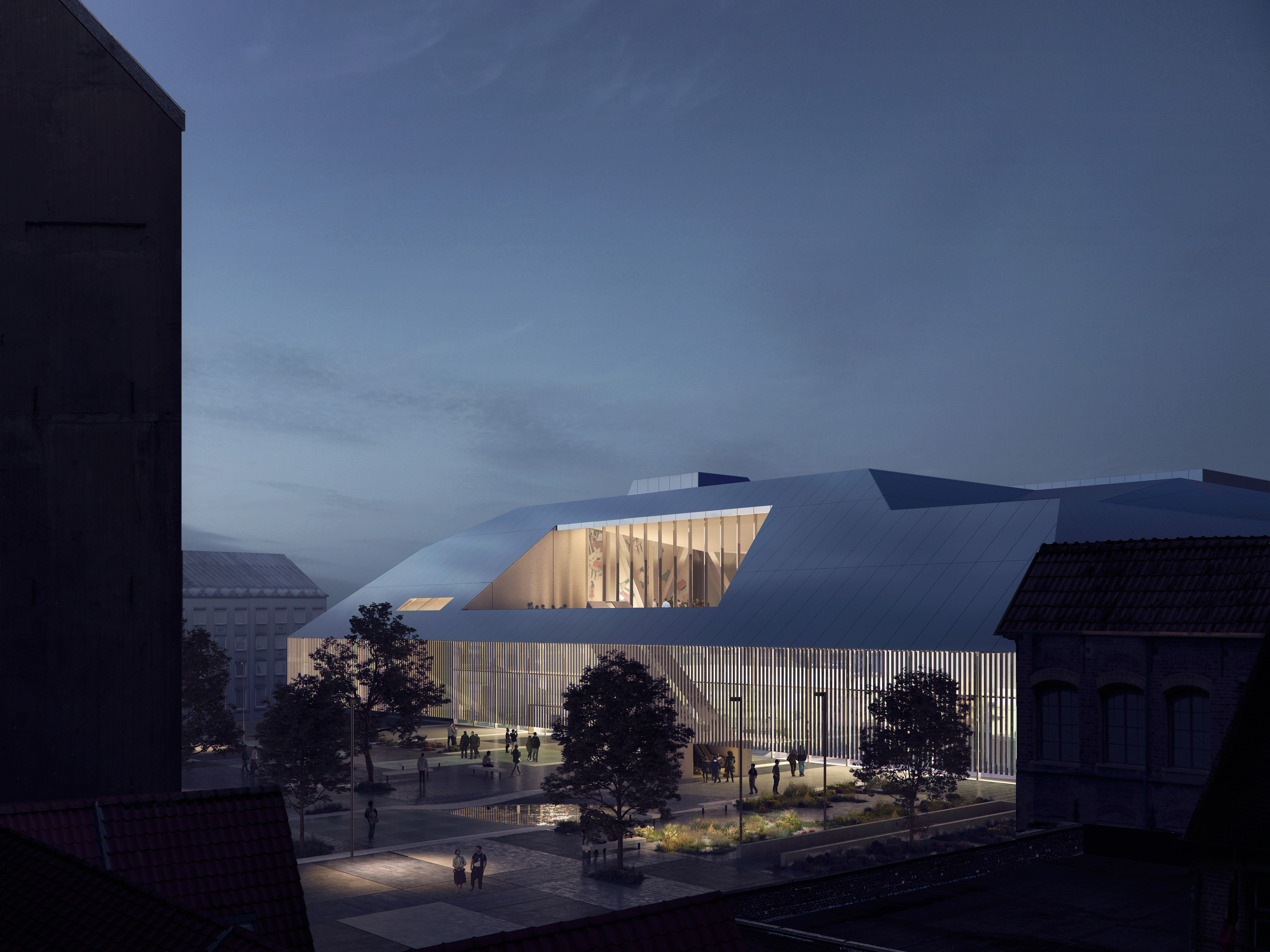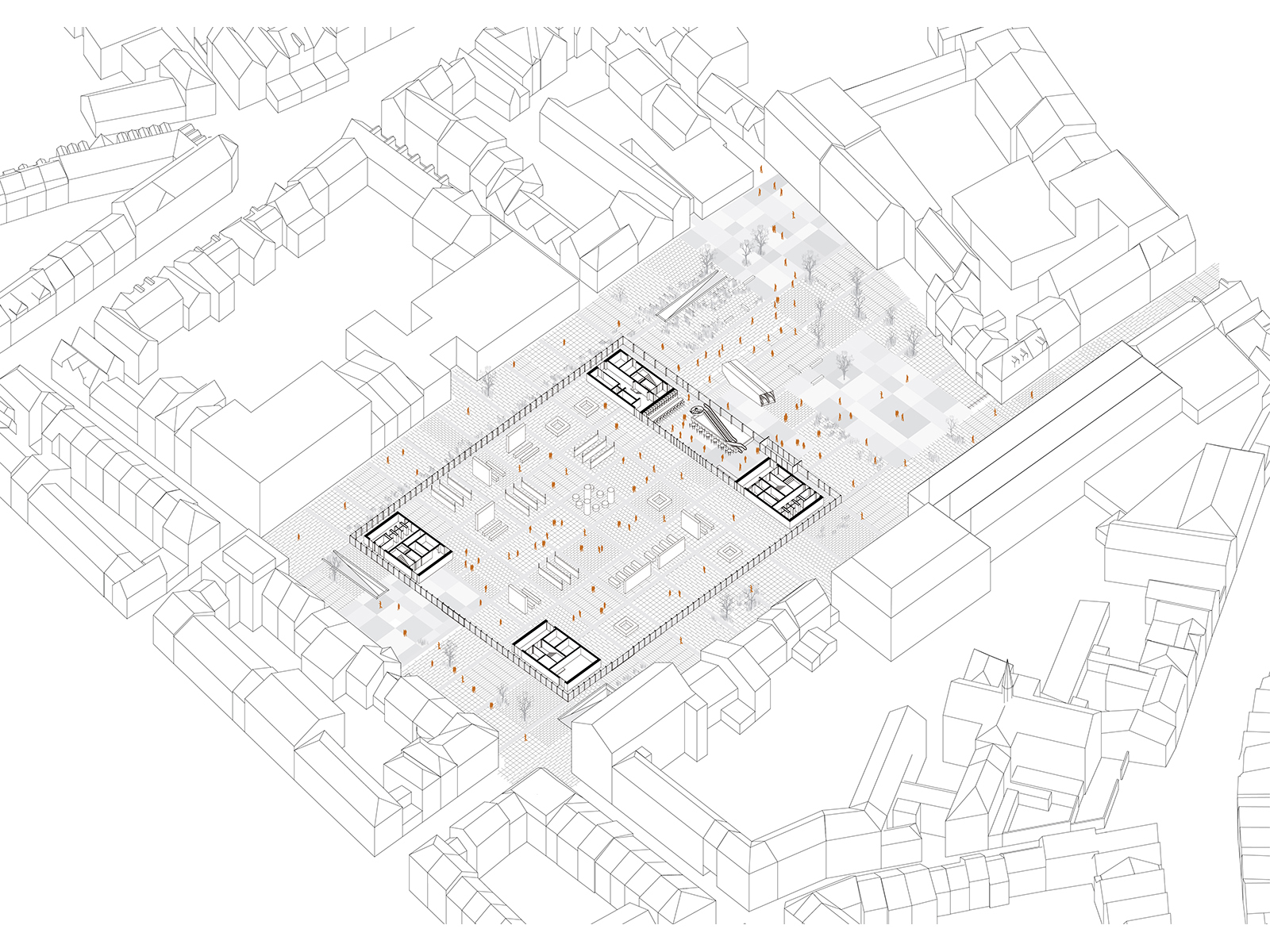 Beurssite Bruges is a proposal for the congress and exhibition centre at the Beursplein, in the UNESCO-listed medieval city center of Bruges. The design is a contemporary response to the characteristic roof-scape of Bruges, while offering the experience of a continuous square on ground level. In each of the four corners, the building’s logistics are housed in supporting legs, which provide an unobstructed, flexible exhibition space of 4500m2 in the centre of the plan. Transparent facades provide continuous connection between the building and city.