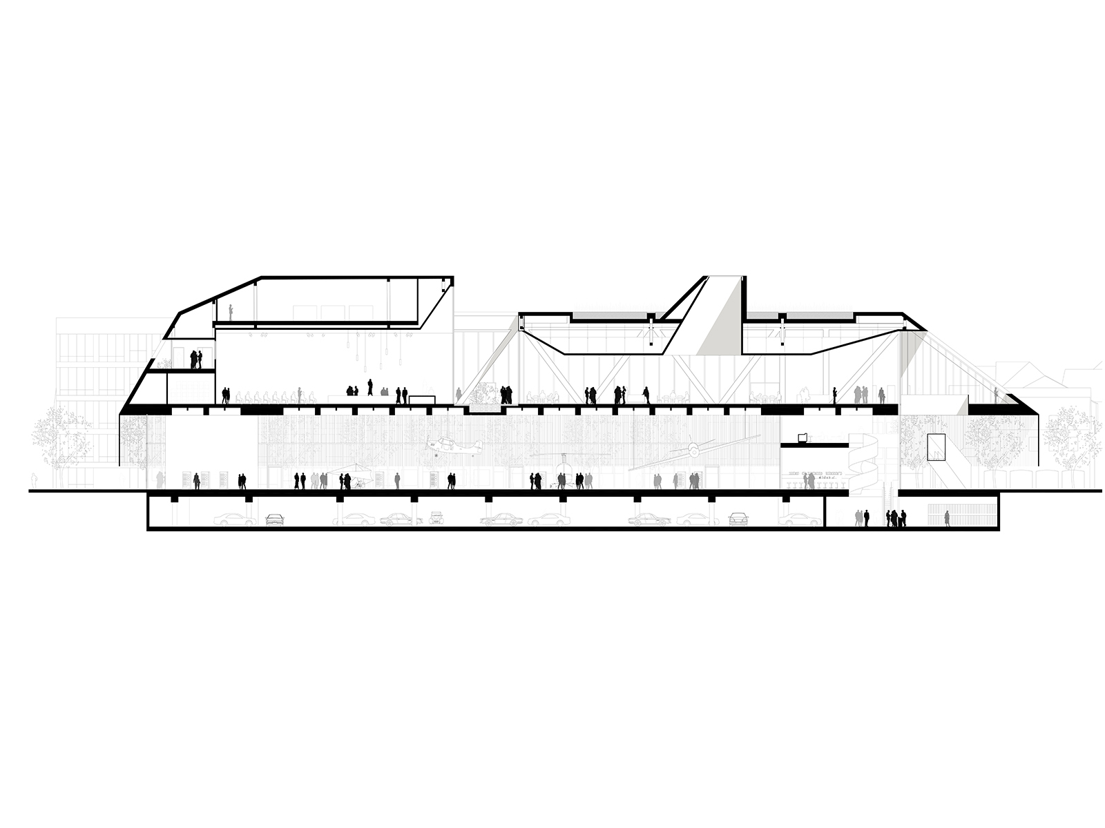 Supported by the legs, the large volume houses a 4000m2 conference centre, sculpted to resemble the scale and shape of the inner city. The building’s presence is further dematerialized through its anodized aluminium cladding. Visitors enter underneath the generous overhang, then move up through the space via an enclosed escalator, arriving on the conference level’s balcony overlooking the city. The sculptural roof creates patios and spatial variety, creating a diverse space with interactive interior and exterior views.