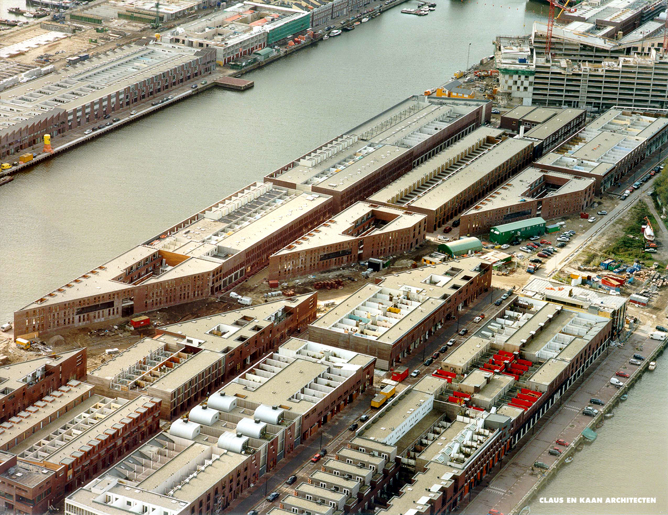 Borneo Sporenburg redevelops two peninsulas in the eastern docklands of Amsterdam, once the scene of an active harbour, into high density residential areas. The new neighbourhood is comprised of 1400 single family homes. Mostly wall-to-wall, these slender houses are accessed at street level and spread over five sites in Sporenburg. Several architects were selected for the realisation, all working with the same typology: the introverted individual house.