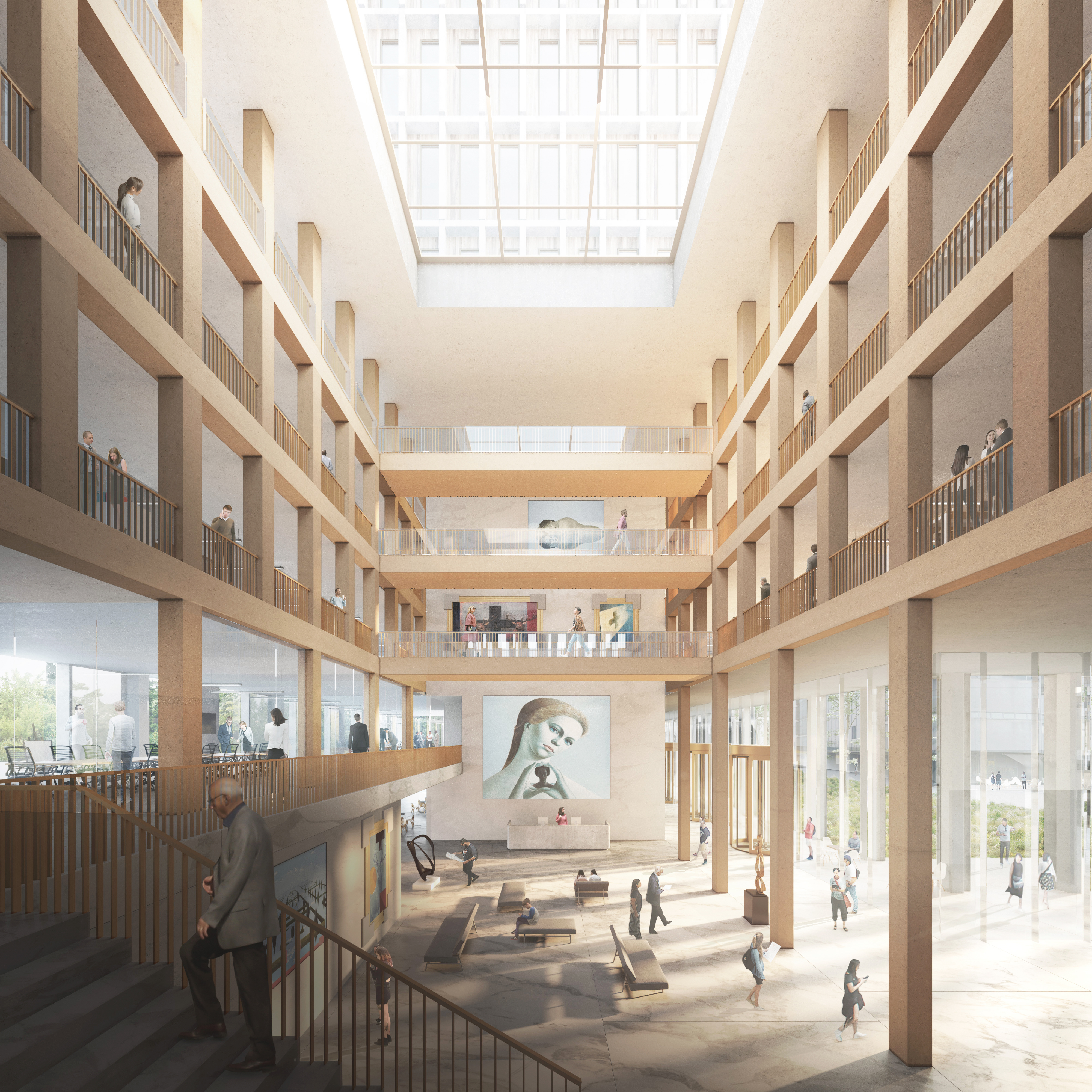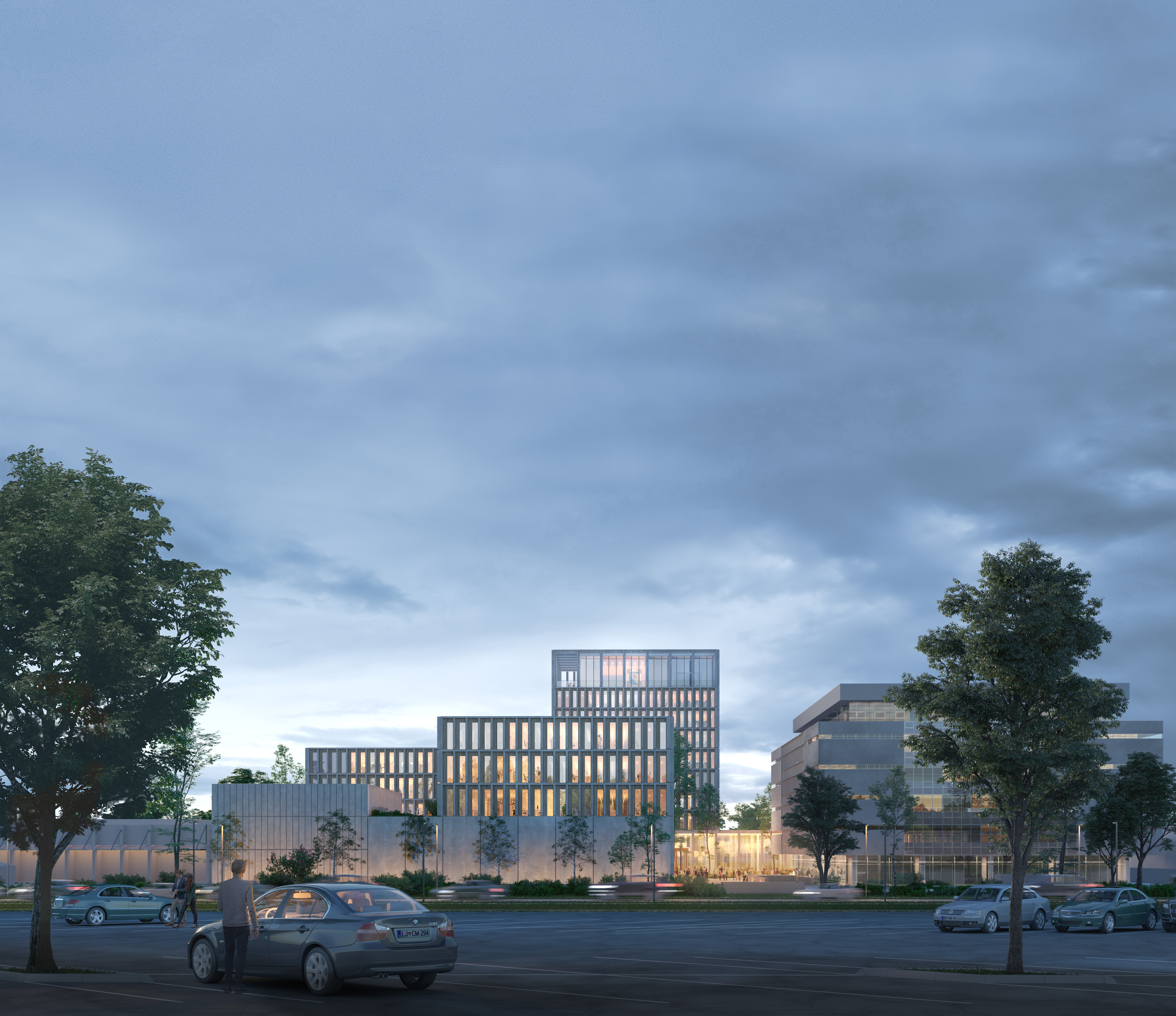 The functions of the public levels are oriented towards the central plaza, which enables shared functions and activities between the buildings. Essentially, the entire plaza acts as a spacious and sunny lobby for the cluster. While the centrally oriented typology is primarily a way to deal with the underdeveloped urban character of the area, it simultaneously forms a fundamentally urban ensemble: a semi-permeable city block with a central plaza. It anticipates the future potential of the area and, due to its fragmented composition, remains flexible for future connections to its surroundings.