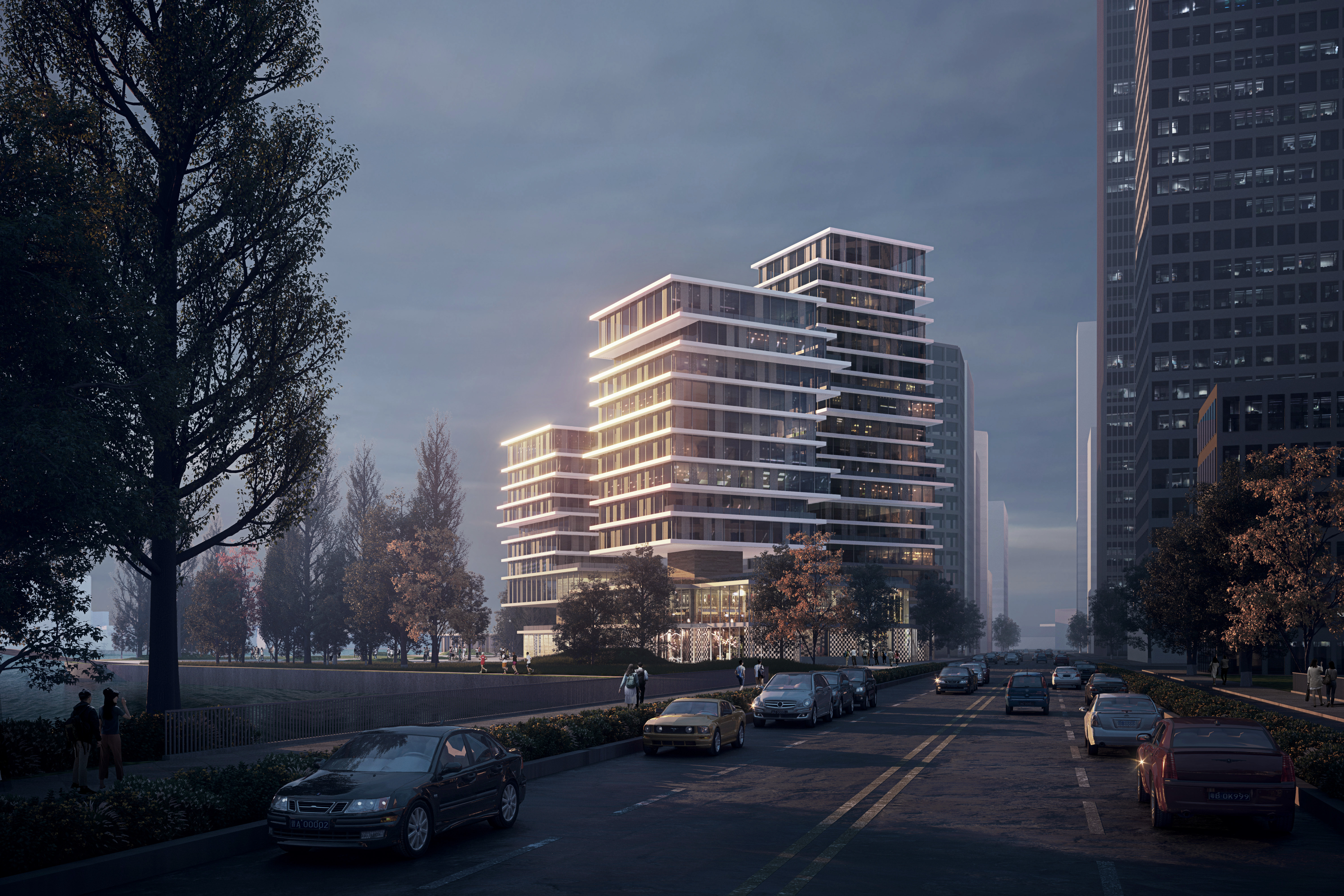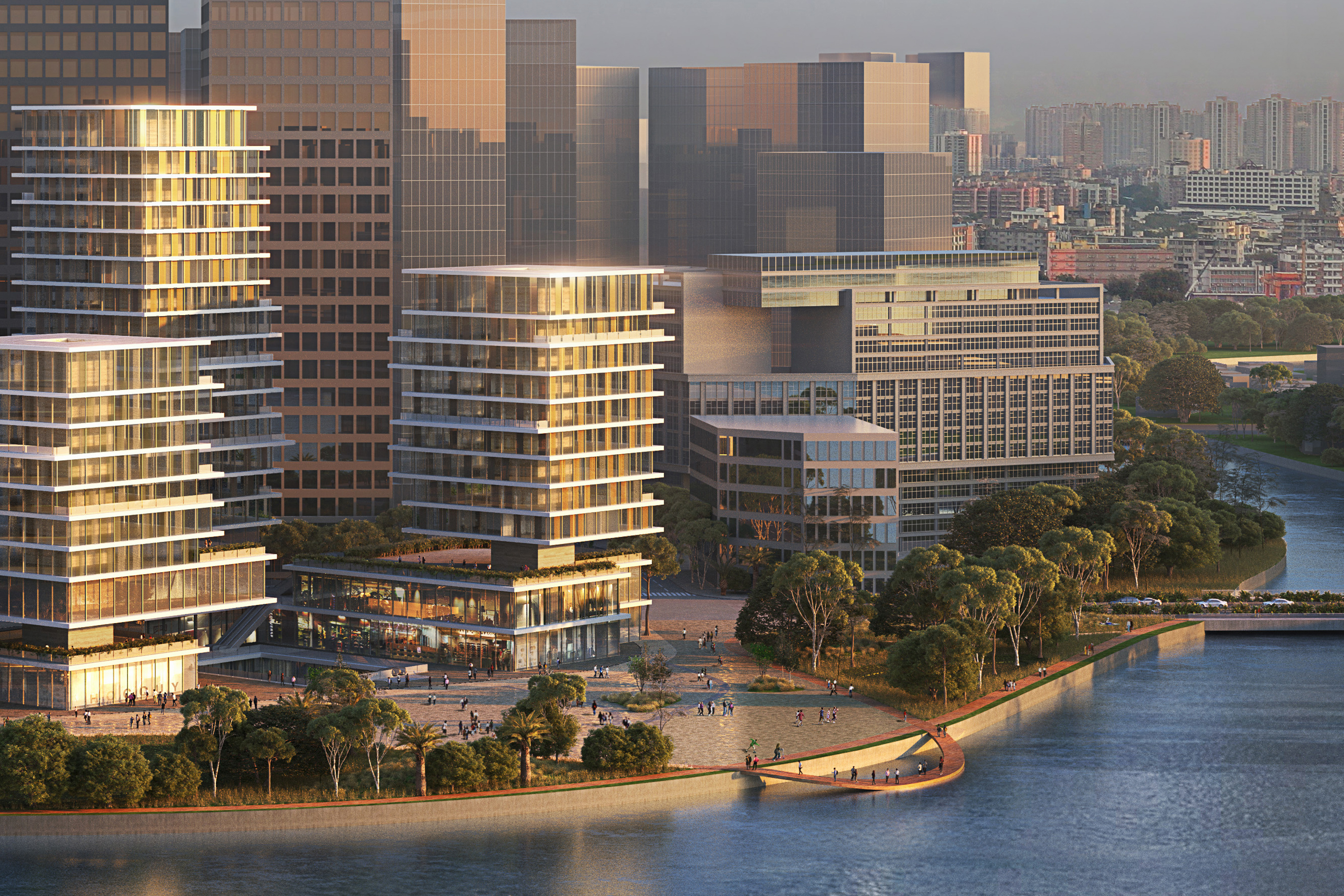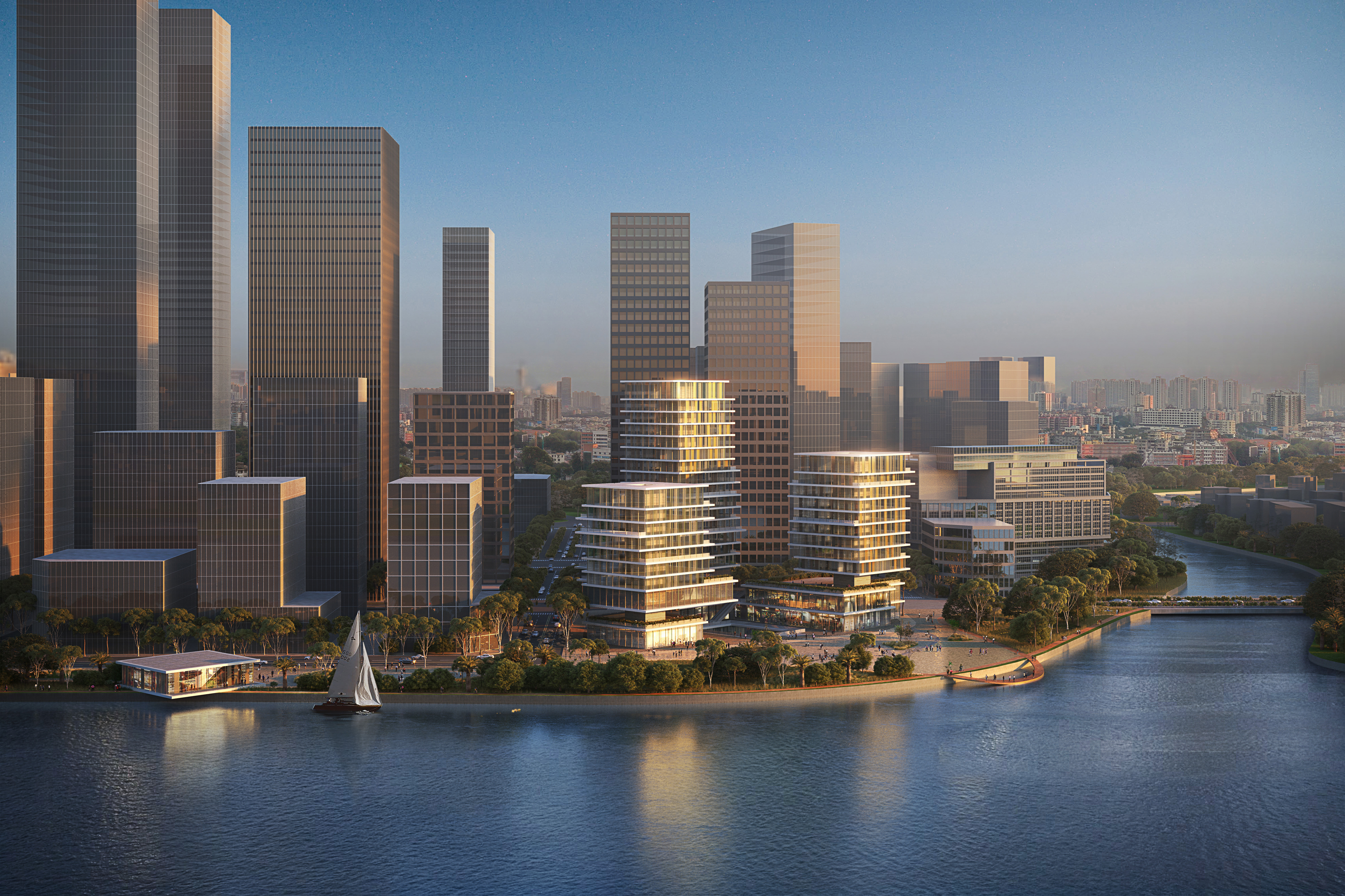 Located in Guangzhou, China, Camel Headquarters complex is envisioned as the entry point to the new development area connecting the Shamian Historical Area of Guangzhou to the newly planned Baietan Central Business Area. The project consists of three office towers and a commercial complex that houses the eponymous Camel apparel headquarters and flagship store. Positioned at the confluence point of the Huai and Zhujiang rivers, the project includes the landscape connecting to the river and forms an urban icon along the waterfront, welcoming the public into Guangzhou’s newest urban hub.